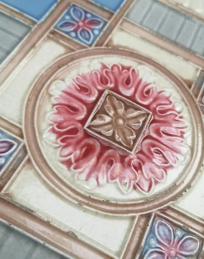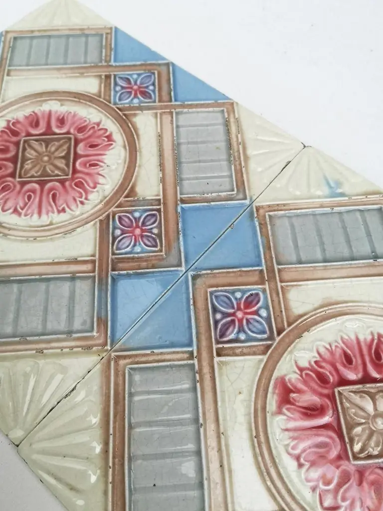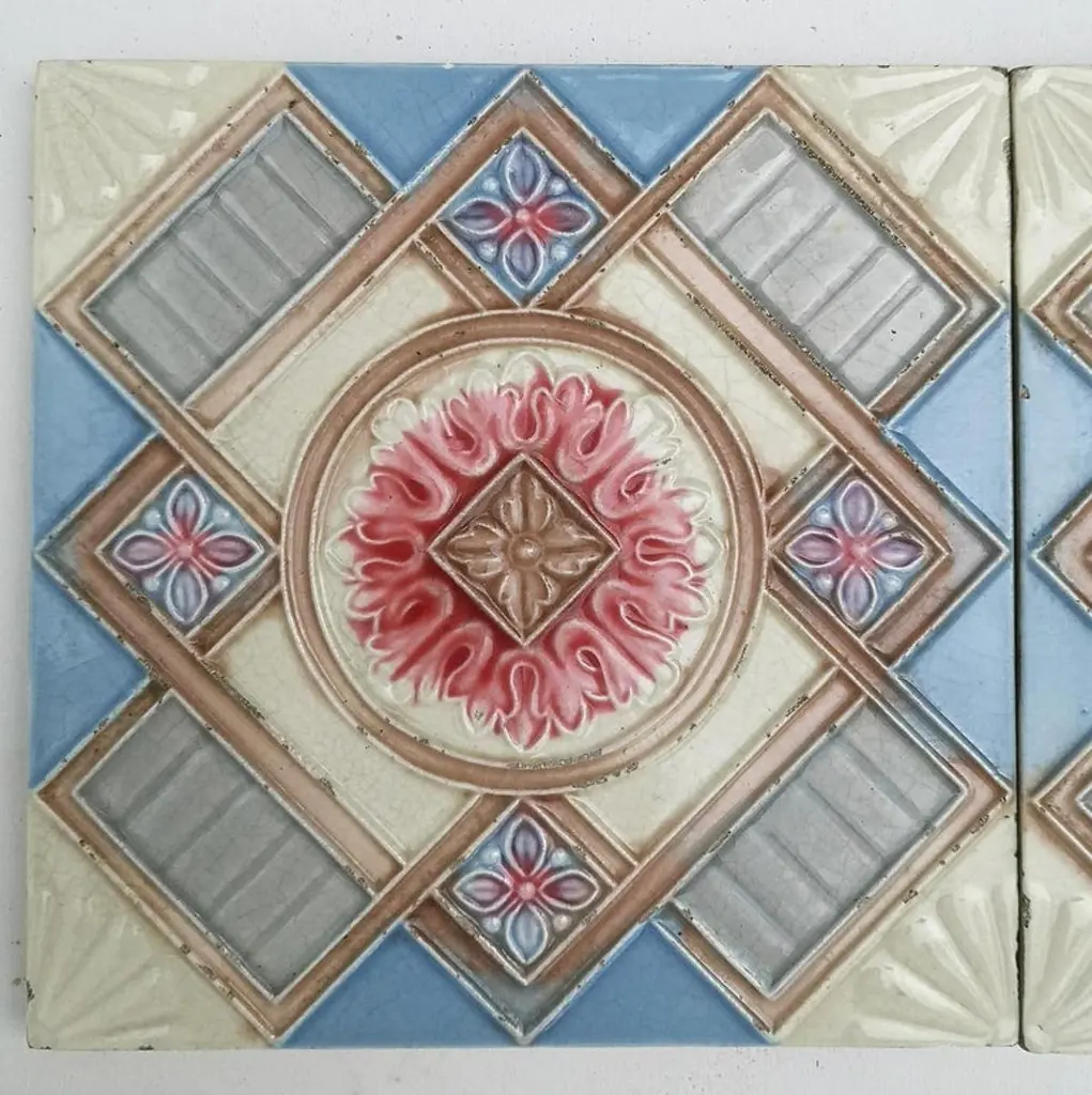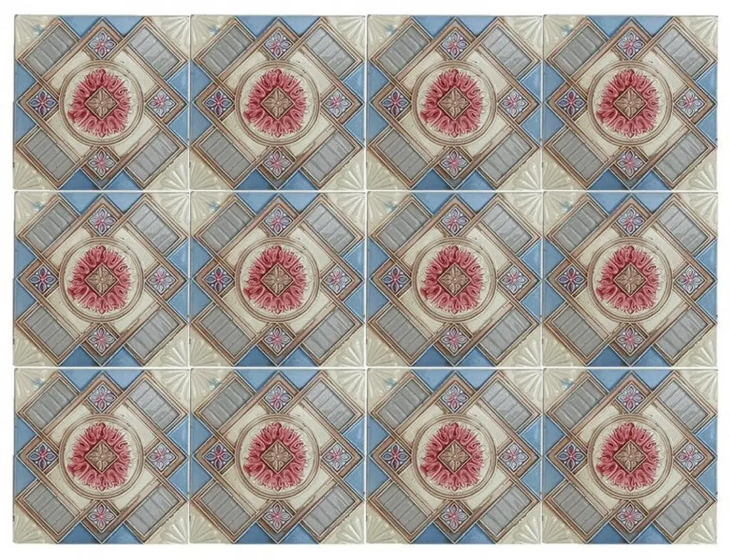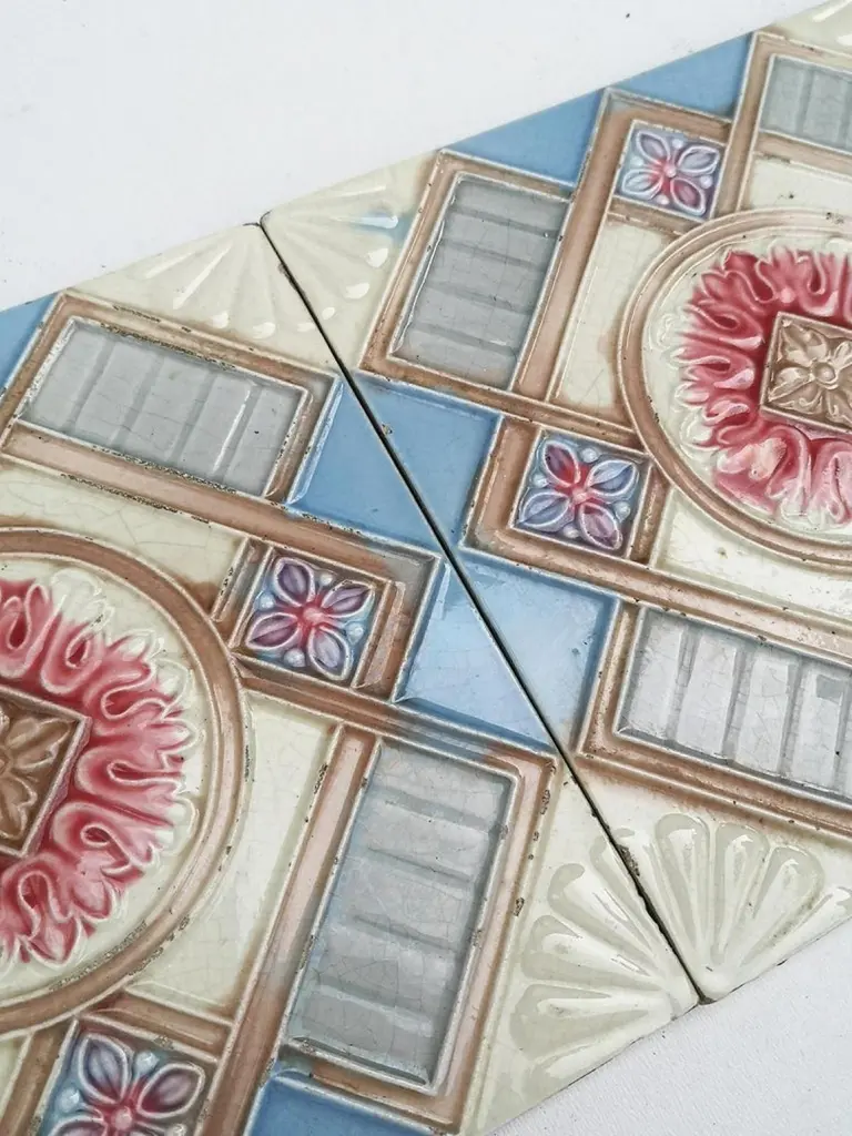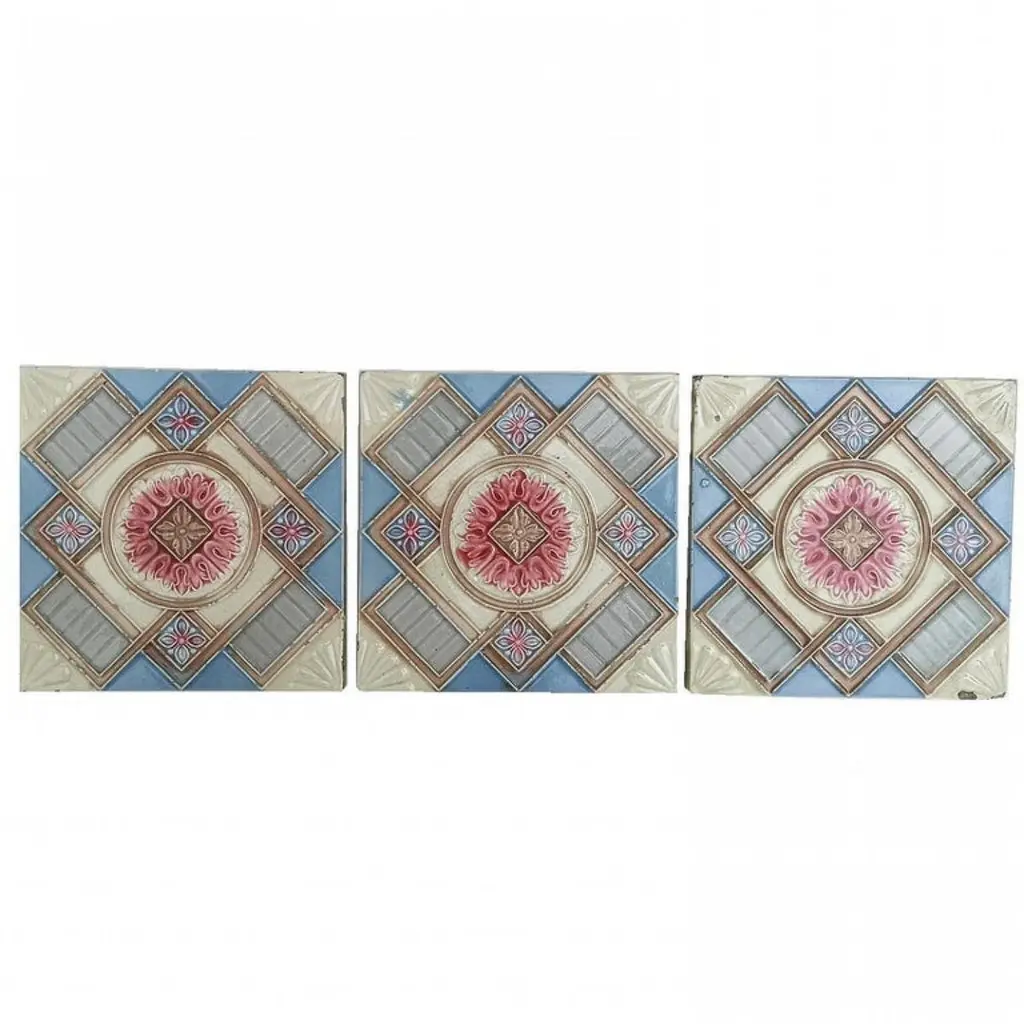 This is an amazing set of 13 antique Art Nouveau handmade tiles, S.A. Produits Céramiques de la Dyle in Wijgmaal, Belga).A beautiful relief and deep rich warm creme, sky blue, and grey color. These tiles would be charming displayed on easels, framed or incorporated into a custom tile design.xa0Please note that the price is for 1 piece.Size each tile: 6.06 inches (15.4 cm) width x 6.06 inches (15.4 cm) height x 0.4 inches (1 cm),Condition is generally very good. Minor chips, scuffs, color different and wear associated with age. A little crazing to the glaze is part of the design.There can be slight variations in each tile's size because of their age and craftsmanship.