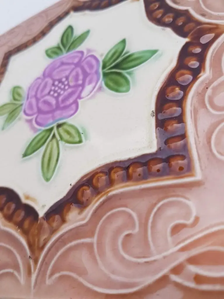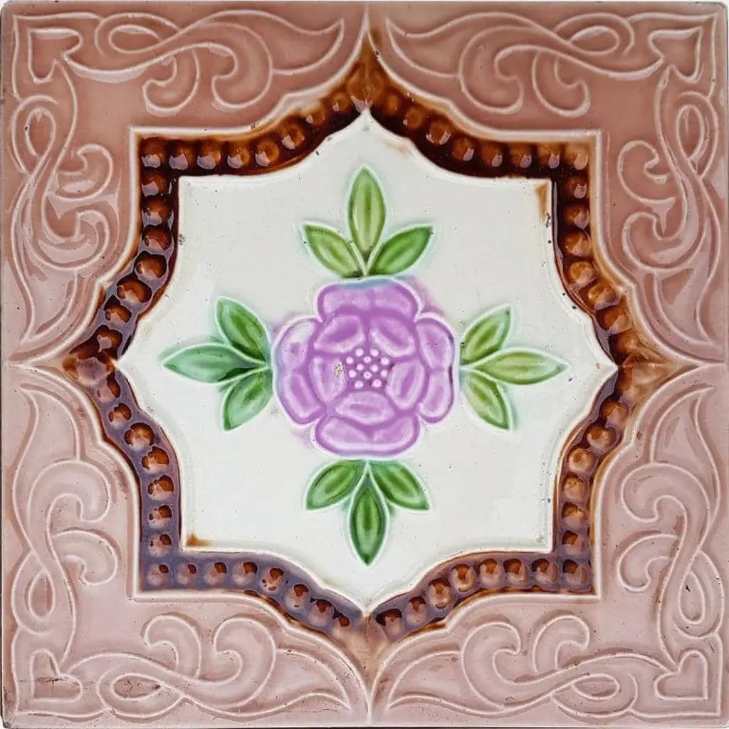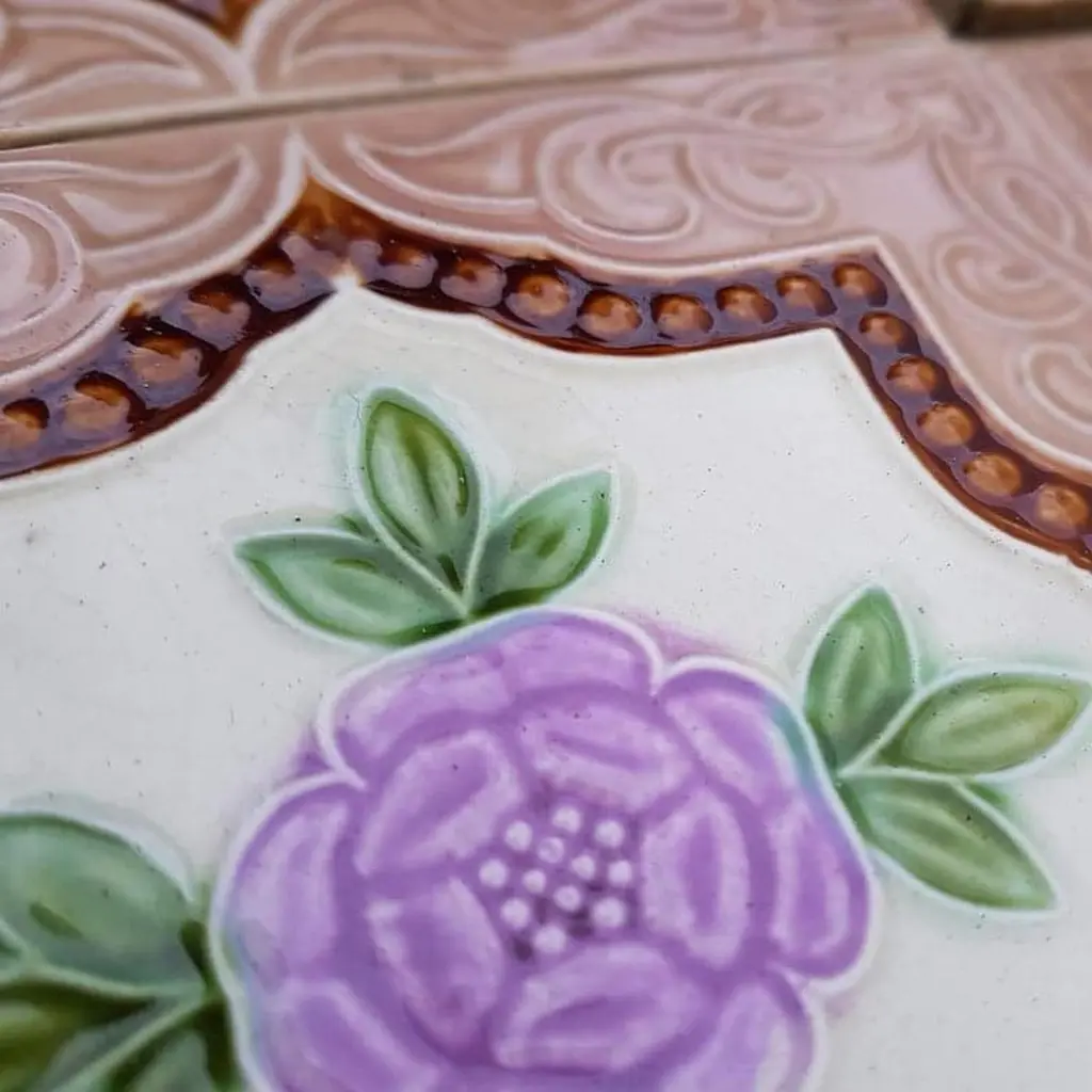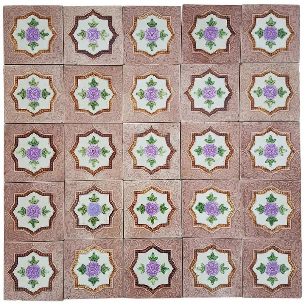 This is an amazing set of antique Art Deco handmade tiles. A beautiful relief and color. These tiles would be charming displayed on easels, framed or incorporated into a custom tile design.Please note that the price is for one piece. We sell them as set but also individually.Size each tile: 6.02 inches (15.3 cm) width x 6.02 inches (15.3 cm) height x 0.35 inches (0.9 cm),Condition is generally very good. Minor chips, scuffs, color different and wear associated with age. A little crazing to the glaze is part of the design.There can be slight variations in each tile's size because of their age and craftsmanship.