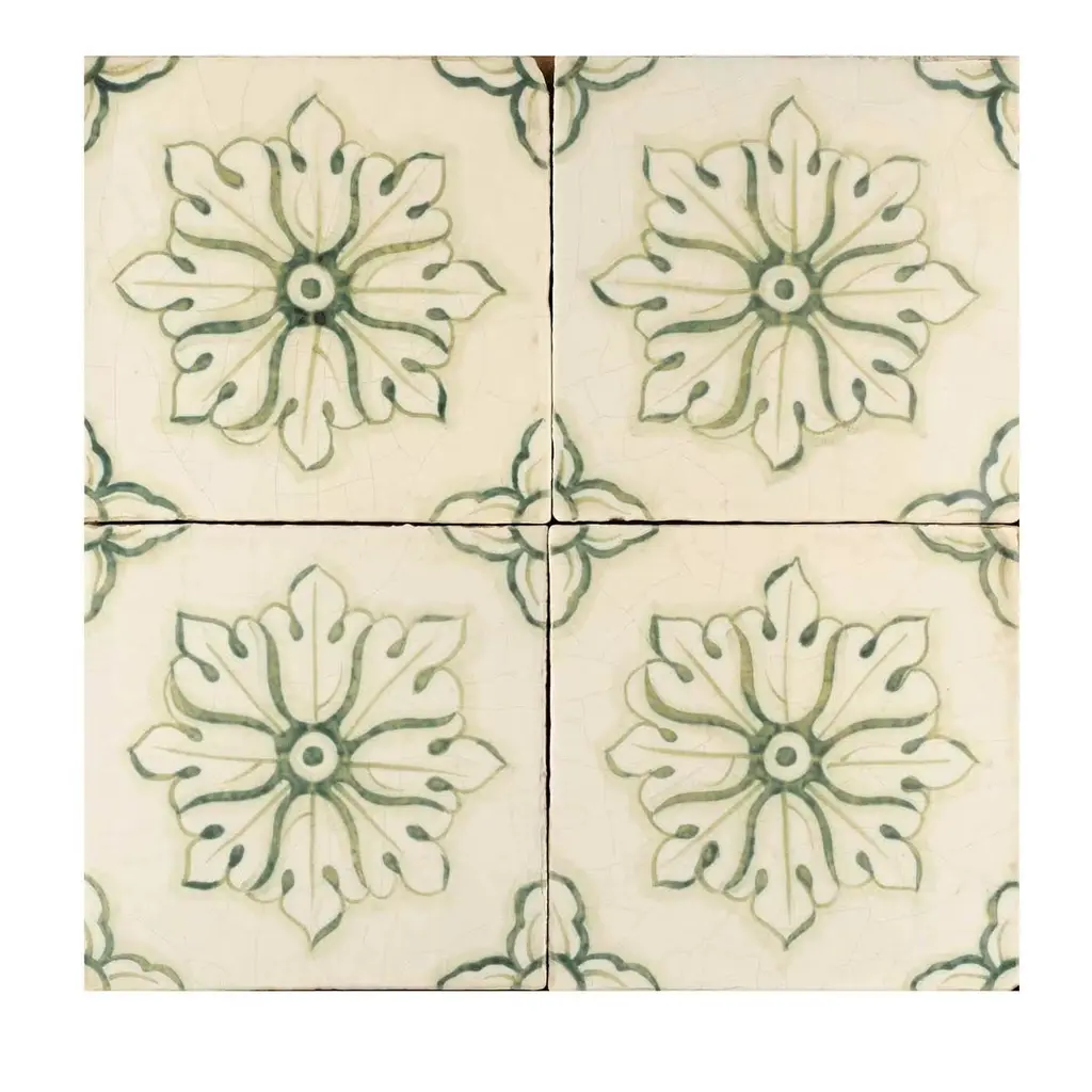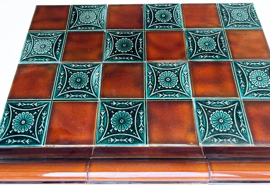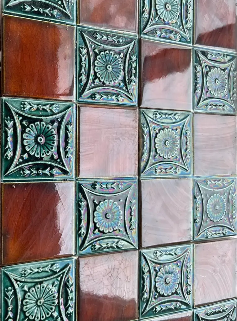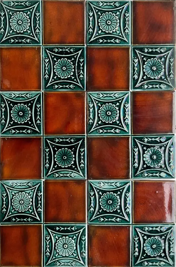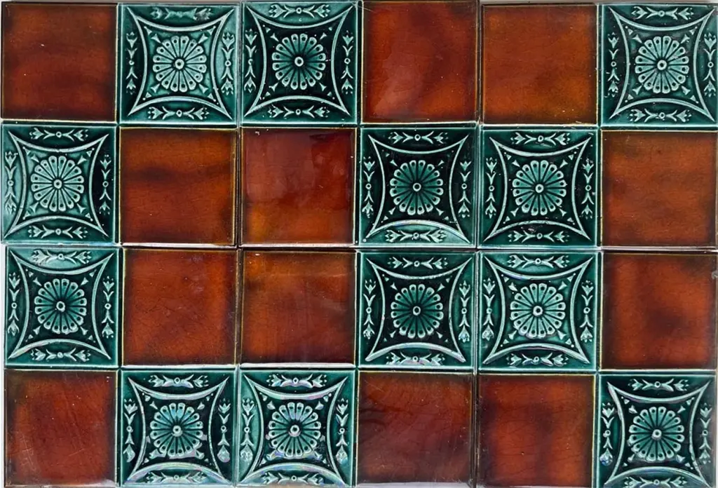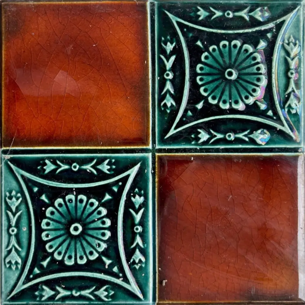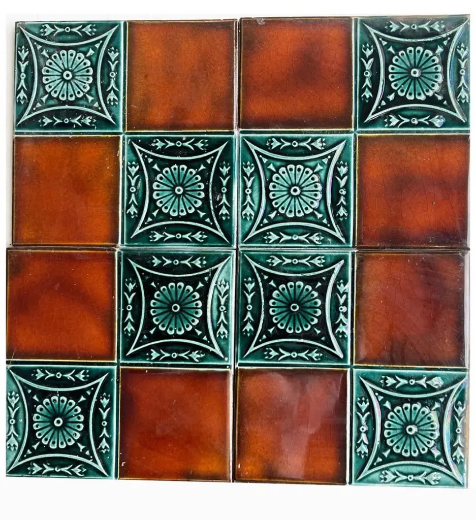1 of the 30 handmade antique tiles in rich brown and green glazed colors. Manufactured around 1920 by Gilliot Hemiksem, Belgium. One tile is divided in four squares, two brown and two relief green. These tiles would be charming displayed on easels, framed or incorporated into a custom tile design. We also offer boarder tiles that would suit the tiles perfectly. Please ask for possibilities.Please notice that the price is for one tile. We have 30 tiles available.Size each tile: 5.9 in (15 cm) width x 5.9 in (15 cm) height x 0.39 in (1 cm) thick.Condition is generally very good. Minor chips, scuffs and wear associated with age. Some crazing to the glaze is part of the design. There can be slight variations in each tile's size because of their age and craftsmanship.
