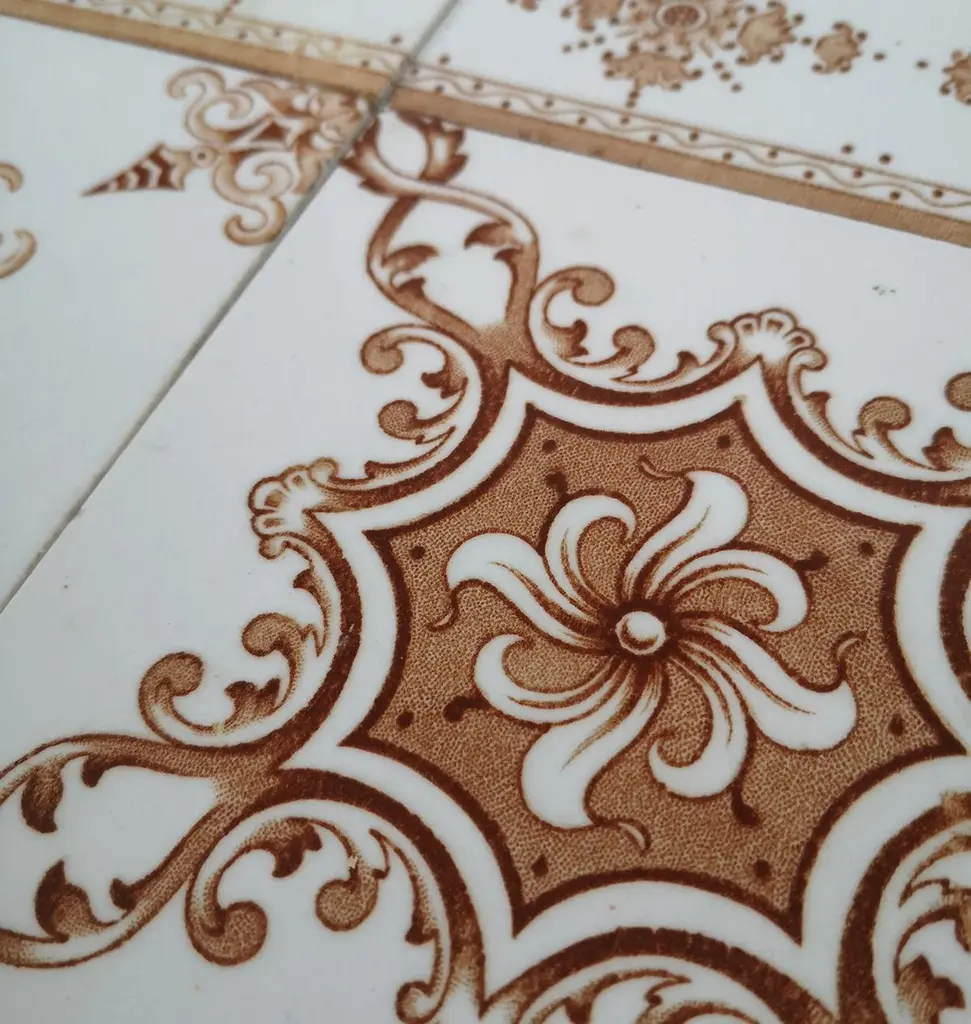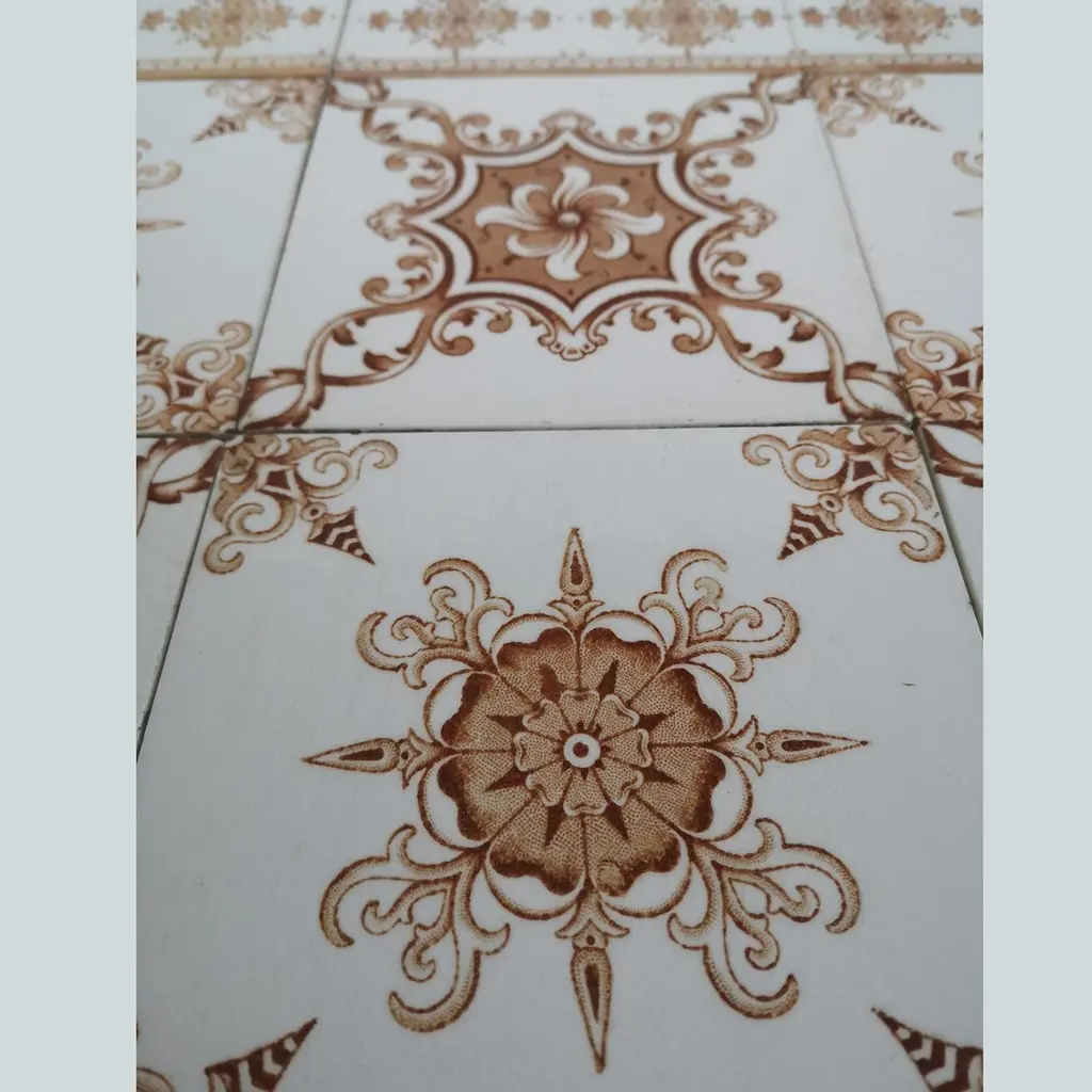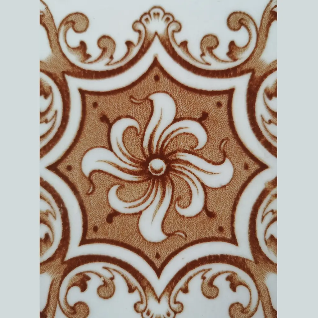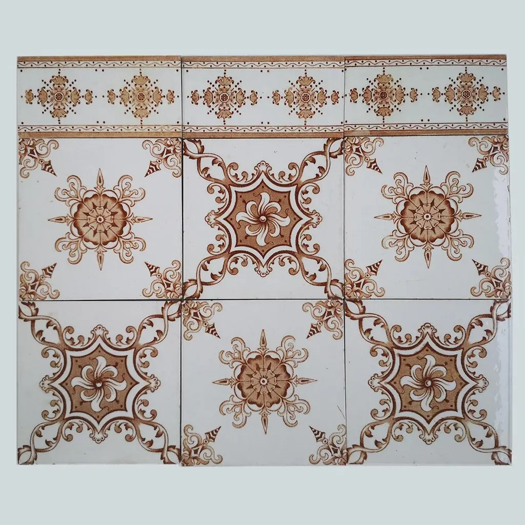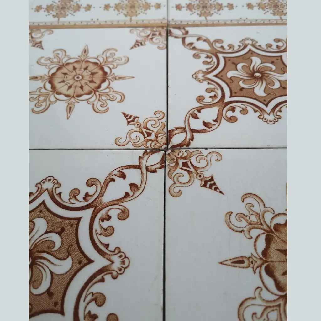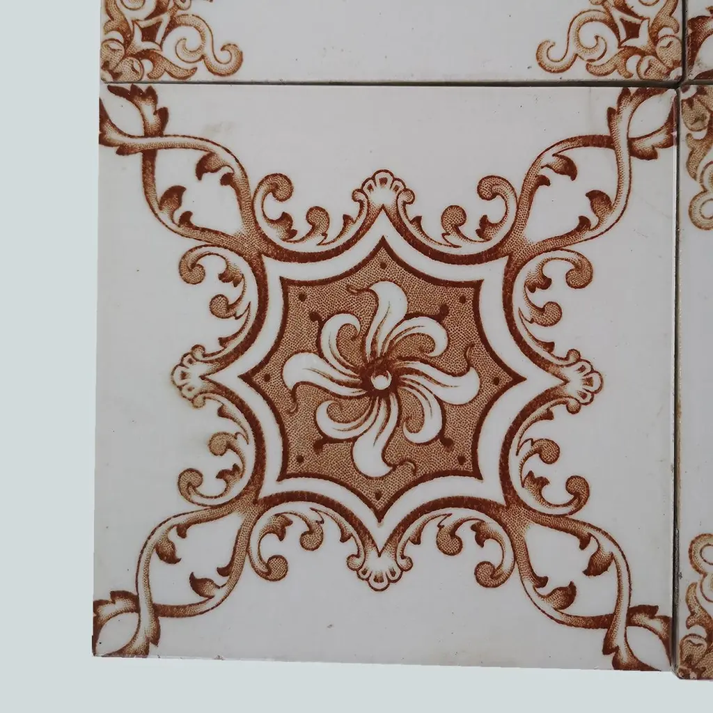 A large set of unique antique tiles, red brown colored with a beautiful Art Deco pattern, Societe Morialme circa 1920, Belgium The dimensions per tile are 5.9" (15 cm) x 5.9" (15 cm).Please note that the piece is for 1 piece! more pieces available. Also border tiles available (see last image). Feel free to contact us for more information.Condition is generally very good. Minor chips, scuffs, color different and wear associated with age. Some crazing to the glaze is part of the historical design.