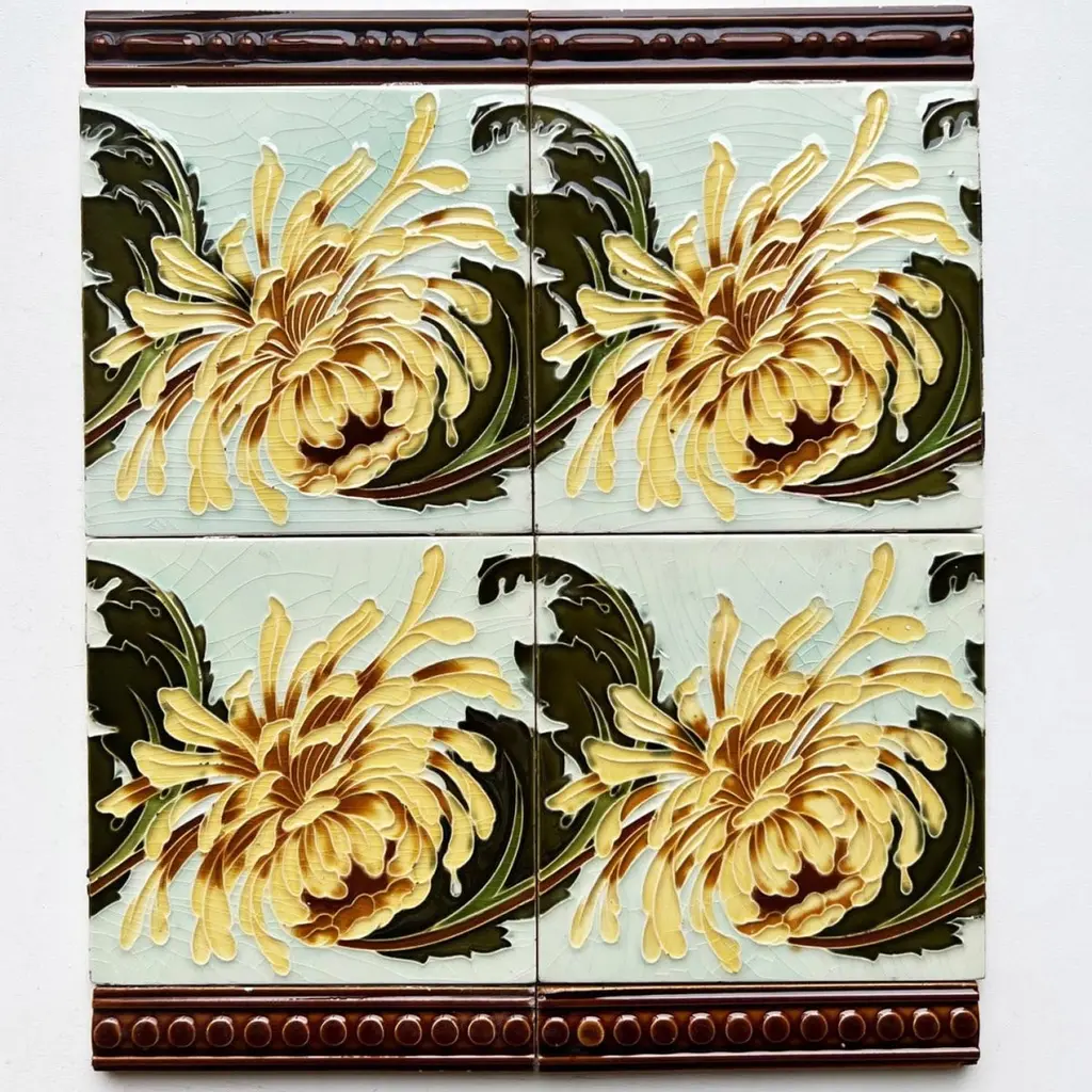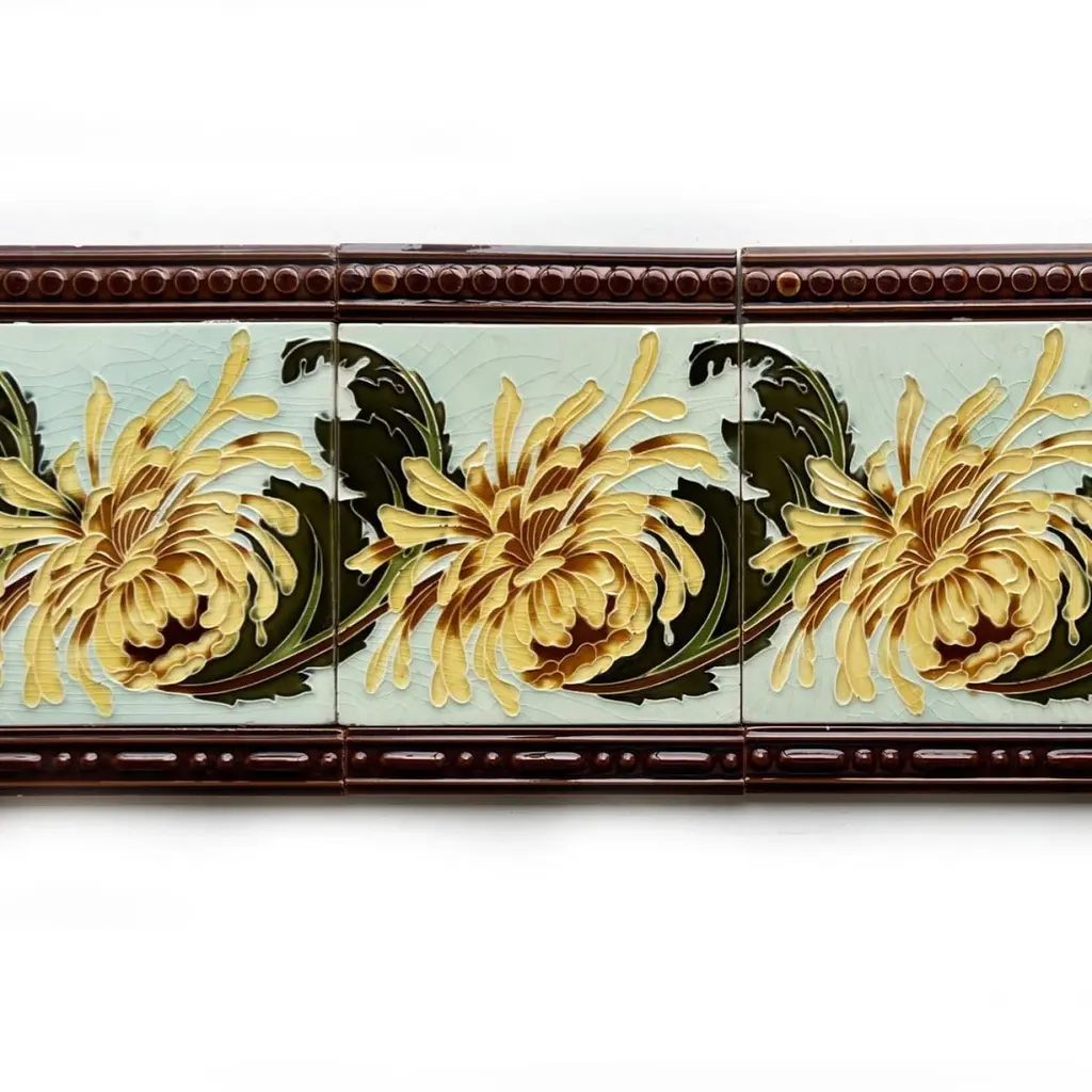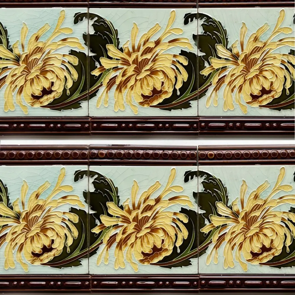 1 of the 60 Art Nouveau ceramic tiles by Gilliot Fabrieken Hemiksem, Belgium, circa 1930. Beautiful original antique tiles with a chrysanthemum in relief. The tile shows a soft yellow flower on a light background. We have matching decorative borders in different colors available. Please contact us for possibilities (brown border shown in images).The dimensions per tile are: 5.9 inch (15 cm) width x 5.9 inch (15 cm) height.Please note that the price is for 1 piece. 60 pieces available. With a total of 9,3 running meters.In very good condition. Minor chips, scuffs, color different and wear associated with age.