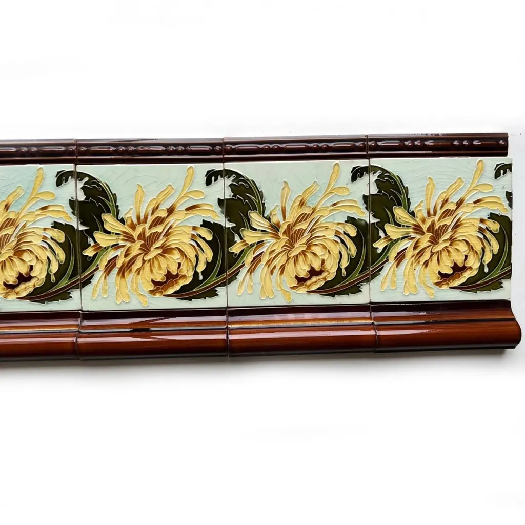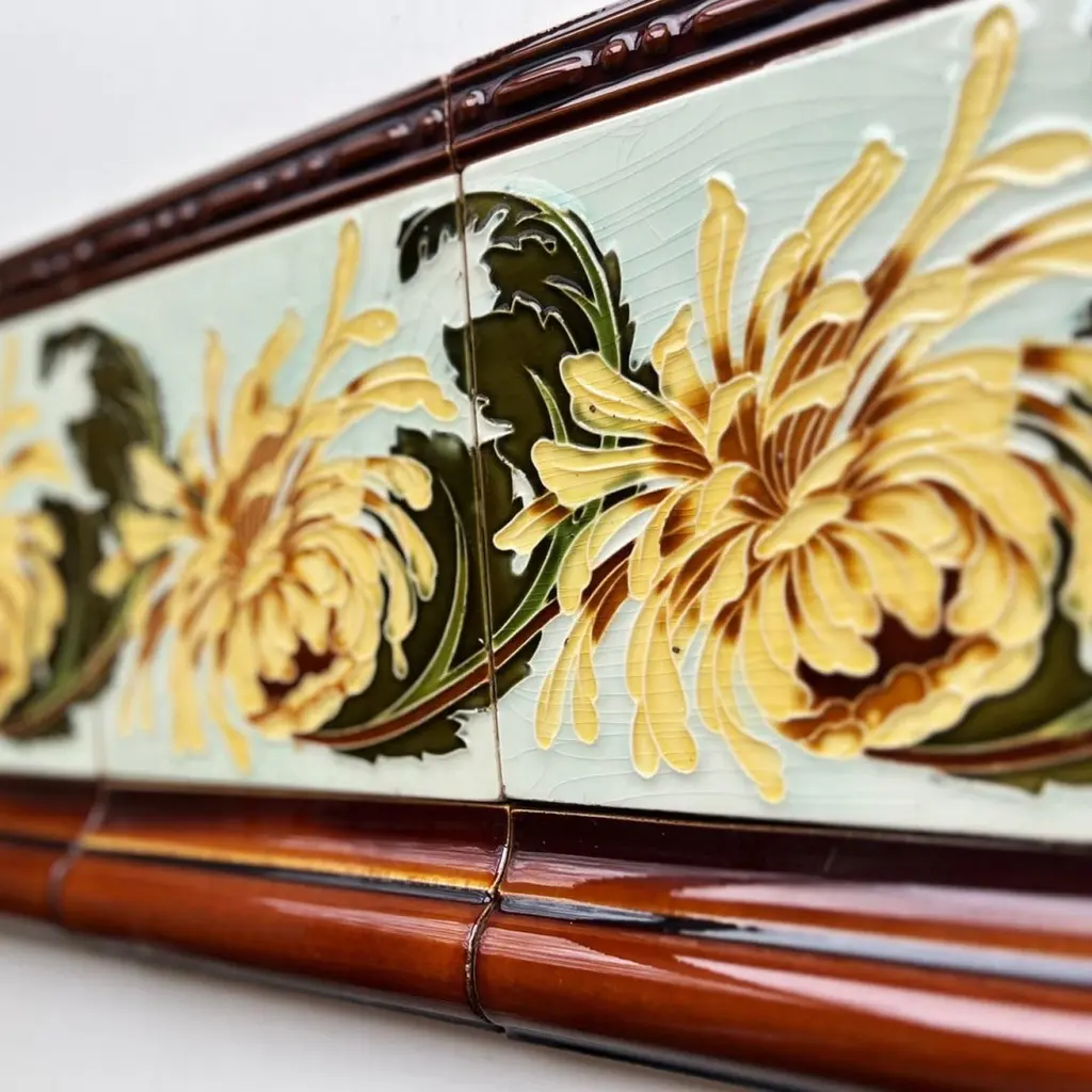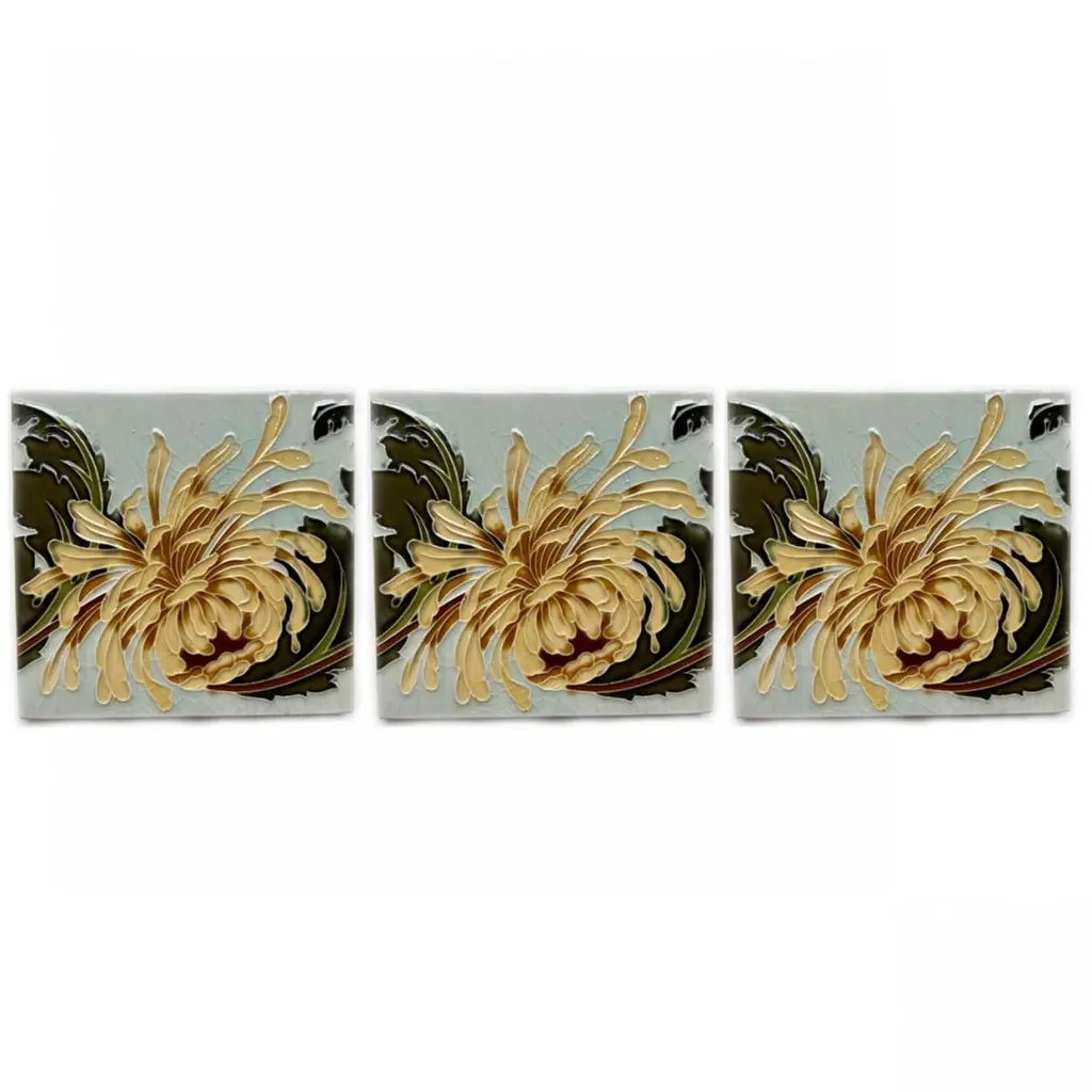 1 of the 60 Art Nouveau ceramic tiles by Gilliot Fabrieken Hemiksem, Belgium, circa 1930. Beautiful original antique tiles with a chrysanthemum in relief. The tile shows a soft yellow flower on a light background. We have matching decorative borders in different colors available. Please contact us for possibilities (brown border shown in images).The dimensions per tile are: 5.9 inch (15 cm) width x 5.9 inch (15 cm) height.Please note that the price is for 1 piece. 60 pieces available. With a total of 9,3 running meters.In very good condition. Minor chips, scuffs, color different and wear associated with age.