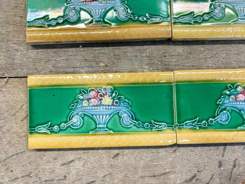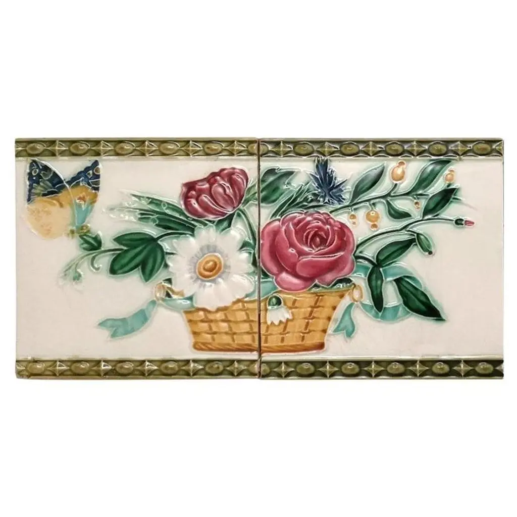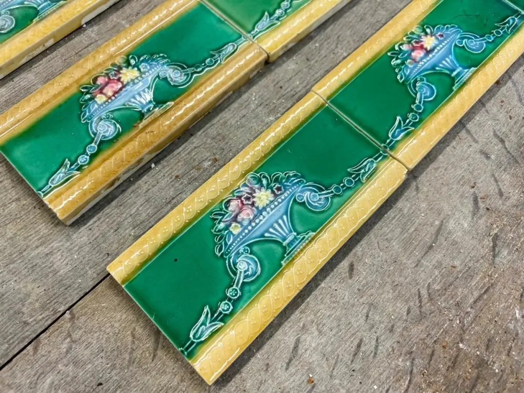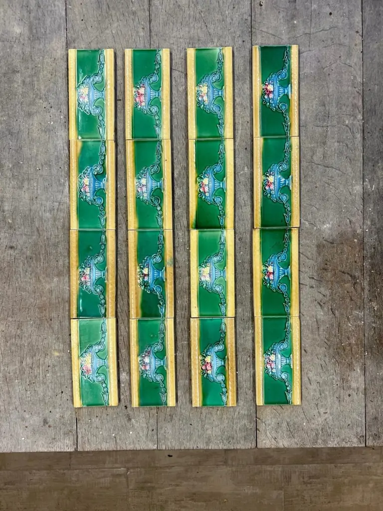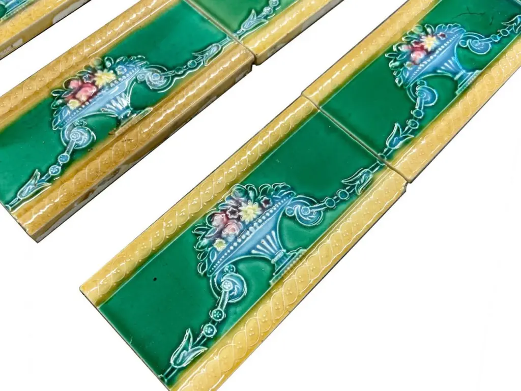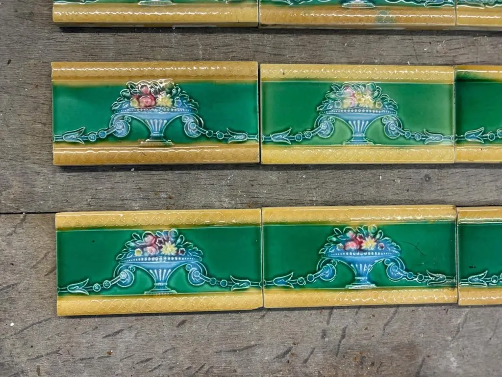 42 pcsof colorful wall tiles with image in relief. With the image of a vase with flowers in beautiful vibrant colors.Dimension per tile: 3" (7,5cm) x 6" (15cm). With a total length 6.30 lineair meters.Please note that the piece is for one piece. 42 pieces available.Condition is generally very good. Minor chips, scuffs, color different and wear associated with age. Some crazing to the glaze is part of the historical design.