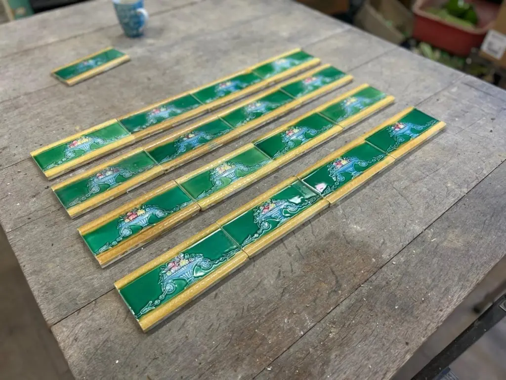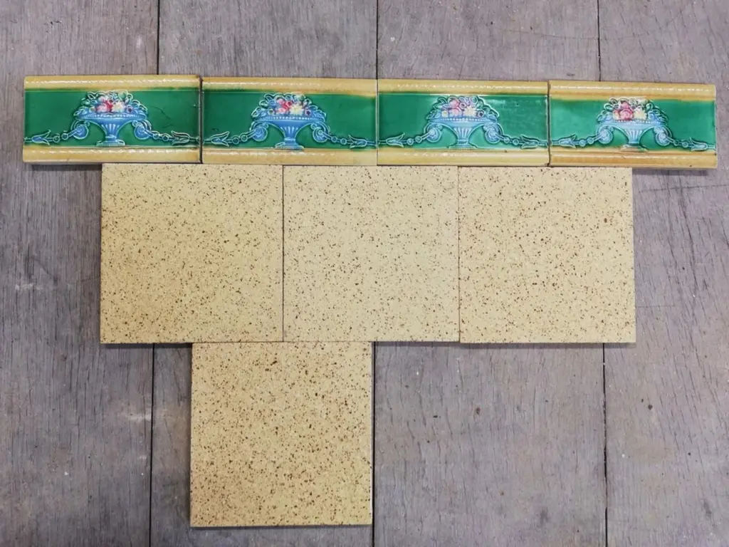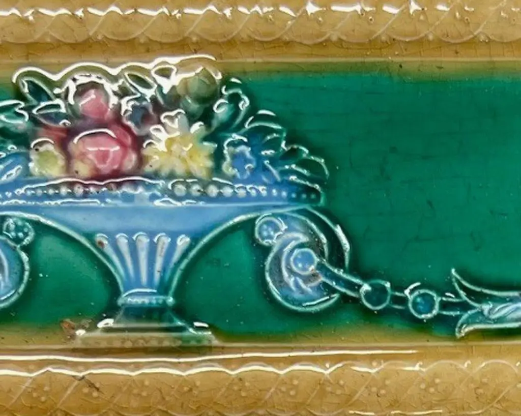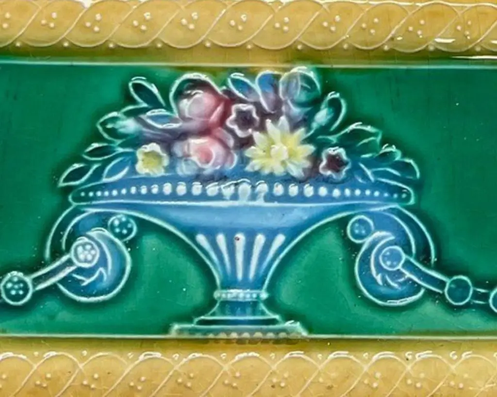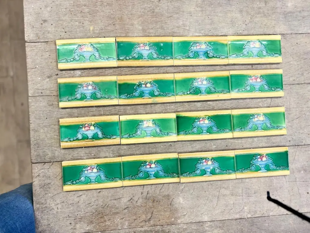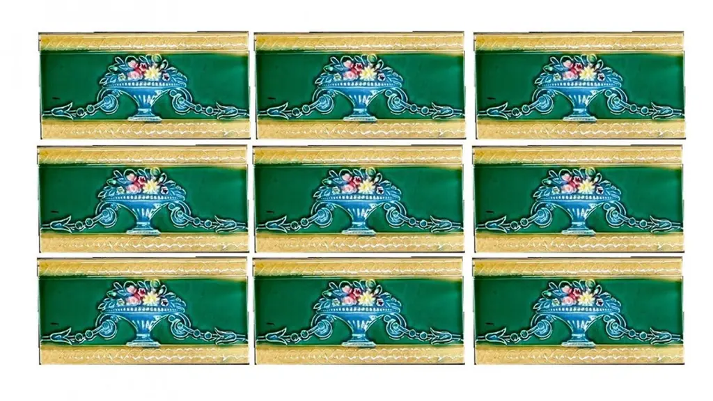 42 pcsof colorful wall tiles with image in relief. With the image of a vase with flowers in beautiful vibrant colors.Dimension per tile: 3" (7,5cm) x 6" (15cm). With a total length 6.30 lineair meters.Please note that the piece is for one piece. 42 pieces available.Condition is generally very good. Minor chips, scuffs, color different and wear associated with age. Some crazing to the glaze is part of the historical design.