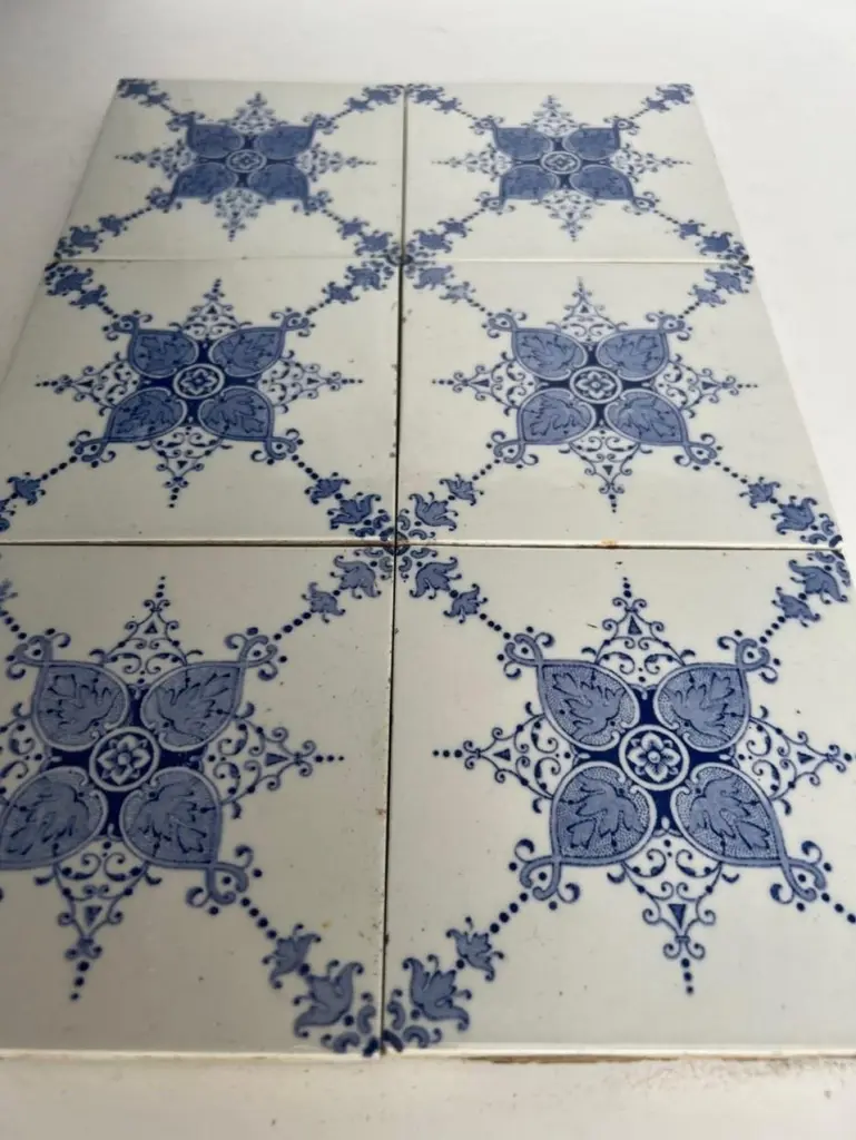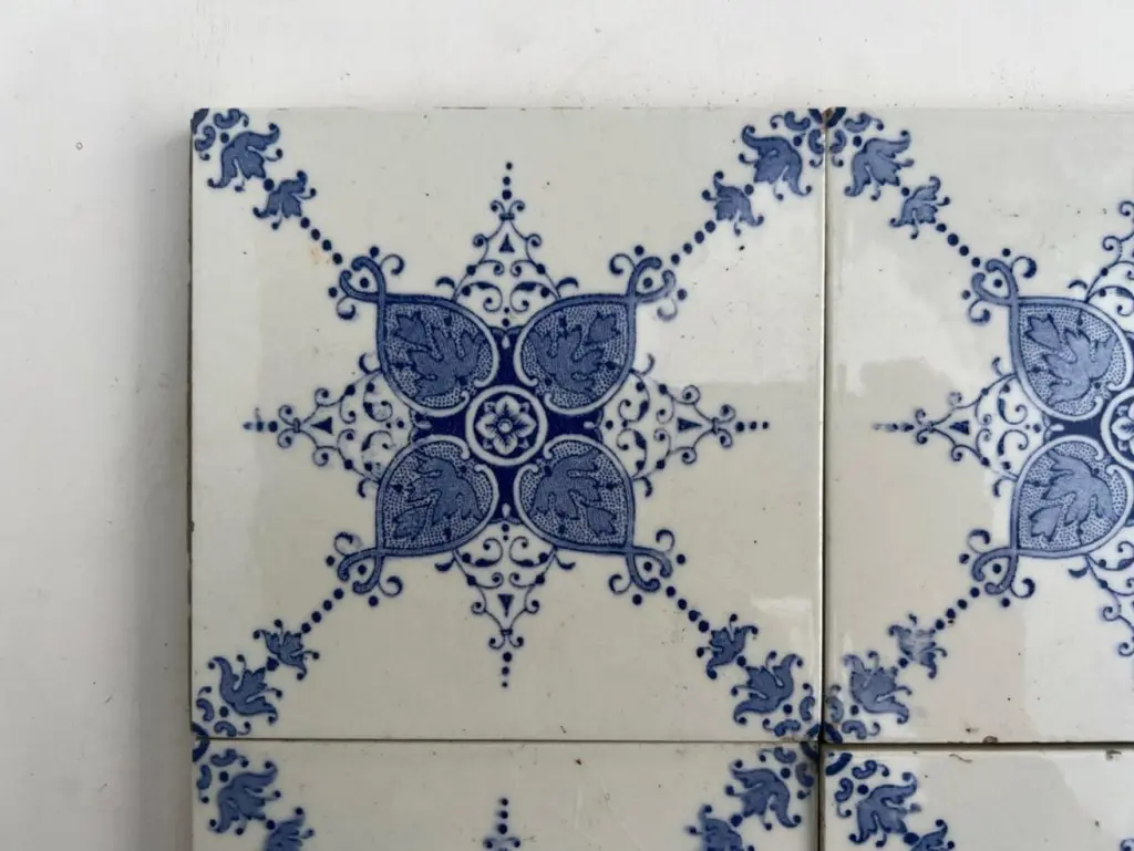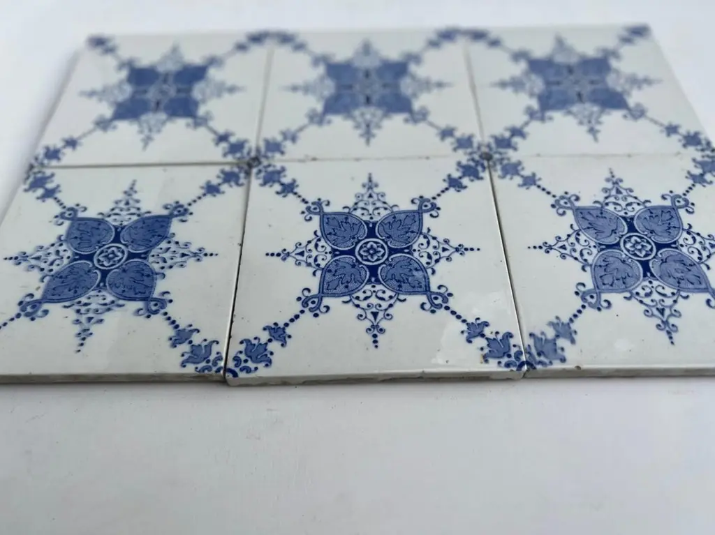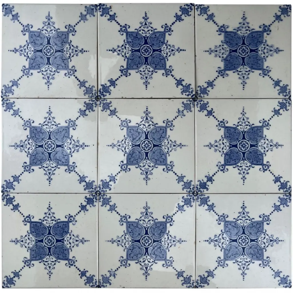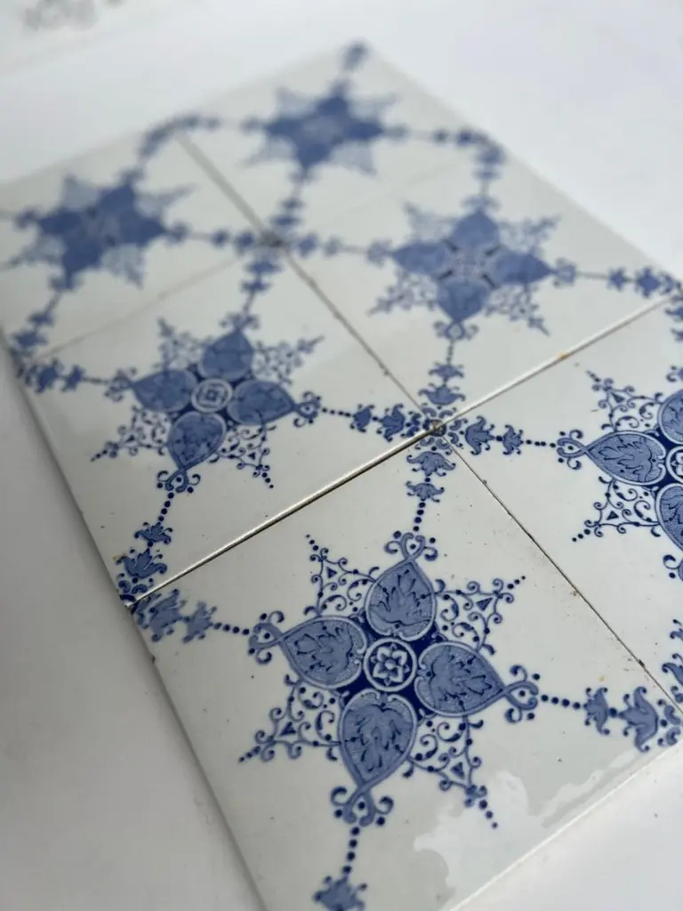 Handmade tiles in white and blue glazed color. With a beautiful fine star-like illustration . Manufactured around 1920 by Le Glaive, Belgium.These tiles would be charming displayed on easels, framed or incorporated into a custom tile design.The dimensions per tile are 4,7 inch (12 cm) × 4,7 inch (12 cm).Please note that the piece is for one piece! We have 130 tiles available.Condition is generally very good. Minor chips, scuffs, color different and wear associated with age. Some crazing to the glaze is part of the historical design.There can be slight variations in each tile's size because of their age and craftsmanship.