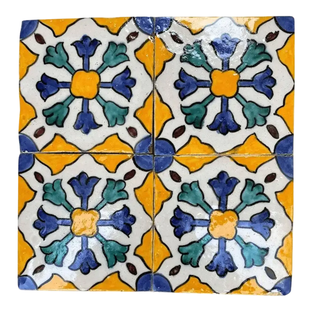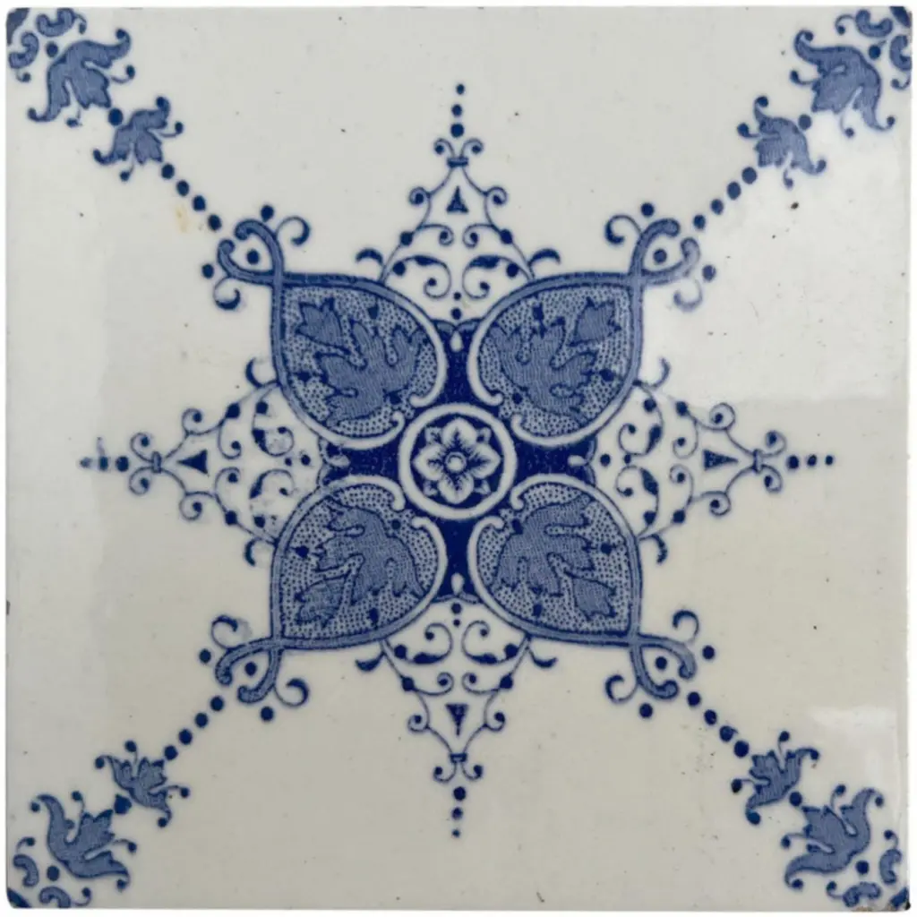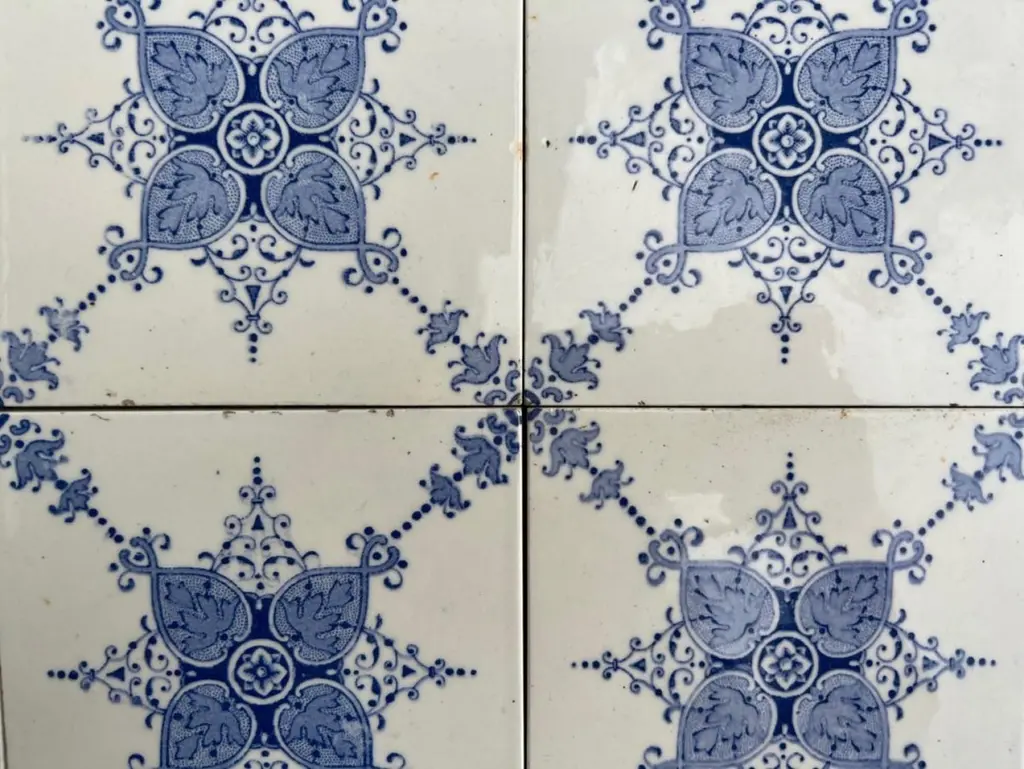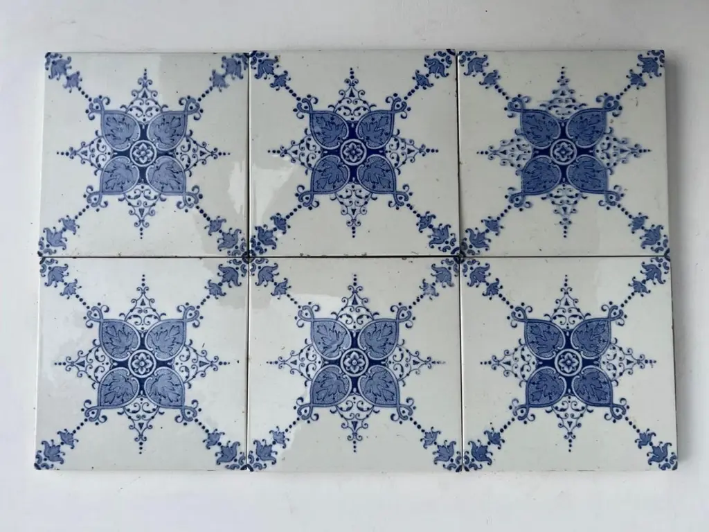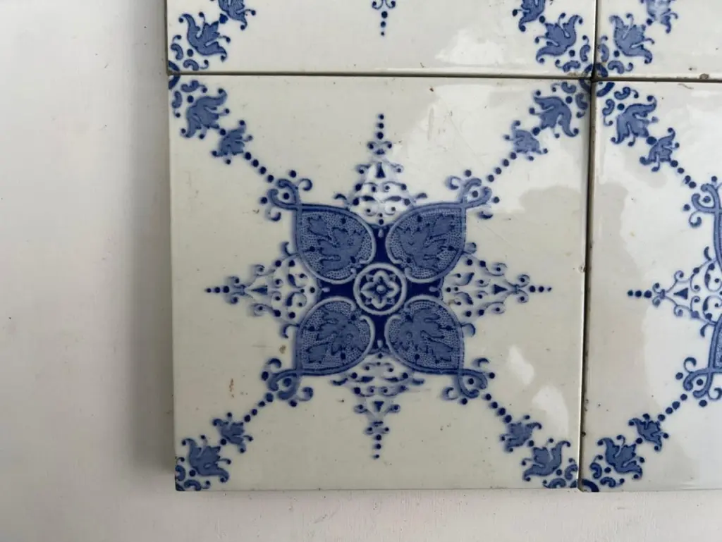 Handmade tiles in white and blue glazed color. With a beautiful fine star-like illustration . Manufactured around 1920 by Le Glaive, Belgium.These tiles would be charming displayed on easels, framed or incorporated into a custom tile design.The dimensions per tile are 4,7 inch (12 cm) × 4,7 inch (12 cm).Please note that the piece is for one piece! We have 130 tiles available.Condition is generally very good. Minor chips, scuffs, color different and wear associated with age. Some crazing to the glaze is part of the historical design.There can be slight variations in each tile's size because of their age and craftsmanship.