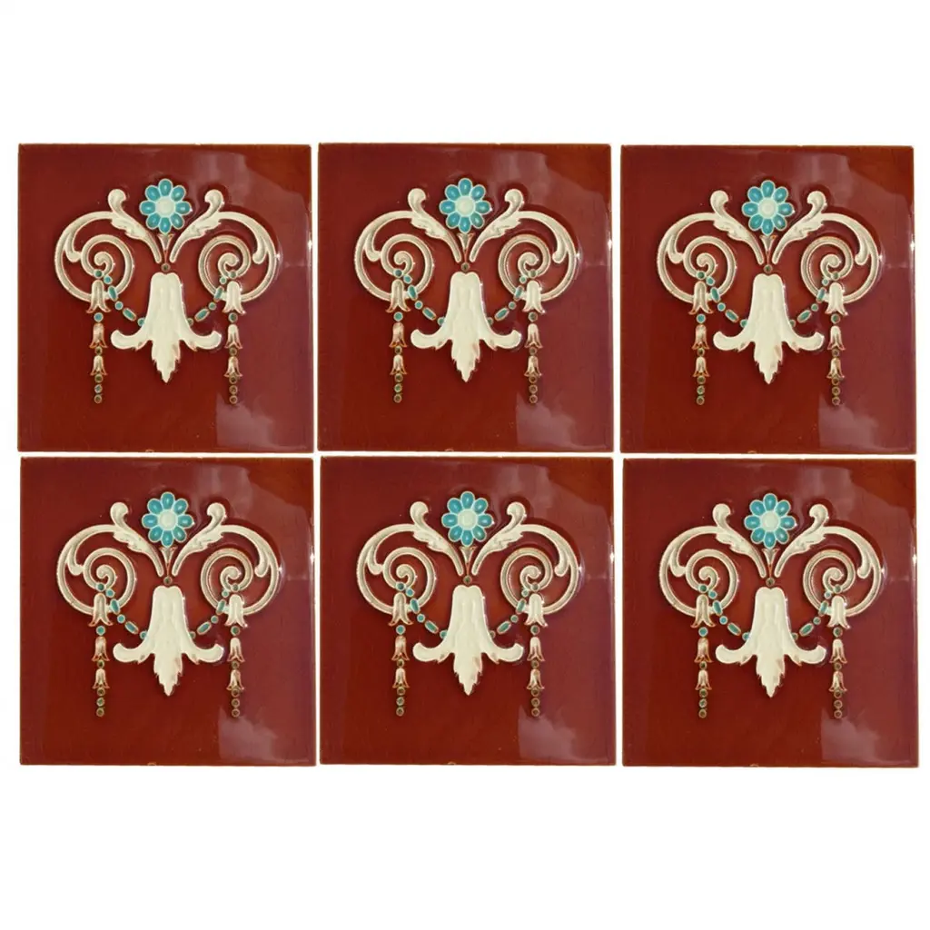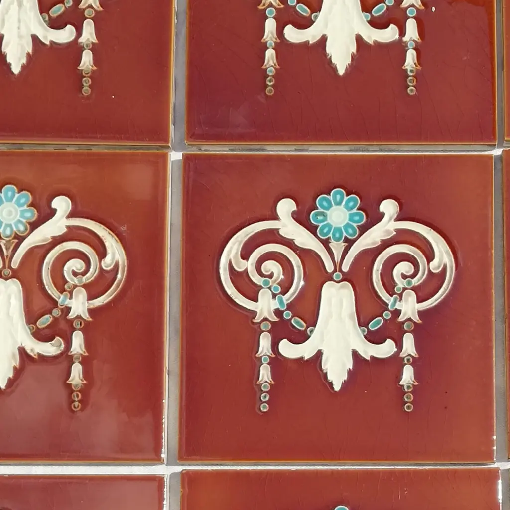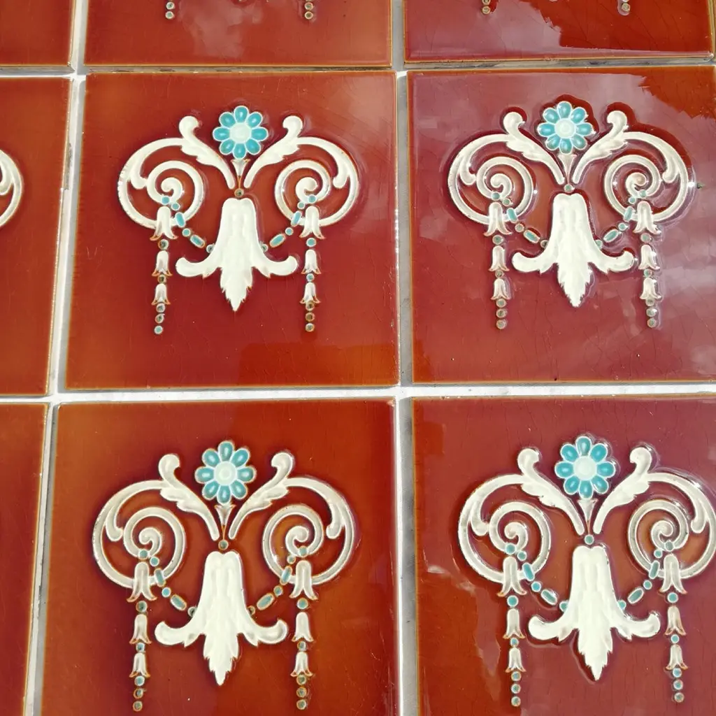 1 of the 67 handmade antique tiles in rich brown and blue creme glazed colors. Manufactured around 1920 by Gilliot Hemiksem, Belgium. These tiles would be charming displayed on easels, framed or incorporated into a custom tile design. We also offer boarder tiles that would suit the tiles perfectly. Please ask for possibilities.Please notice that the price is for one tile. We have 67 tiles available.Size each tile: 5.98 in (15,2 cm) width x 5.98 in (15,2 cm) height x 0.39 in (1 cm) thick.Condition is generally very good. Minor chips, scuffs and wear associated with age. Some crazing to the glaze is part of the design. There can be slight variations in each tile's size because of their age and craftsmanship.