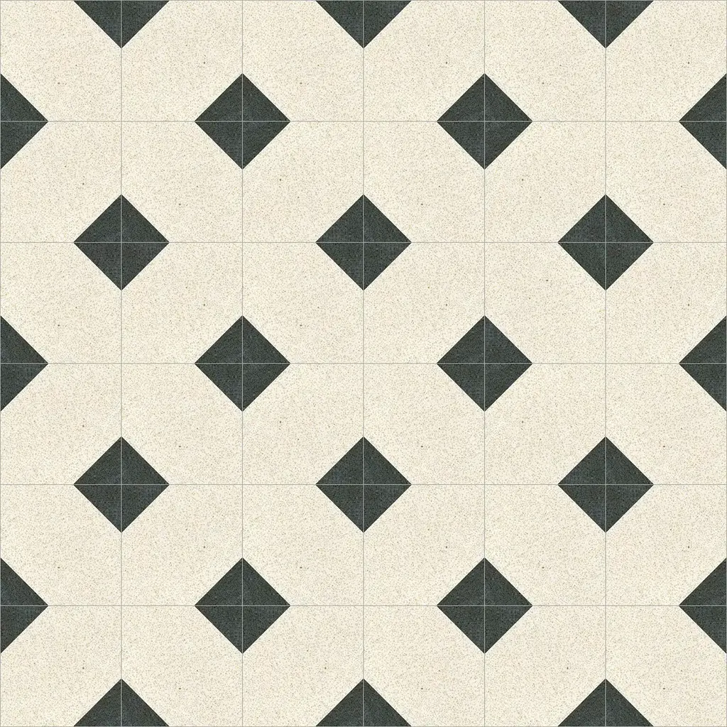A timeless and versatile design that will effortlessly adorn any modern or traditional decor, this set of 25 terrazzo tiles is named after the Italian expression for "2 corners", inspired by the black and white checkered composition that graces each piece. Minutely decorated by hand, each piece is crafted in Sicily with a blend of natural raw materials such as cement, marble chips, and volcanic sand from Etna.