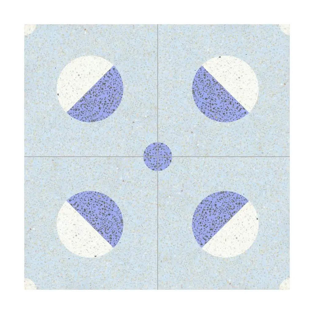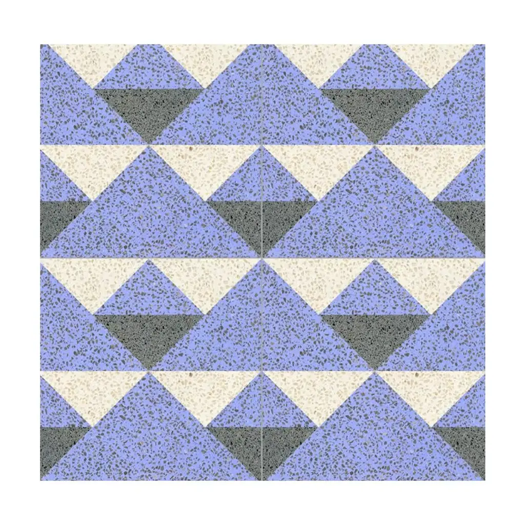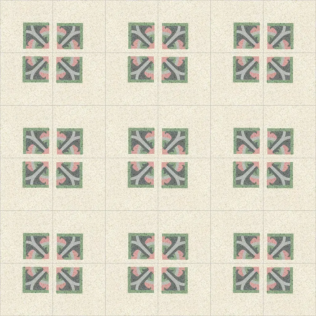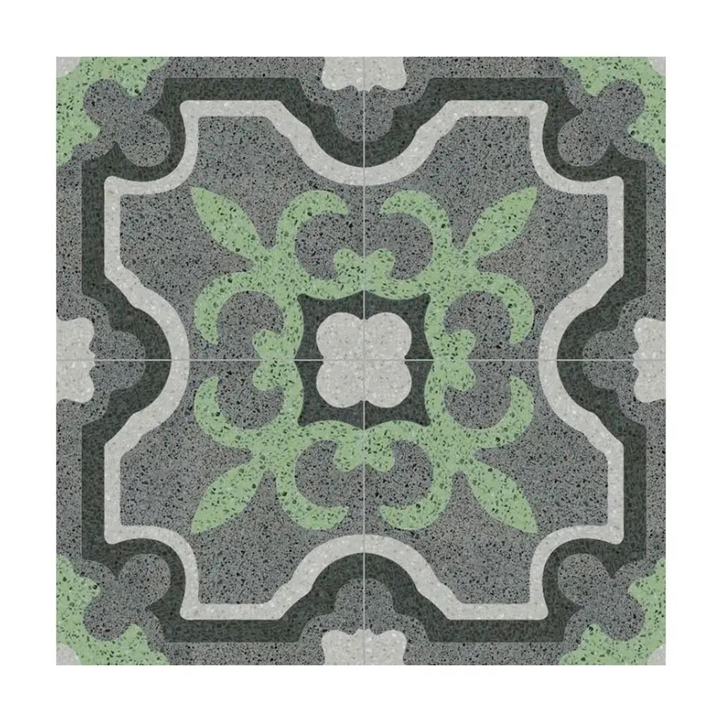 A meticulous blend of natural raw materials such as cement, marble chips, and volcanic sand from Etna, this set of 25 terrazzo tiles is a deft showcase of craftsmanship. Handmade in Romano's Sicilian workshop following traditional techniques, each tile is hand-decorated showcasing a geometric motif of green, gray, and antique pink squared shapes juxtaposed to a pearl-white backdrop.