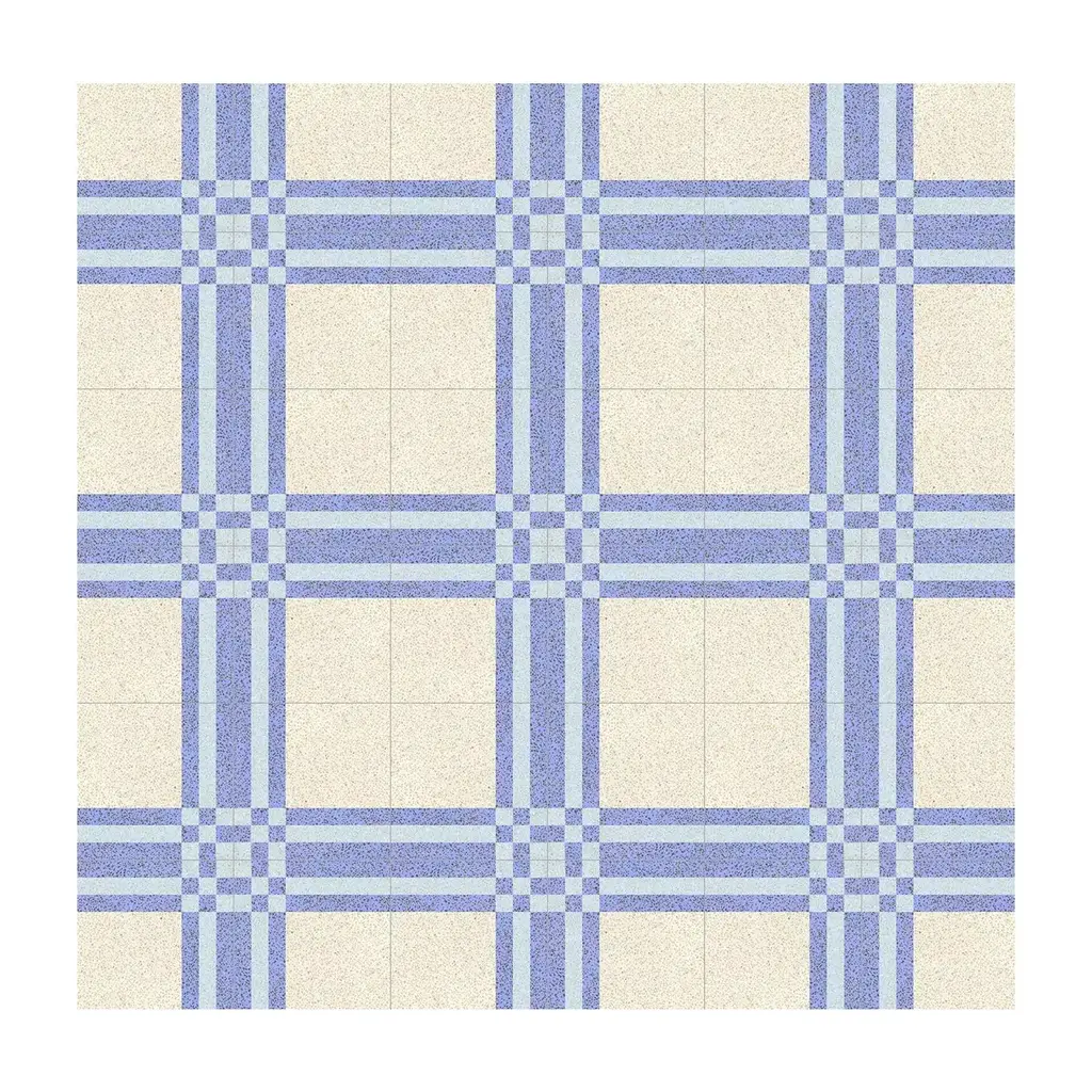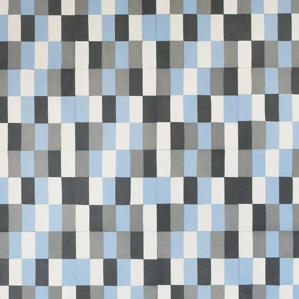 Masterfully handcrafted in Sicily using traditional methods and a blend of natural raw materials such as cement, marble sand, and Etna's lava sand, this set of 25 cement tiles offers an elegant and infinite possibility of combinations to complement any room's walls and floors. Bold and captivating, it features a checked pattern marked by light blue, white, gray, and green colors.