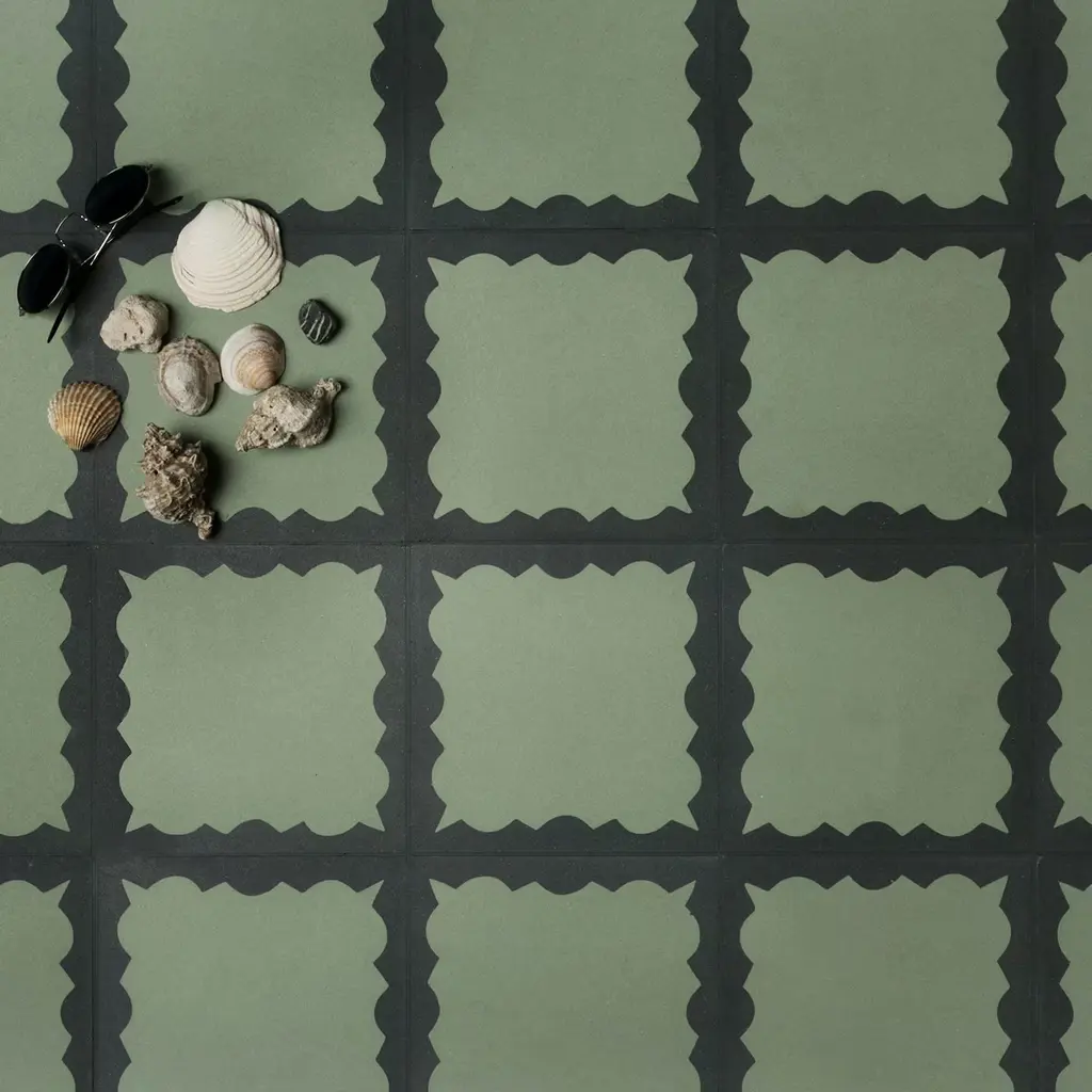 This set of 25 cement tiles boasts a timeless and versatile flair that will suit any style of decor. Marked by a light green hue, it is characterized by a dark green checked motif of waved lines, the tiles' clean and essential design is meticulously handcrafted of a blend of natural raw materials such as cement, marble sand, and Etna's lava sand, using traditional, Sicilian crafting method.