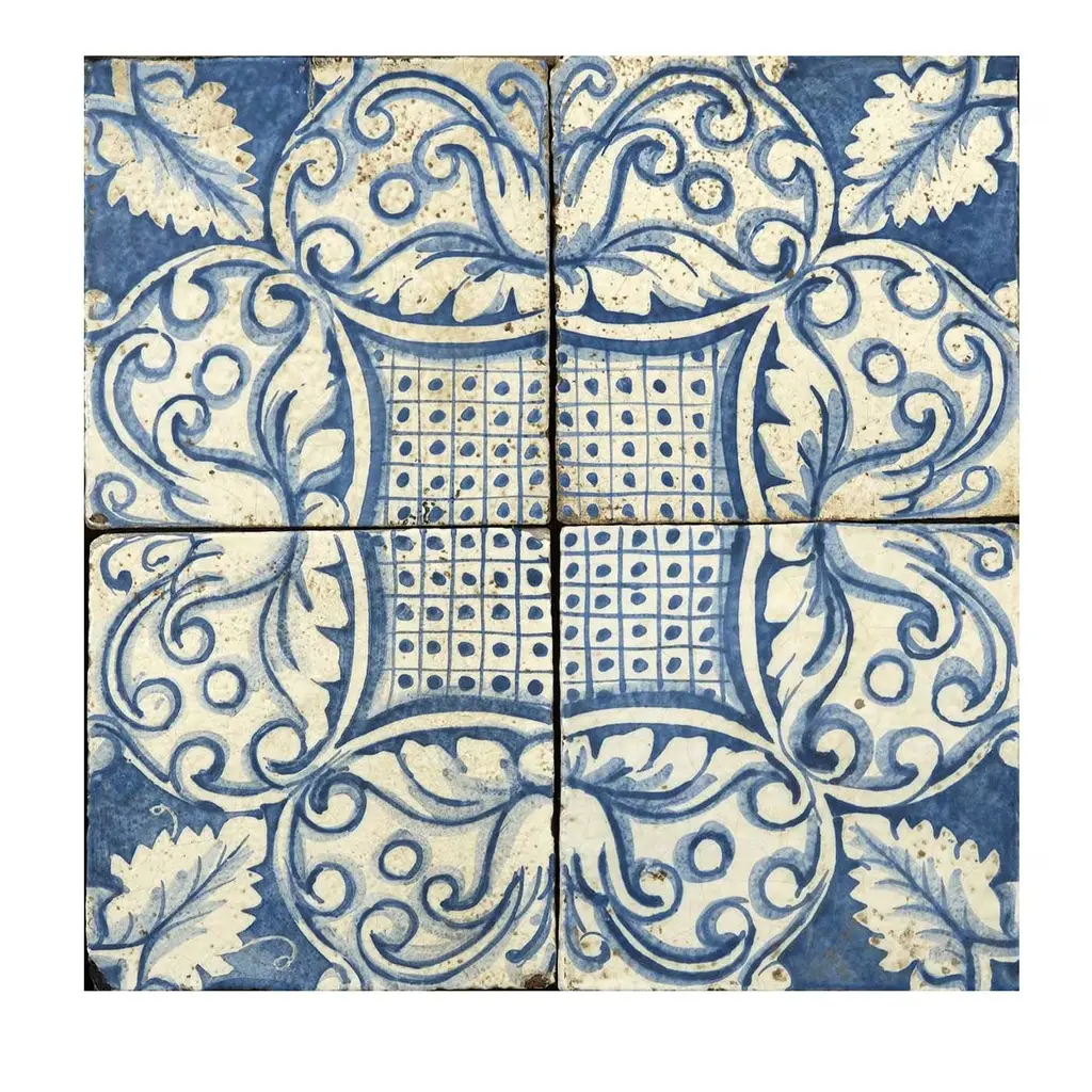 Timeless elegance and masterful attention to detail are the hallmarks of this set of sophisticated majolica tiles from the Classici Collection. The handmade tiles, crafted of terracotta mixed with ground volcanic stone, boast an intricate frond-like design that is revealed in four tiles. Drawing from Moorish artistic influence, the decorative design features canary-yellow fronds outlined in bright blue with matching swirls set on an ivory background. Entirely hand-painted and glazed, these tiles are best showcased either inside as a kitchen countertop or outside on a patio or deck.