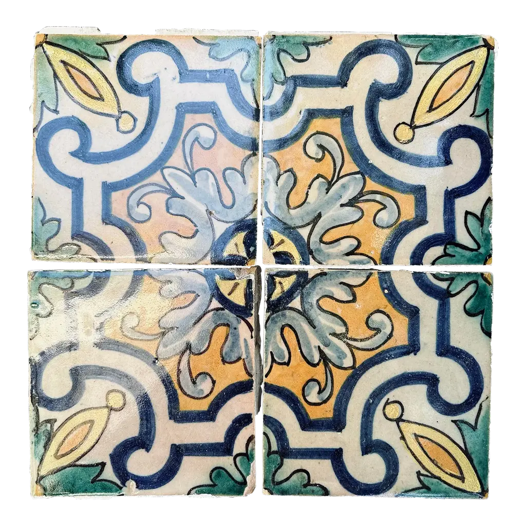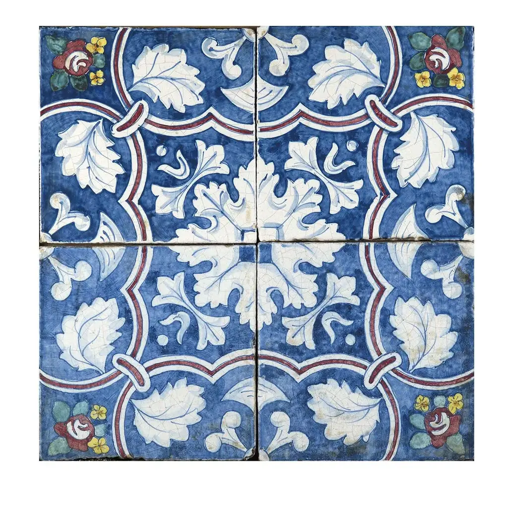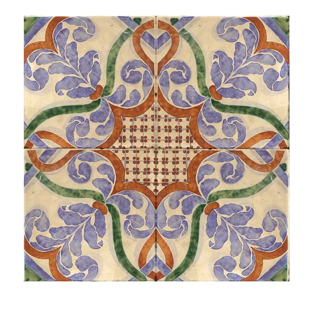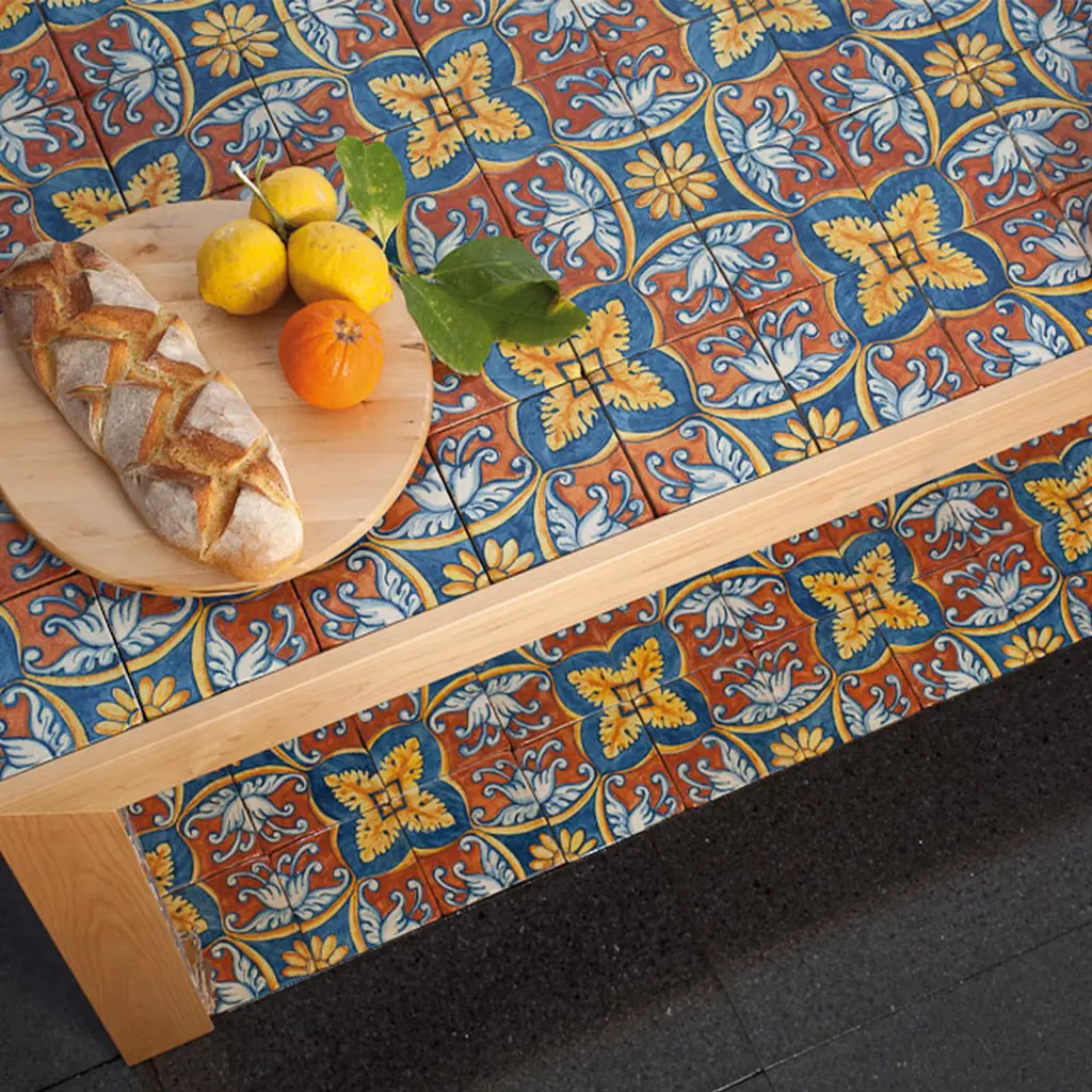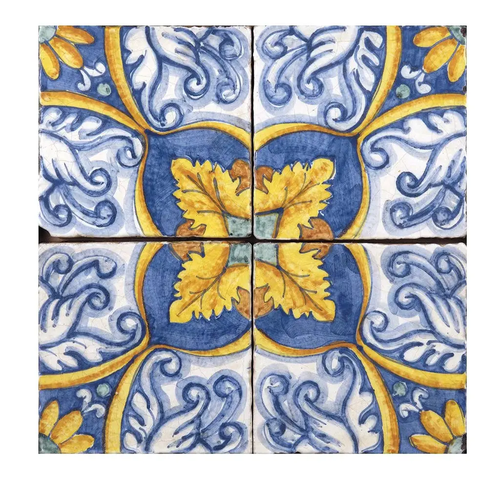 Characterized by bright colors and dynamic motifs, these majolica tiles boast an entirely handmade production that ensures its originality and elegance. From Classici Collection, these tiles feature an intricate frond-like design that is revealed in four tiles. Painted and glazed by hand, the design features canary-yellow fronds outlined in bright blue with matching white-blue swirls set on a red background. Crafted of terracotta mixed with ground volcanic stone, these tiles must be applied without grouting to ensure design continuity. Best showcased as a wall panel in a kitchen or patio.