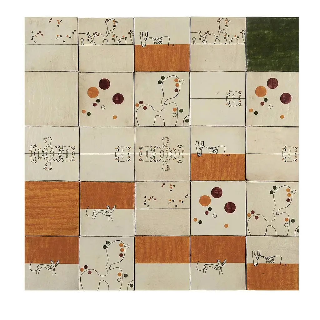 Designed by Luigi Patitucci, this set of 25 tiles (1 sqm) belongs to the Dejavu Ficus Indica Collection. A playful and original accent to a contemporary interior, it is handcrafted of ceramic, enameled in an ivory shade enhanced with a cracked effect, and decorated by hand. This tile will be ideally combined with others from the Find series. Please consult the Artemest catalog for other design options. Each tile measures 20 x 20 cm.