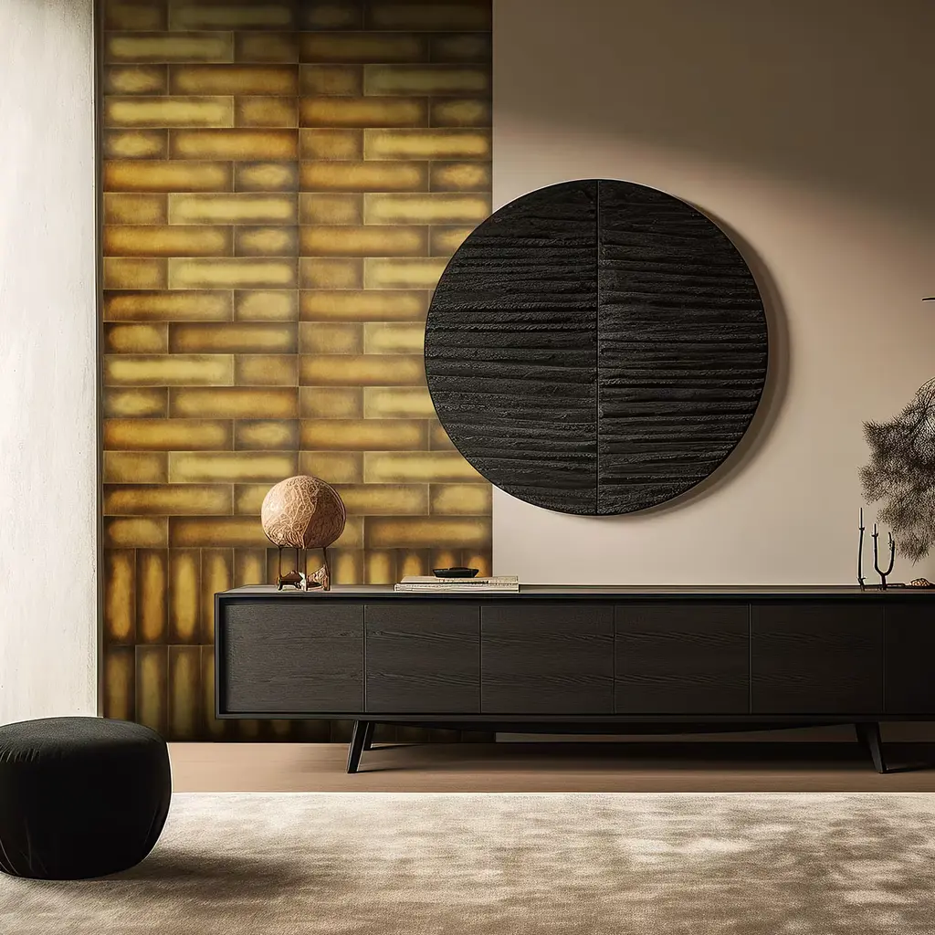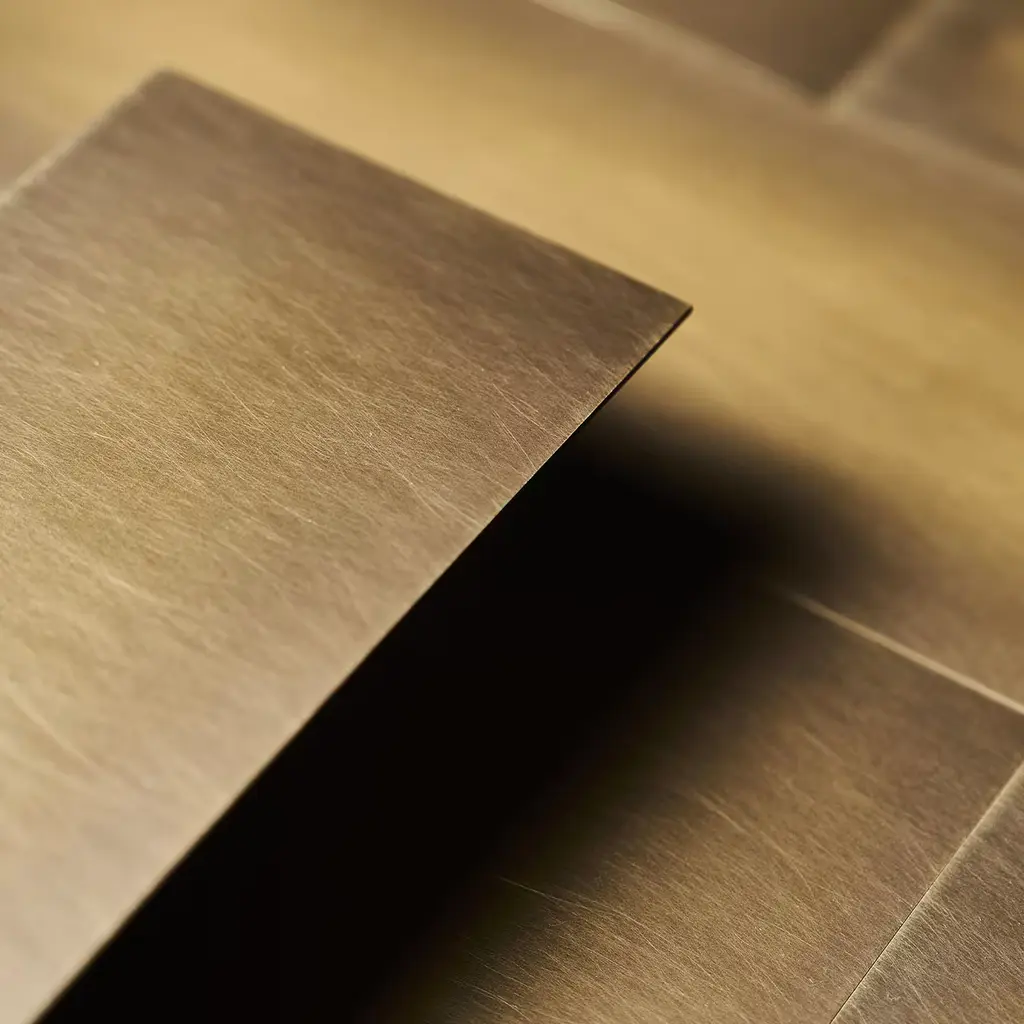 The finest Venetian artisan tradition meets geometric elegance in this precious set, counting ten hand-brushed burnished brass tiles. Distinguished by a central shaded effect, each tile exudes a sophisticated dynamism conferred by the metallic sheen as it catches the light. Please contact the Concierge for different size options. The price listed is for the set of 10 tiles. Product images show the different compositions that can be made. Contact the concierge for more information and details.