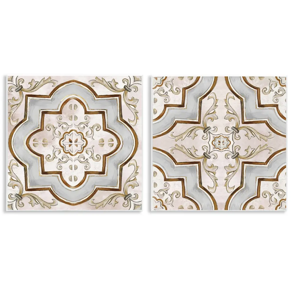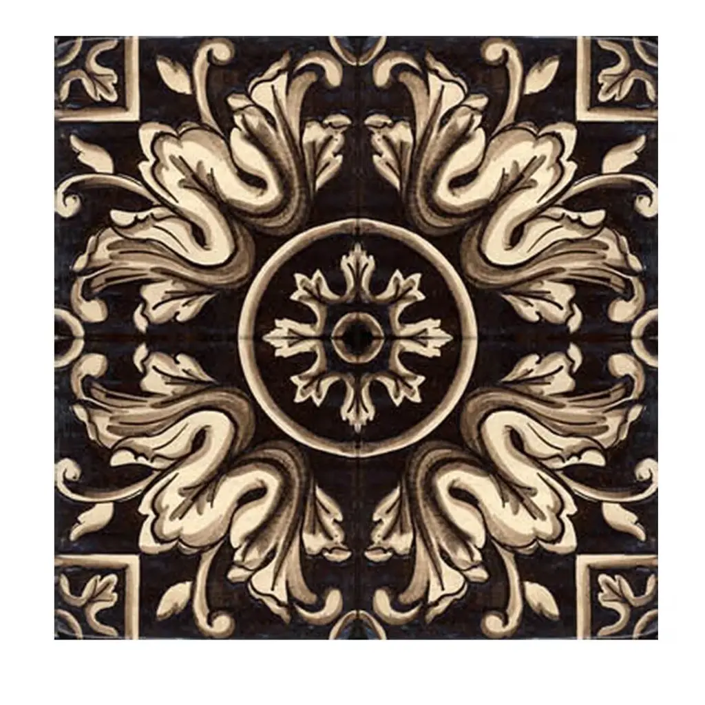 Handcrafted according to ancient Sicilian majolica tradition, these four tiles merge to reveal a stunningly ornate design recalling Sicily's dominant Moorish influence. The tiles reveal a striking, symmetrical design with ivory and light-brown frond motifs set on a warm brown background. Delicate scroll details frame the fronds to create a uniform design. Installed as a wall panel in a kitchen, dining room, or patio, these tiles will bring a delightful touch of Sicily to any decor.