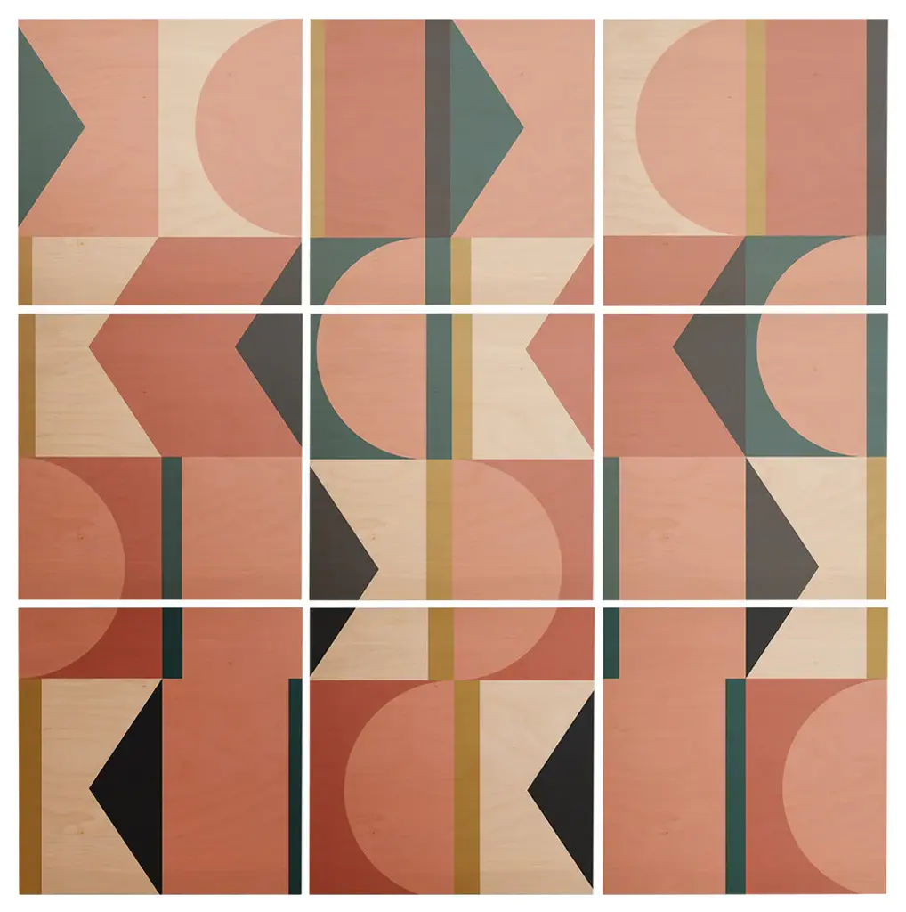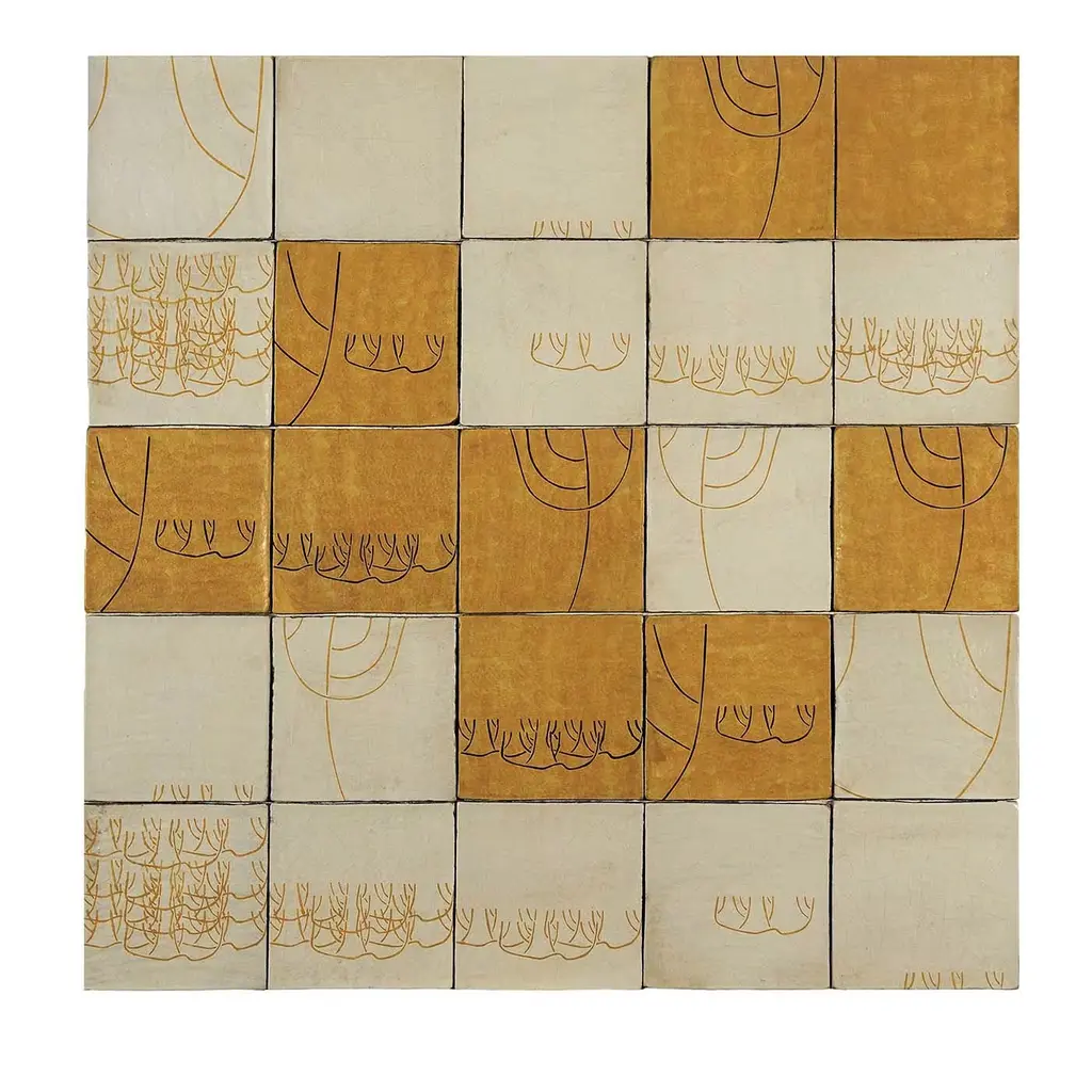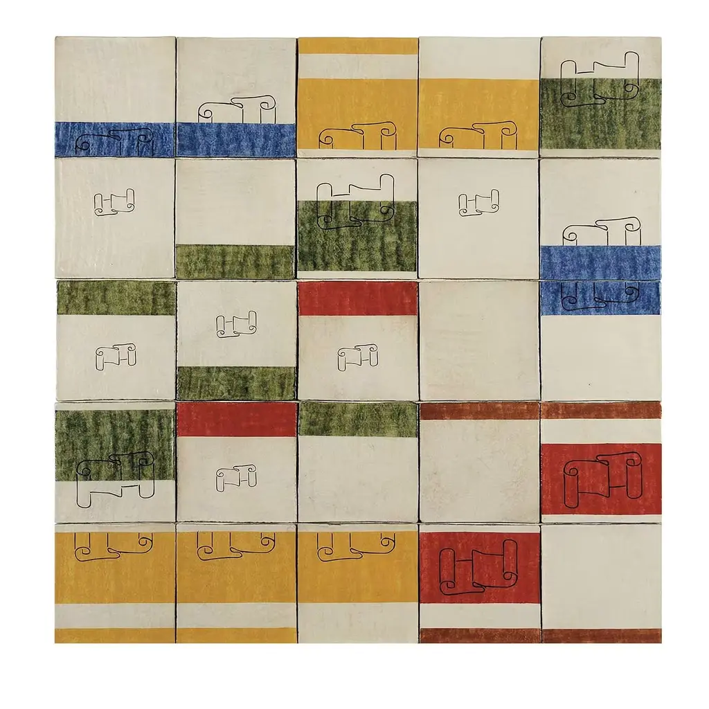 Reminiscent of Joan Miro's whimsical compositions, this elegant, majolica tile panel will add an elegant touch to a modern or classic decor. Merging traditional craftsmanship with modern design, the 25 tiles that compose the panel boast playful and simple designs of figures and shapes utilizing a 4-hue color scheme (orange, red, green, and black) set entirely on an ivory background. The focal point of any interior, these tiles are best showcased in any configuration as a panel in a kitchen, bathroom, powder room, or patio.