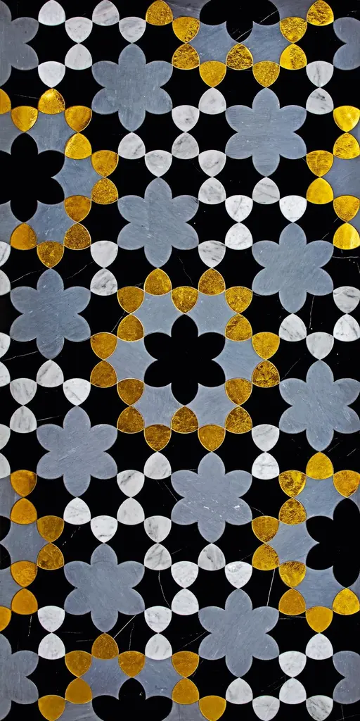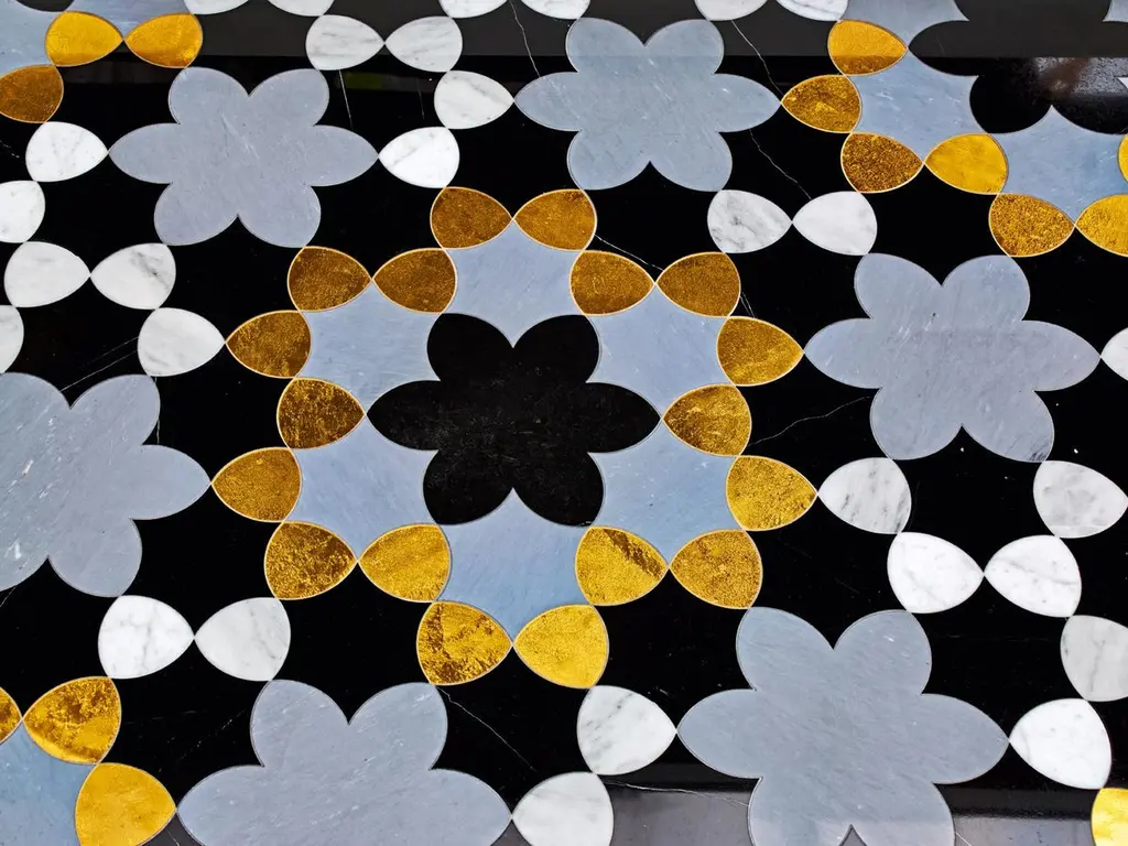 Waterjet marble patternsMagreb GreyMarbles: Bianco Carrara, StatuarioMosaic Glass: White Iridescentprice for square meter: € 2.640Magreb BlackMarbles: Bardiglio, Black, Bianco CarraraGlass Mosaic: GoldPrice for square meter: € 2.820