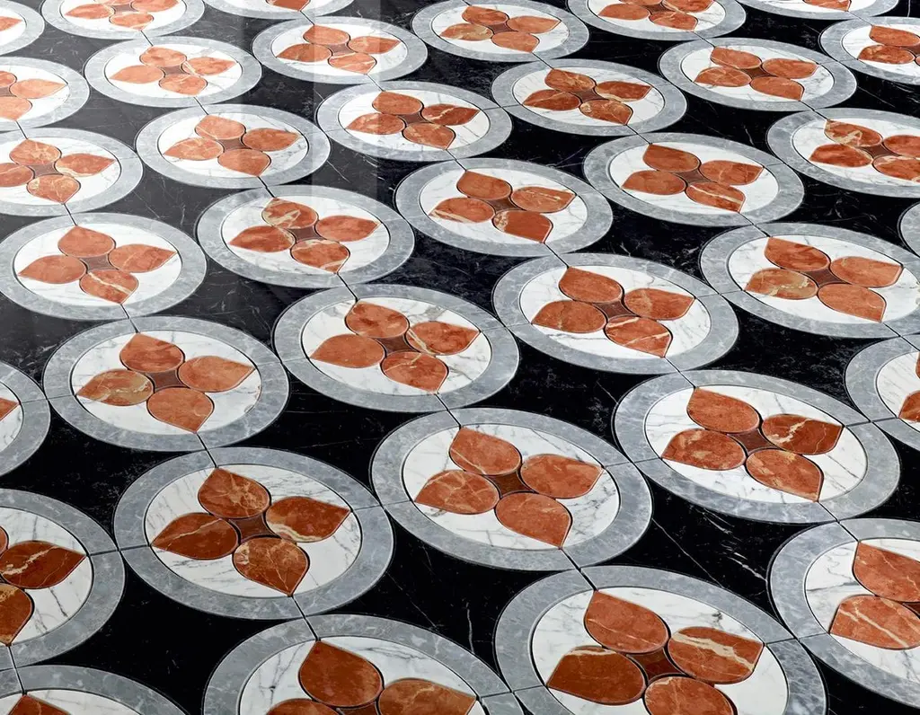 Waterjet marble patternsYarmonyMarble: Bardiglietto, Nero, Rojo, Bianco AmericanoPrice for square metrer € 2.940