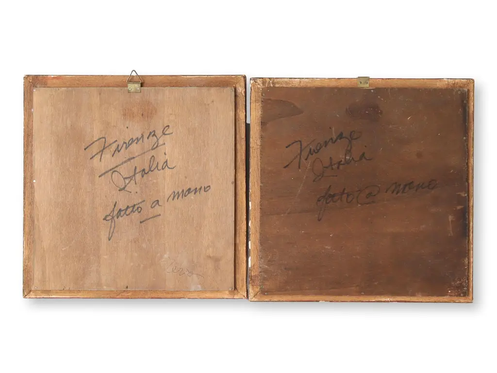 A pair of 1970s framed Italian Faience tiles. Crafted from glazed Italian Faience, with each displayed in their timeless original gilded Florentine wood frames, synonymous with renowned Italian decorative trays, these tiles are not just pieces of art but reflections of history, culture, and exquisite craftsmanship. Signed on the back "Firenze Italia Fatto a Mano / Florence Italy Handmade".