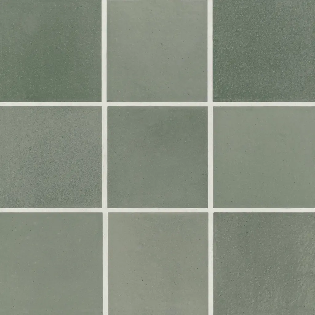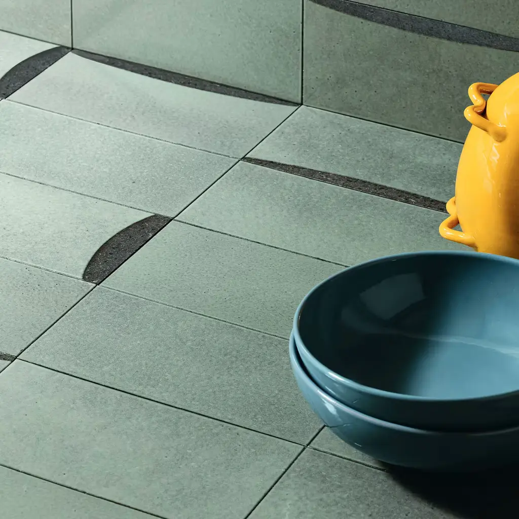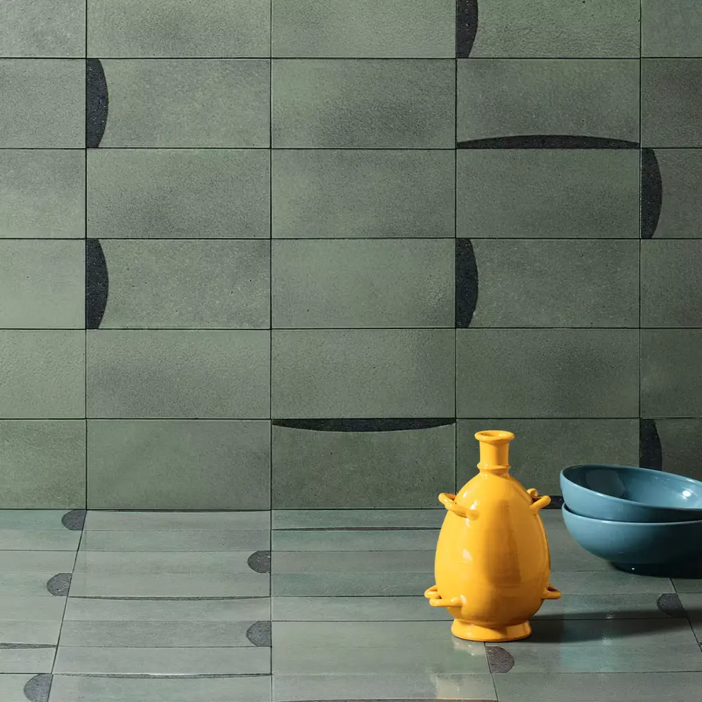 Handcrafted by masters Nicolò and Fausto Parrinello, this set counts 22 rectangular tiles in authentic stone from the Etna volcano. A refined tone of sage green was selected for the glaze that, thanks to the temperature in the kilns, combines with the stone and gives birth to unique shades. Perfect for both floor and wall coverings alike, it withstands impacts and jumps in temperature.