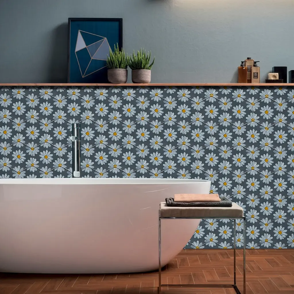 A gorgeous design inspired by the flora on Sicily's Etna volcano, this set of four hexagonal ceramic tiles belongs to a singular and refined series designed by Vincenzo Messina, paying homage to the exceptional surprises offered by Mother Nature. Part of the Kimeya Collection of sustainably handcrafted pieces, each piece is enameled and decorated by delicate daisies on a gray backdrop.