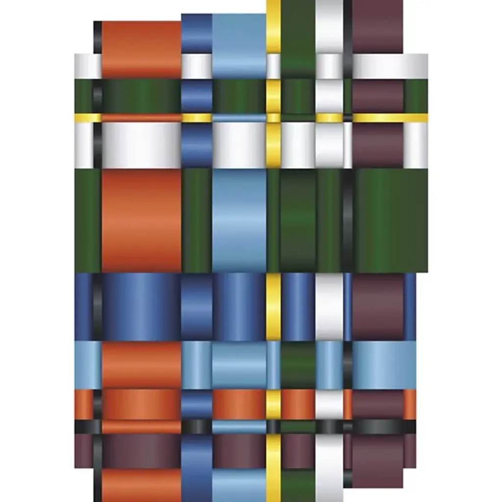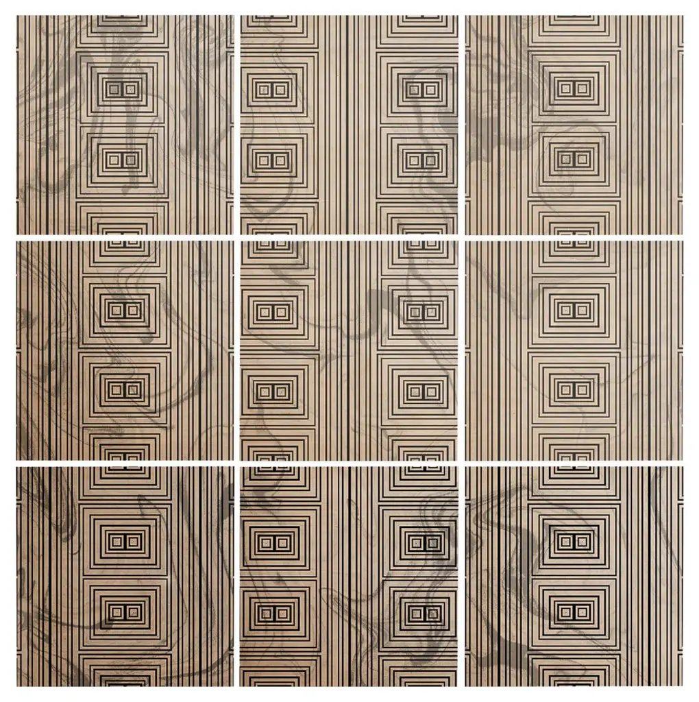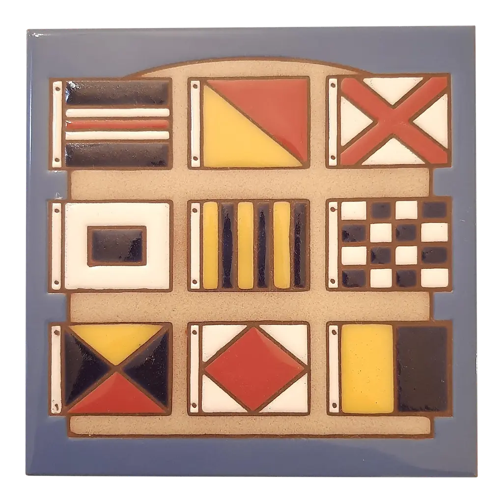 A creative revisitation of classic forms, this whimsical majolica tile panel by Studio Le Nid will make an eclectic addition to any modern-styled home. Handcrafted and glazed, this exceptional 25-tile panel is crafted of terracotta with volcanic stone and boasts a striking paper scroll motif in black outline with block-colored accents in red, green, orange e, and blue enamels. Best mounted with minimal grouting to ensure continuity of design, this panel is ideally showcased in endless configurations in a kitchen, bathroom, powder room, or patio area.