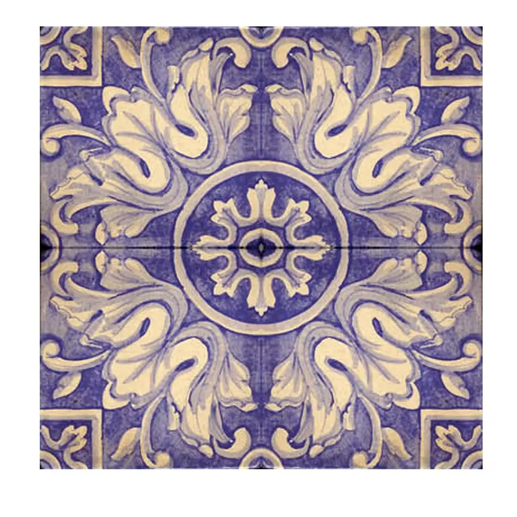 Handcrafted according to ancient Sicilian majolica tradition, these four tiles merge to reveal a stunningly ornate design recalling the grandeur of late Renaissance period. The four tiles unite to create a symmetrical design with ivory-colored motifs set on a elegant lilac background. Delicate scrolls frame the fronds, creating a subtle juxtaposition of forms that completes the design. The deft use of color, shapes, and shapes s creates a captivating aesthetic that is best showcased as a wall panel in a kitchen, dining room, entryway, or patio.