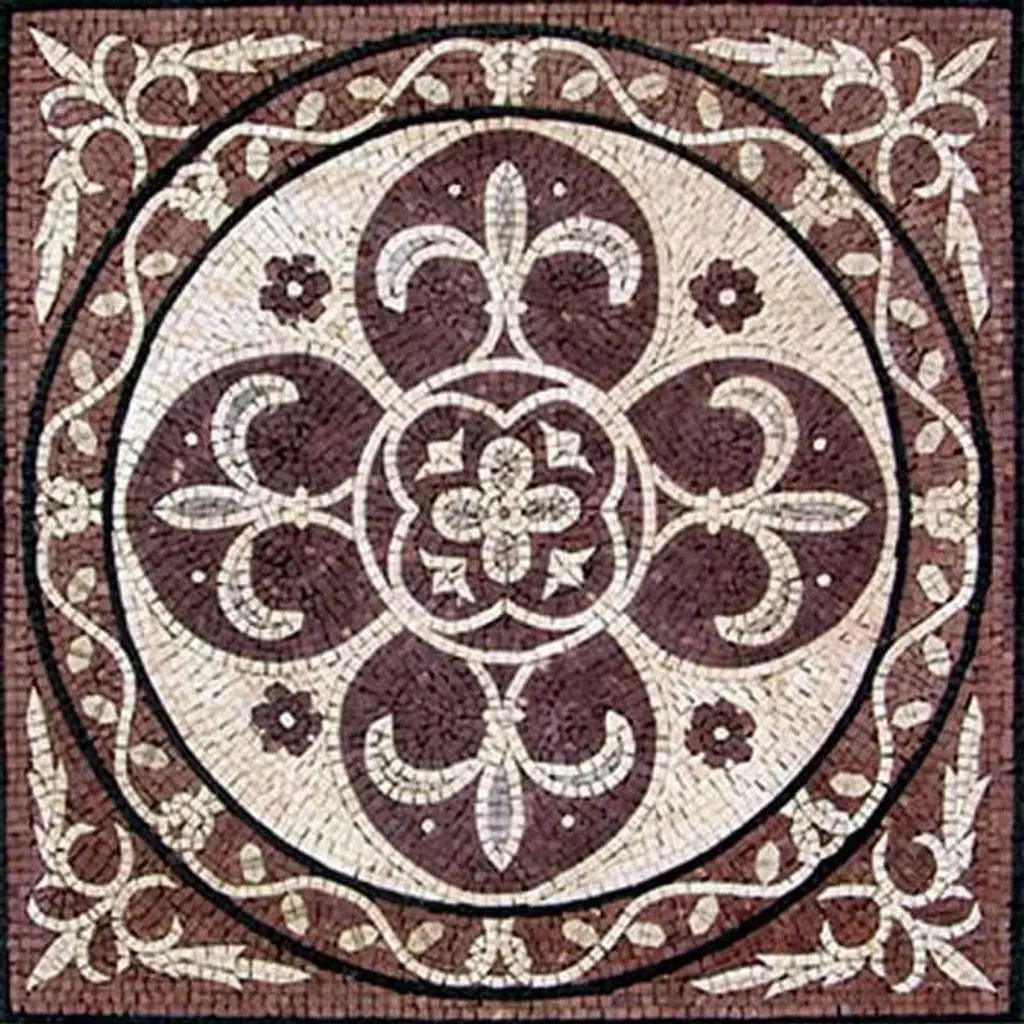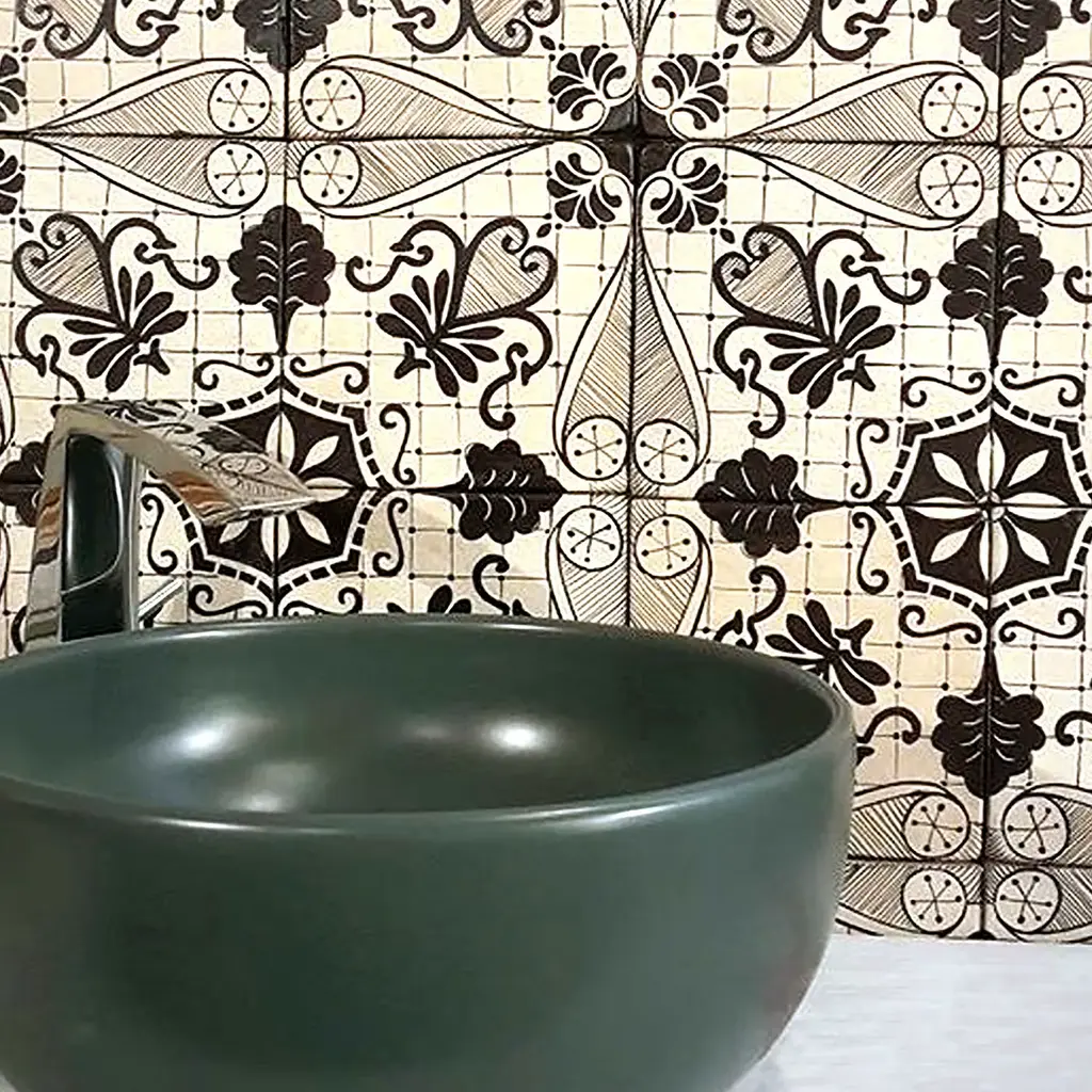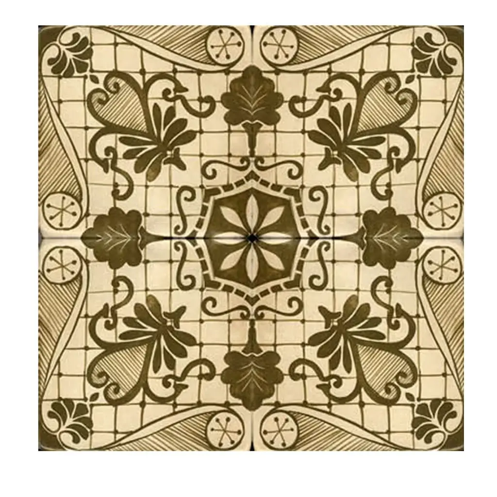 From the Natura Collection boasting natural motifs, this tile will make a dramatic mural or pavement in an entryway, powder room, or bathroom in a rustic home. Entirely handpainted and glazed, these tiles feature an intricate design revealed in four tiles. The design features frond-like motifs set on an ivory background with a sinuous black frame. The underlaid grid adds a touch of visual linearity that enhances the artistry of the piece. Crafted from terracotta mixed with ground volcanic stone, these tiles must be applied without grouting to ensure design continuity.