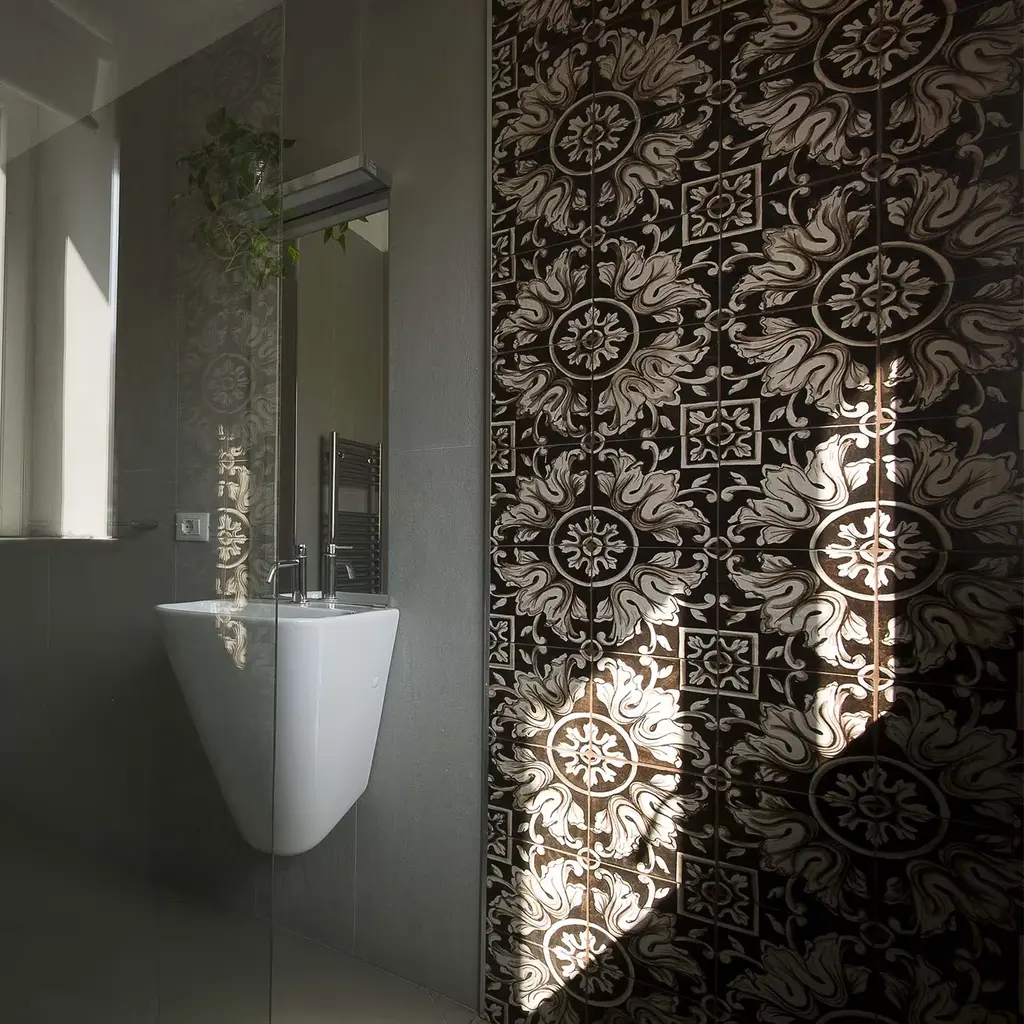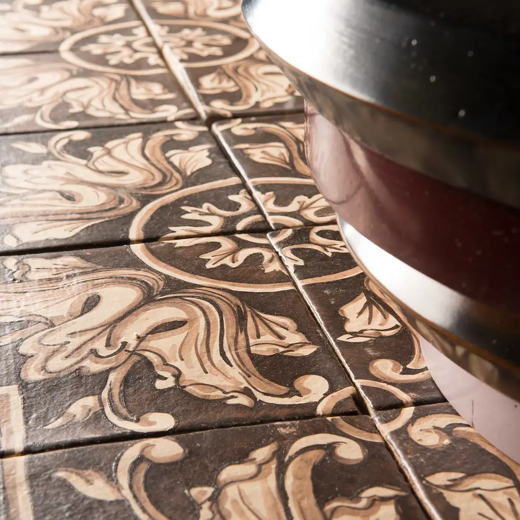 Marked by a sophisticated and elegant aesthetic, these handcrafted majolica tiles exude the grandeur and originality of Sicilian ceramic craftsmanship. Crafted of terracotta mixed with ground volcanic stone, these tiles from the Natura Collection are ornately decorated with ivory-hued frond elements recalling late-Renaissance decor. The fronds start from the central design and radiate outwards around the central design to the corners, creating a dynamic swirling of forms and colors set on a black background. Best showcased as a wall panel in a kitchen, dining room, or entryway.