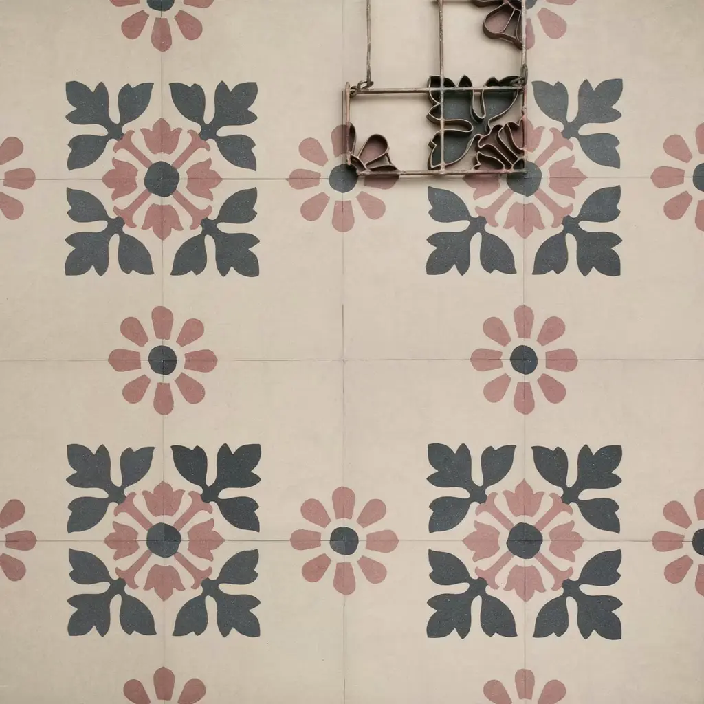 A stately and bold design of strong geometric value, this splendid set of 25 cement tiles will create a striking focal point when used on a kitchen or bathroom wall or floor of both a modern or traditional home. Handcrafted from a blend of natural raw materials such as cement, marble sand, and Etna's lava sand, using traditional, Sicilian crafting methods, it boasts an elaborate geometric composition in gray and pink on a white background.