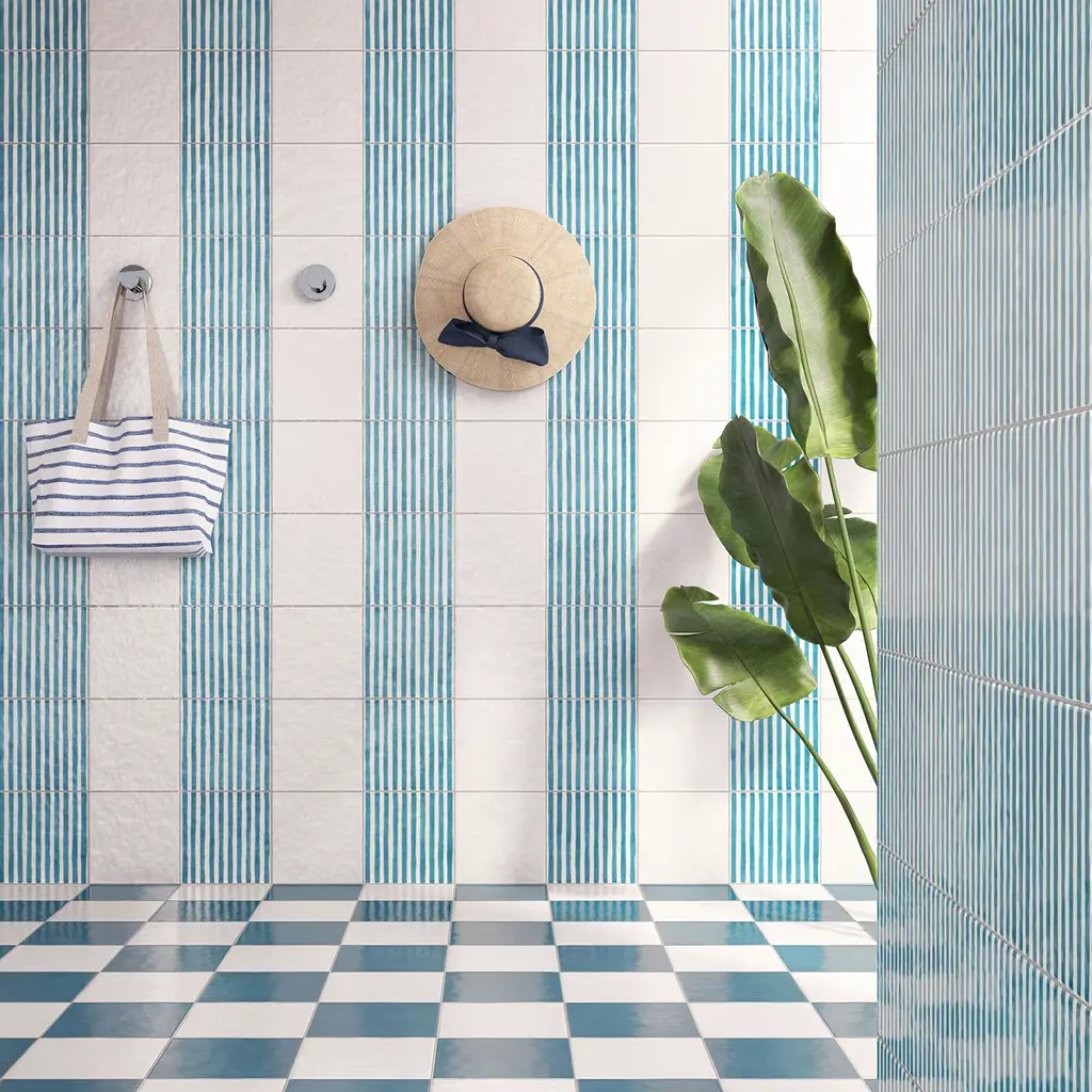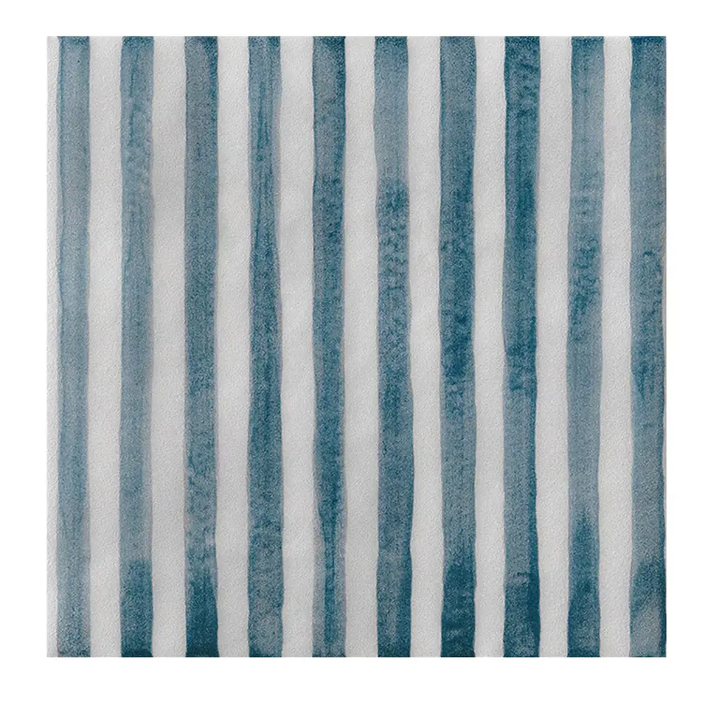 Vertical stripes painted with deliberately irregular strokes reveal all the authenticity and simplicity behind Cerasarda. Comprised of 24 tiles in fine ceramic intended for wall coverings, the set is glazed and decorated by hand, here offered in a combination of white and pigeon-blue but also available in multiple color options in the Artemest catalog.