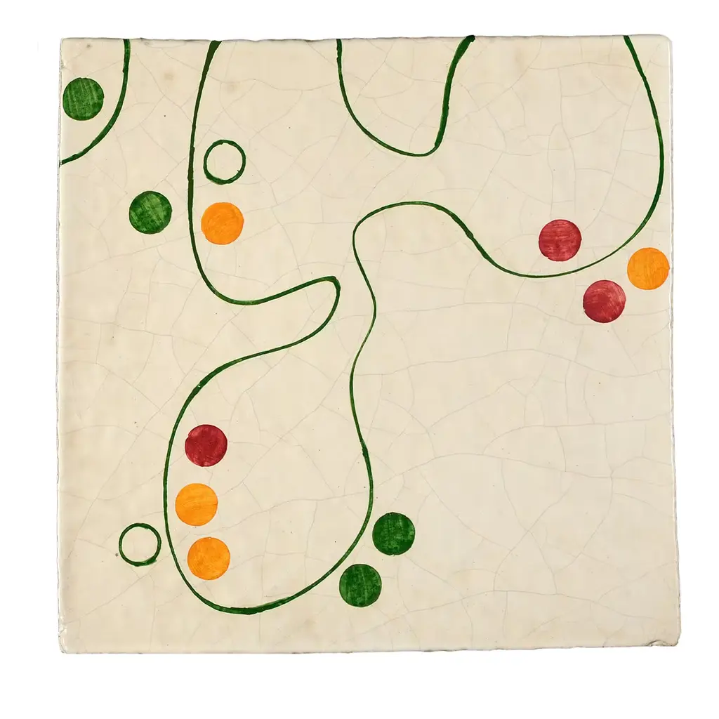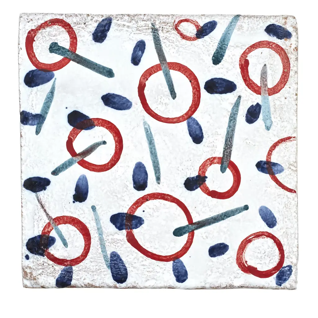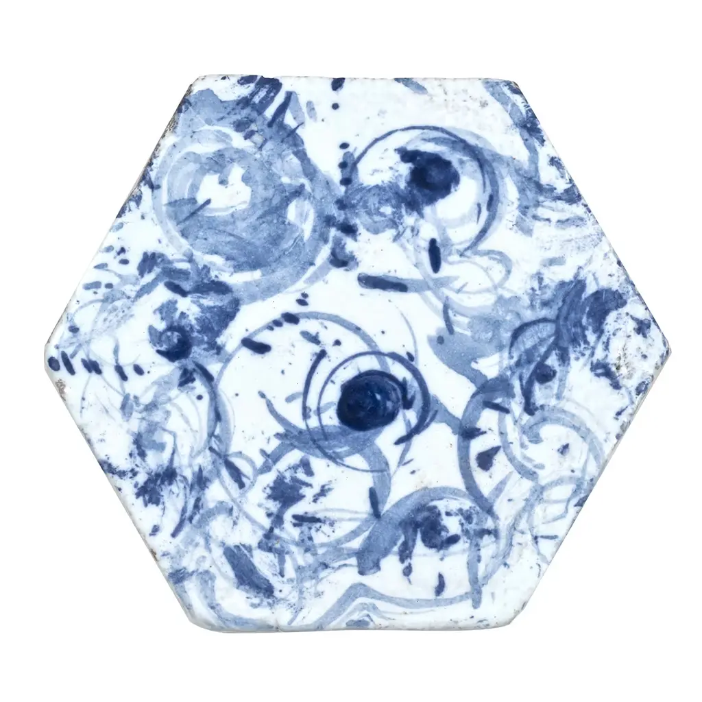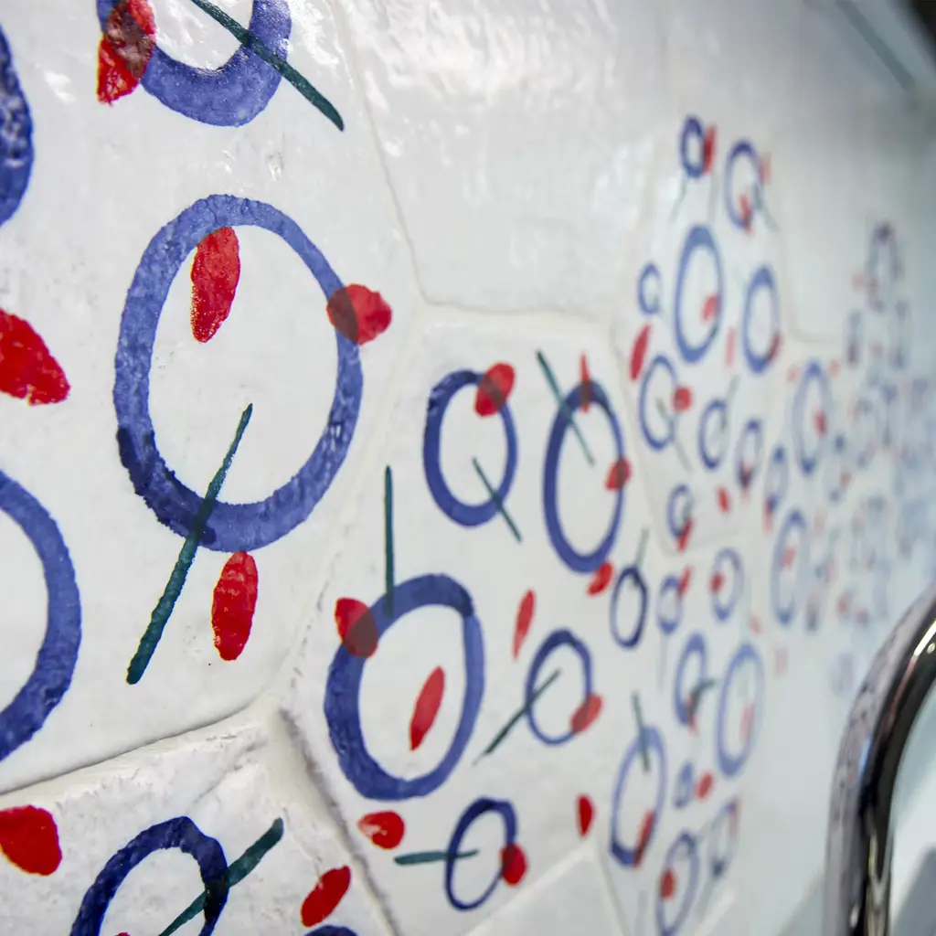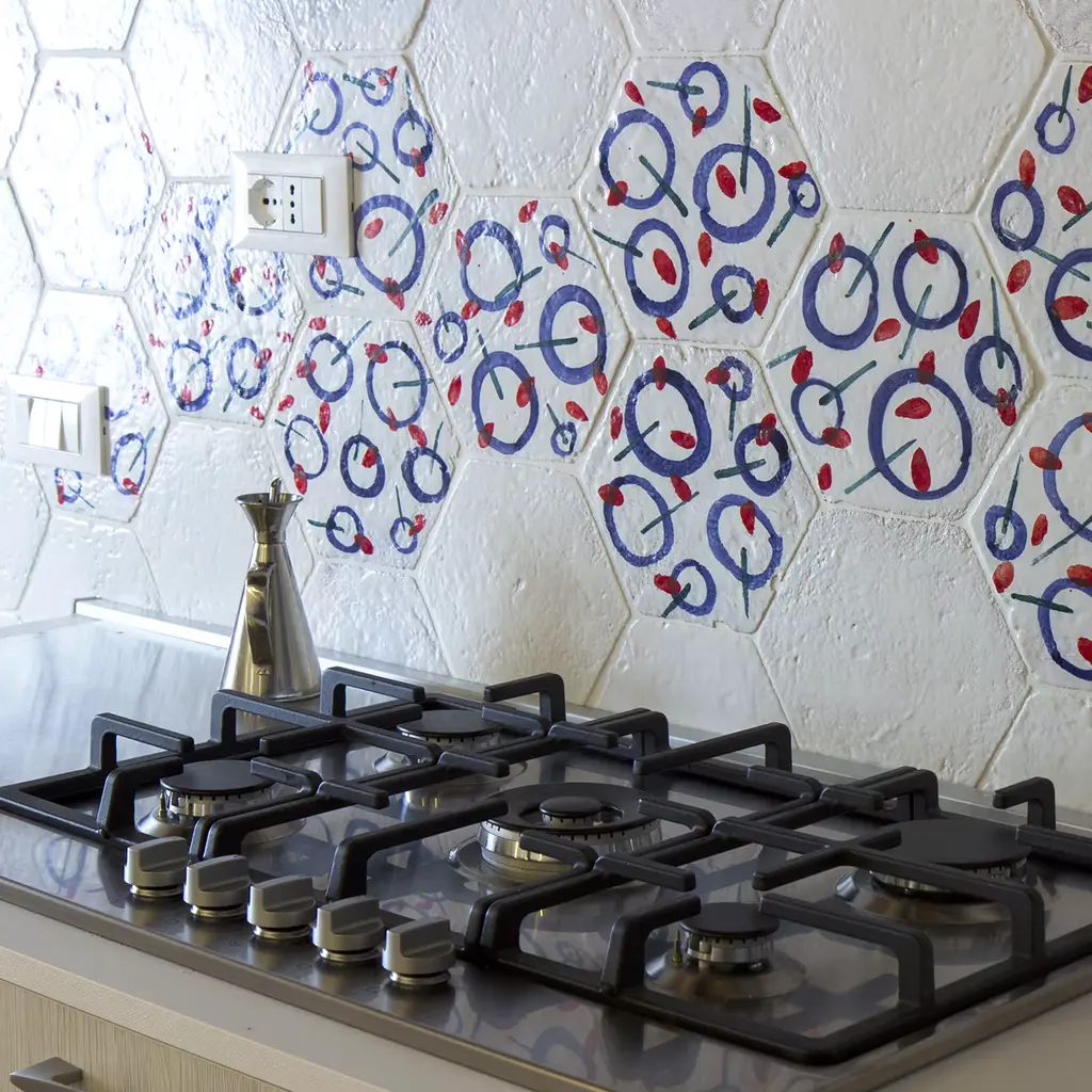 Lending a playful tone to an otherwise dull kitchen wall is unbelievably easy with this artisan set of 25 hexagonal cotto tiles. Handpainted using green, red, and blue enamels, a pattern of stylized Pinocchio faces adorns every tile. Other options can be found in the Artemest catalog. Measures 12cm per side with a 1.5cm thickness.