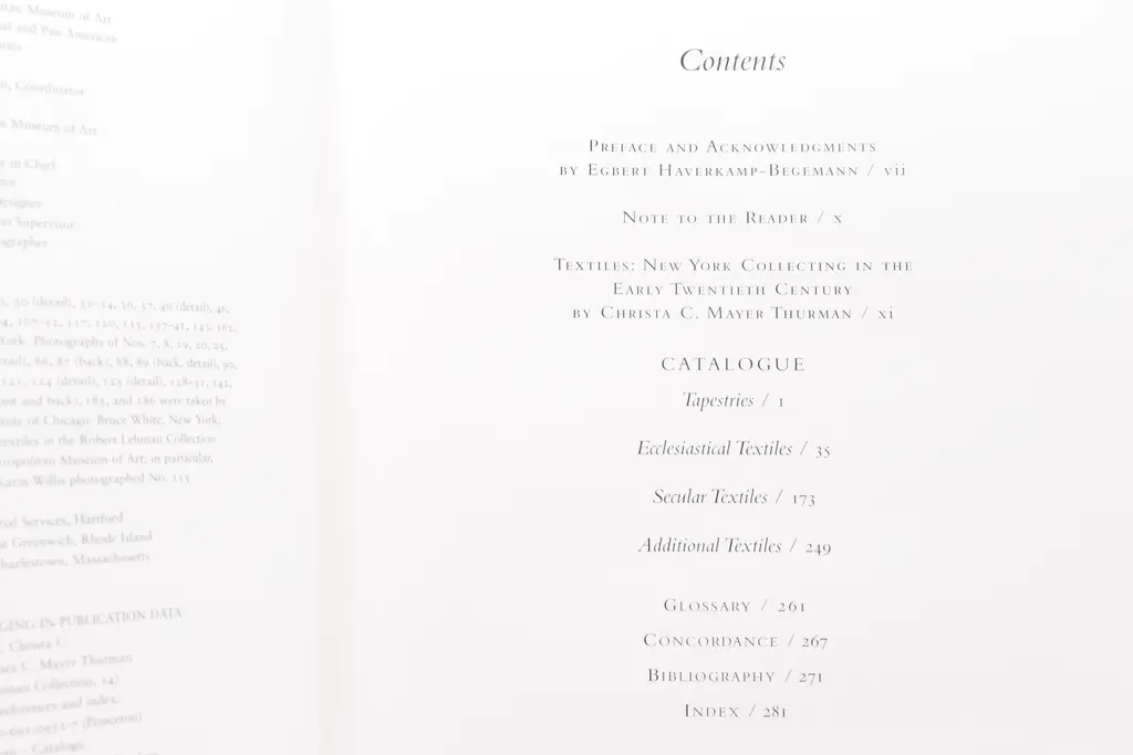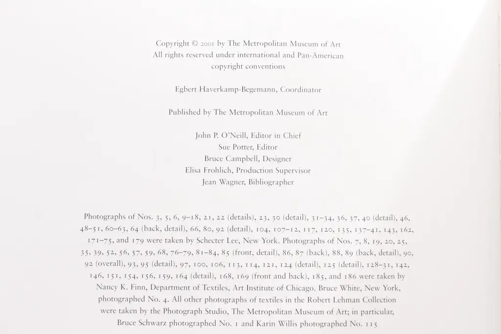 European Textiles in the Robert Lehman Collection by Christa C. Mayer Thurman. Published by The Metropolitan Museum of Art, New York in association with Princeton University Press, Princeton in 2001. Hardcover book with dustjacket, 320 pages, 149 colorplates, 222 duotones. Printed in the United States of America.