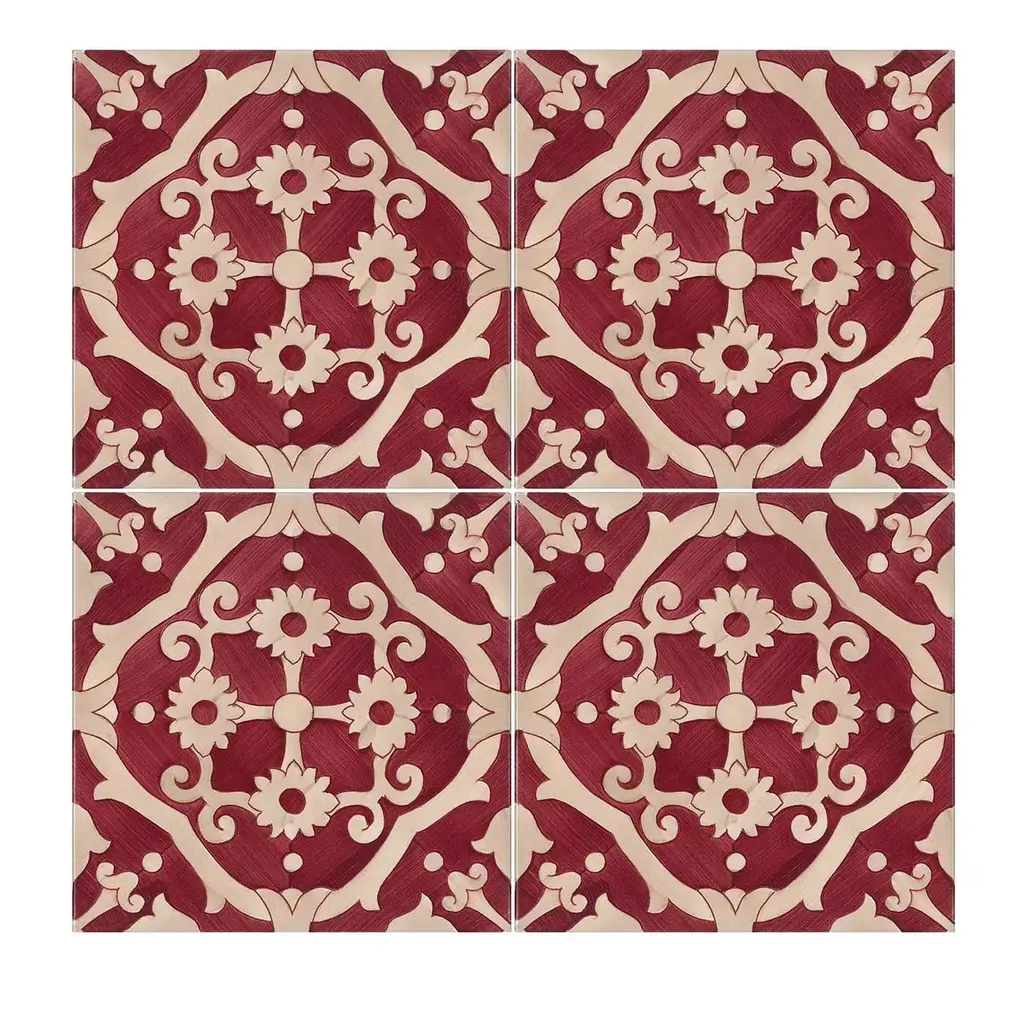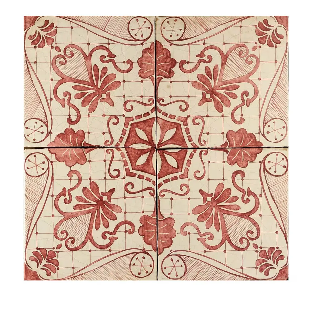 Marked by a dynamic textural quality and unique dimensionality, this tile will be a one-of-a-kind accent on a rustic patio, kitchen, or bathroom. Entirely fashioned by hand using an innovative mix of terracotta and volcanic stone, this tile boasts a meticulous, mirrored design with bold frond motifs rendered in bright red enamel. The ivory background provides an elegant canvas for the red accents, creating a subtle yet striking aesthetic. Hand glazed for a matte finish, these tiles must be applied with minimal grouting to ensure continuity of design.