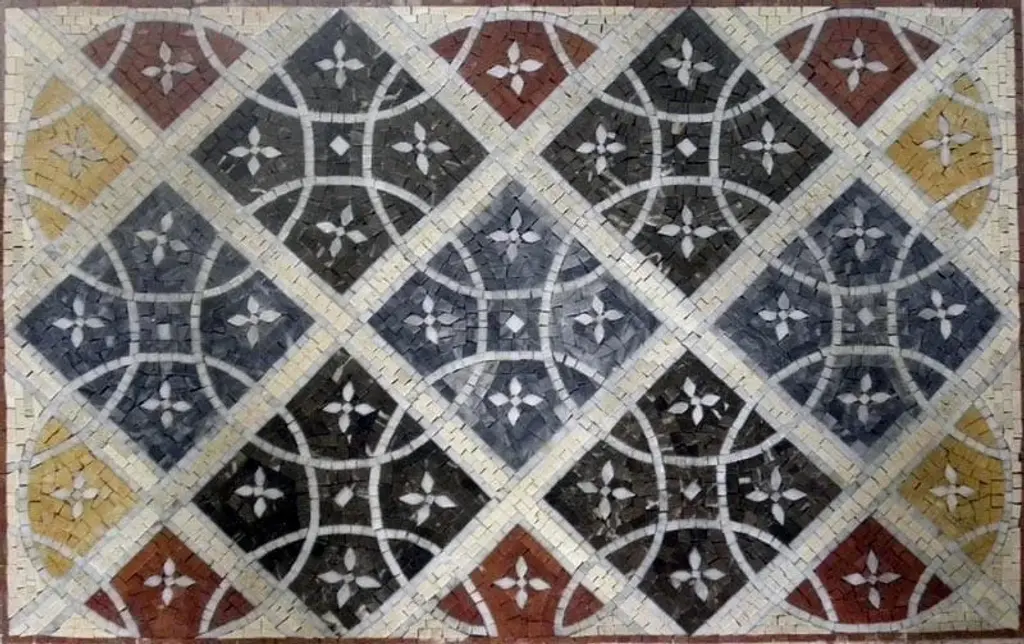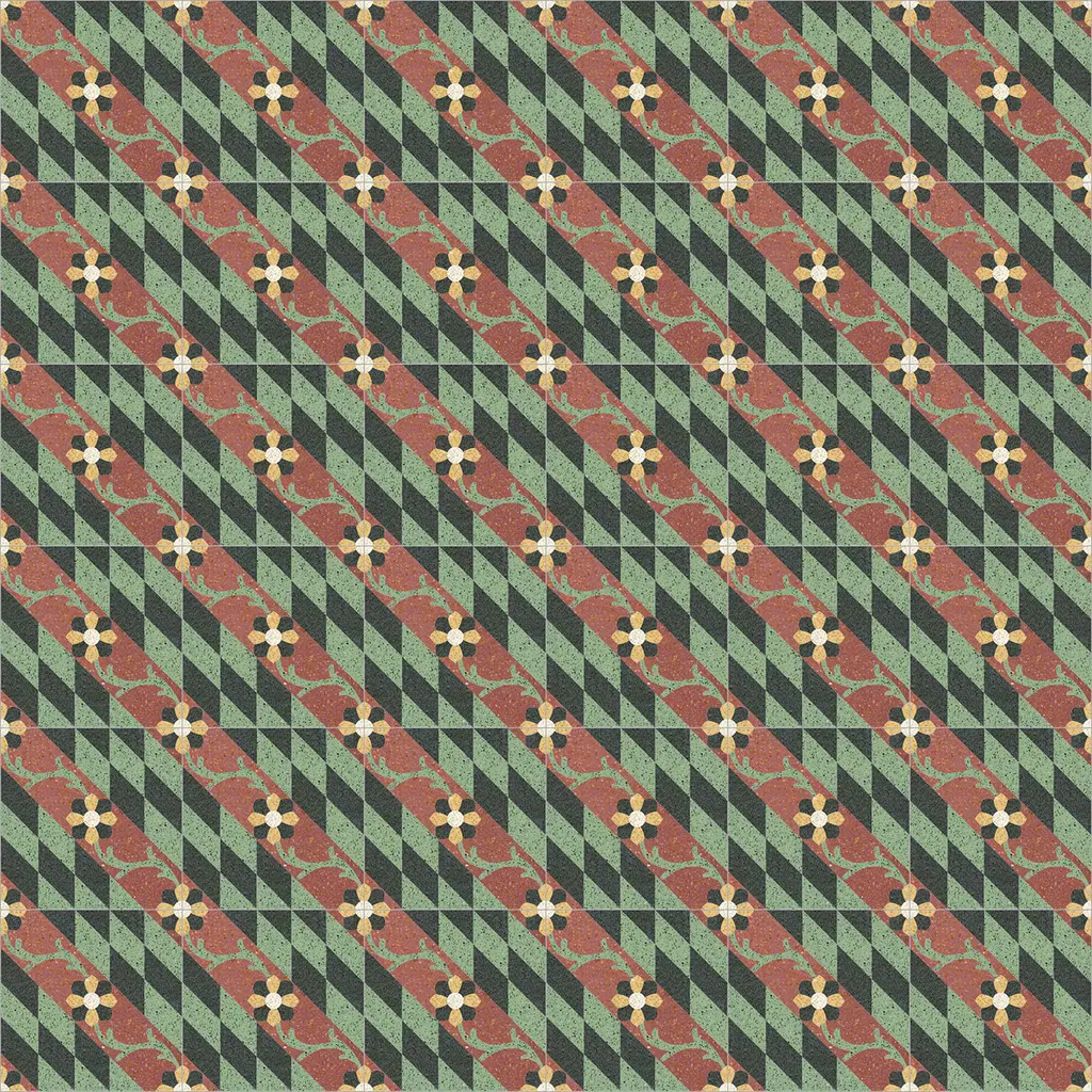 Named after renowned surrealist artist Salvador Dalì, this set of 16 terrazzo tiles boasts a combination of green, yellow, black, pearl-white, and red hues in a striking motif of strong visual character. Illuminating any summer house patio or kitchen with modernist flair, it is deftly handmade in Romano's workshop in Sicily following traditional techniques that combine combining natural raw materials such as cement, marble chips, and volcanic sand from Etna.