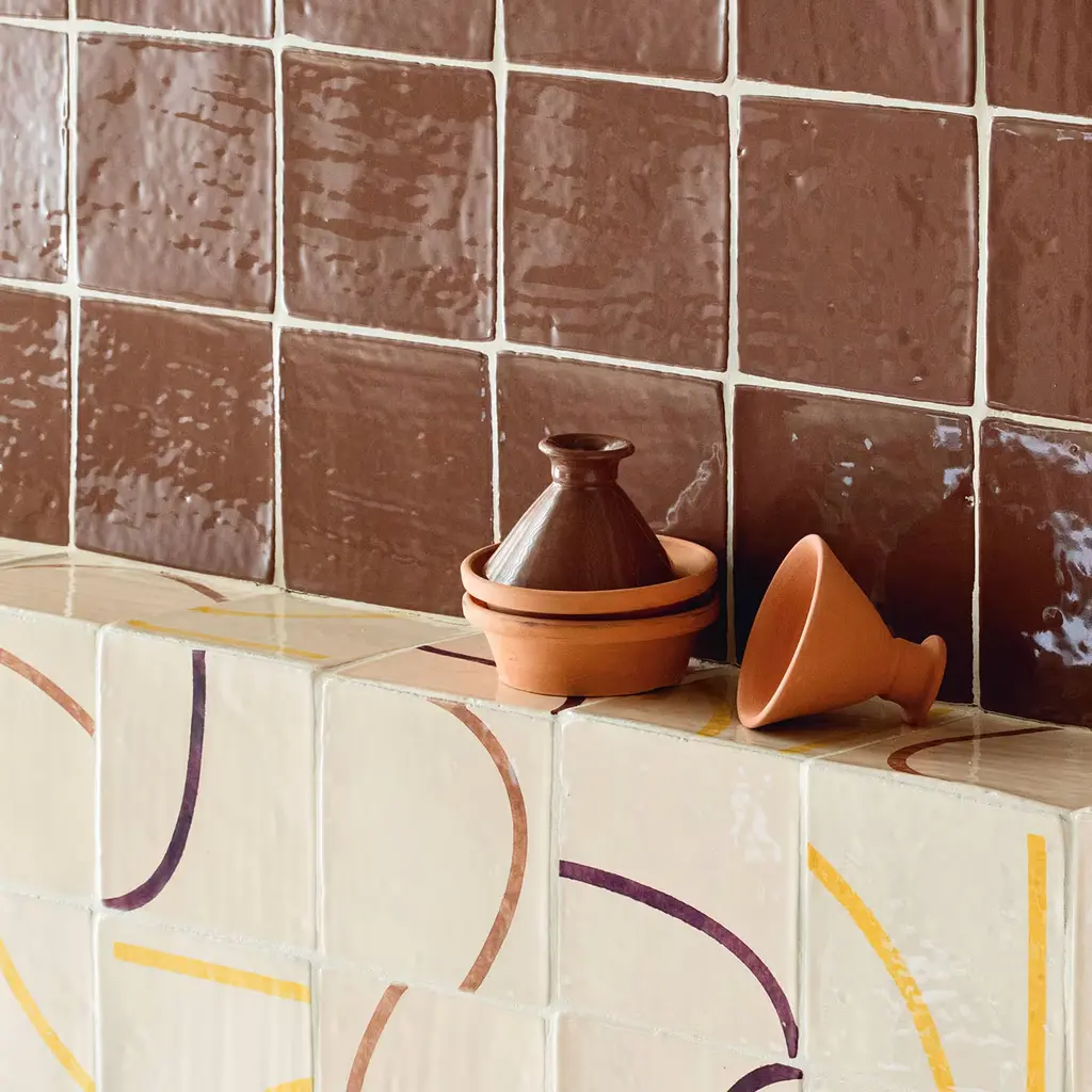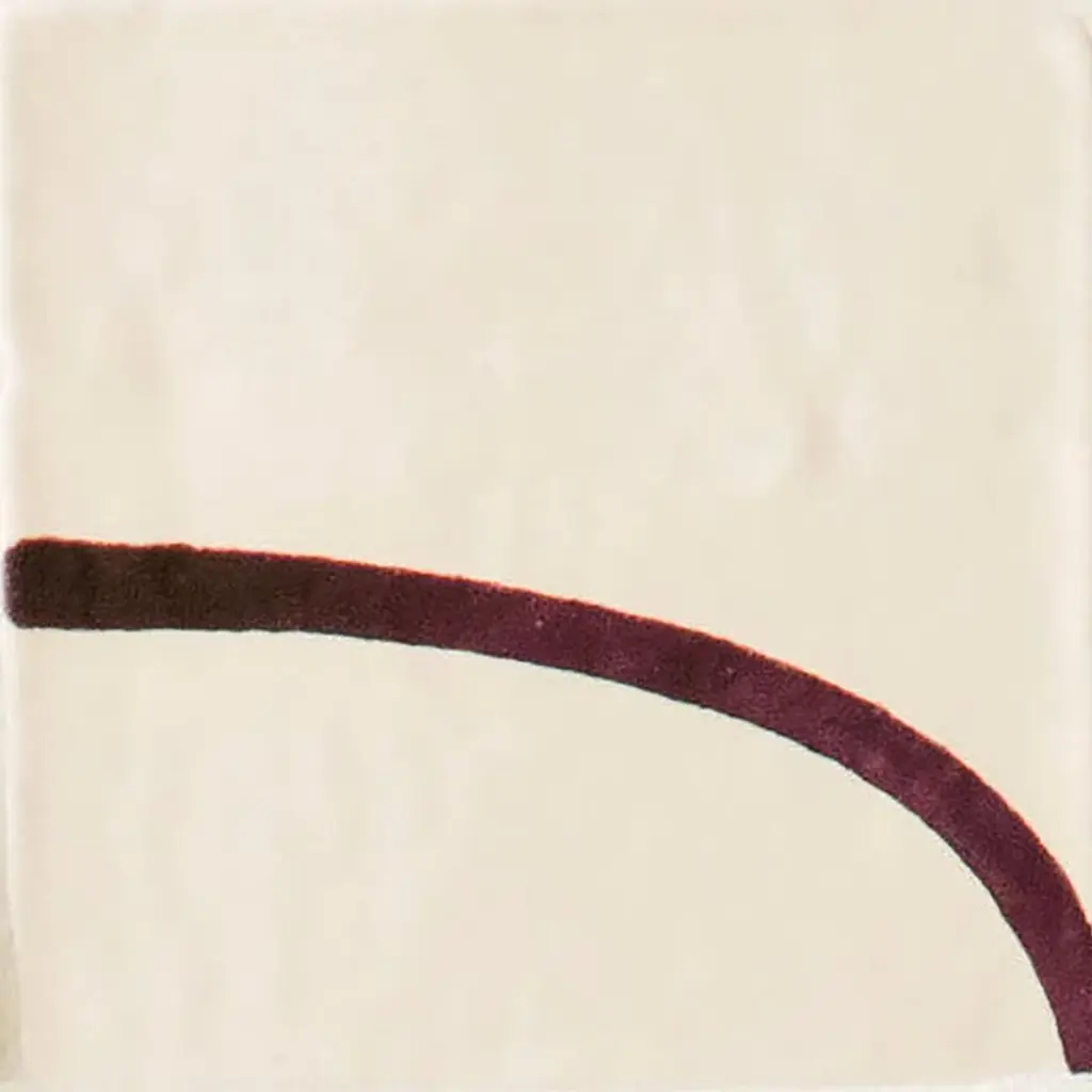 A combination of straight and curved brushstrokes in a combination of yellow, brick red, and purple define the handpainted decoration on the 44 white-glazed ceramic tiles composing this set. Handcrafted by masters Nicolò and Fausto Parrinello, every tile (15x15cm) is perfect for unrepeatable floors and wall coverings capable of distilling joy and releasing brightness.