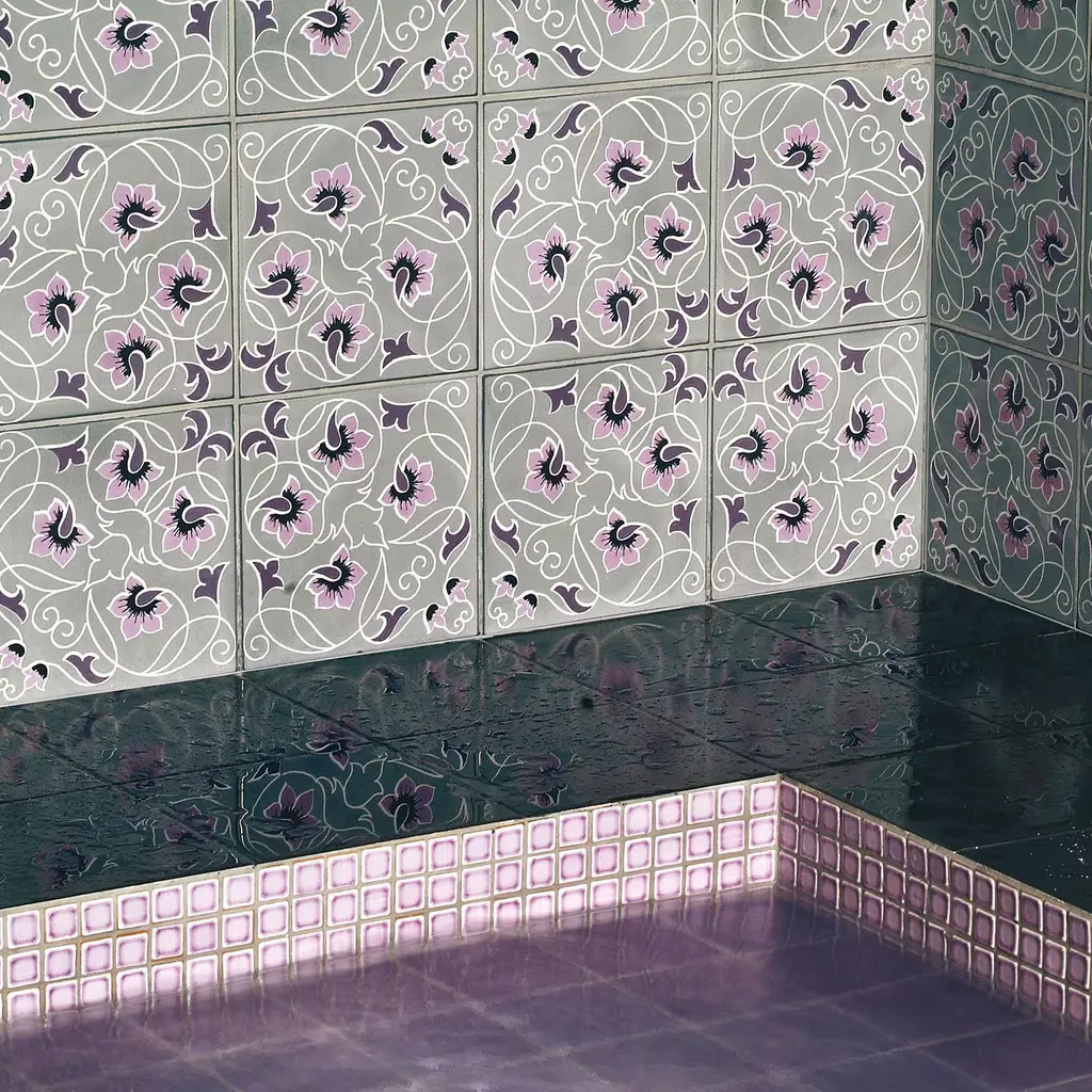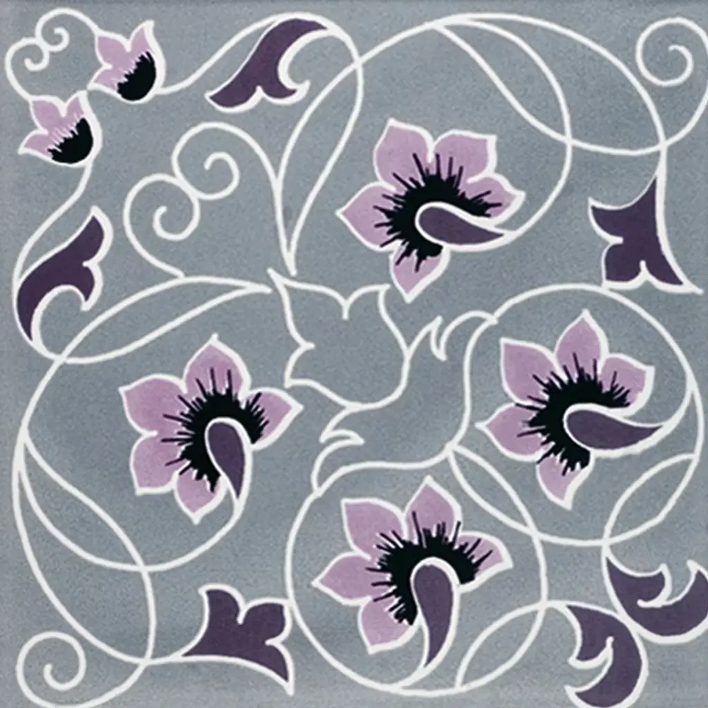 This set of 25 tiles (1 sqm) is hand-decorated by skilled, expert artisans in a family-run company who have been working in ceramics since 1492. Featuring a motif of delicate violet flowers against a gray background, they are produced in Vietri, which is famed the world over for its high-quality ceramics. Each tile measures 20 x 20 cm.