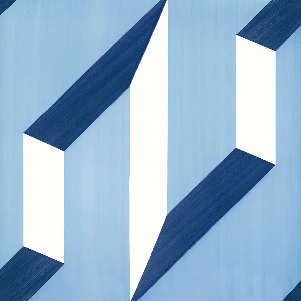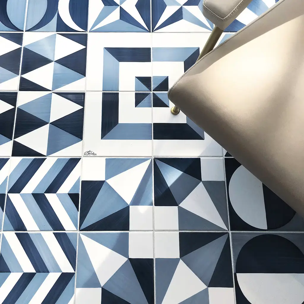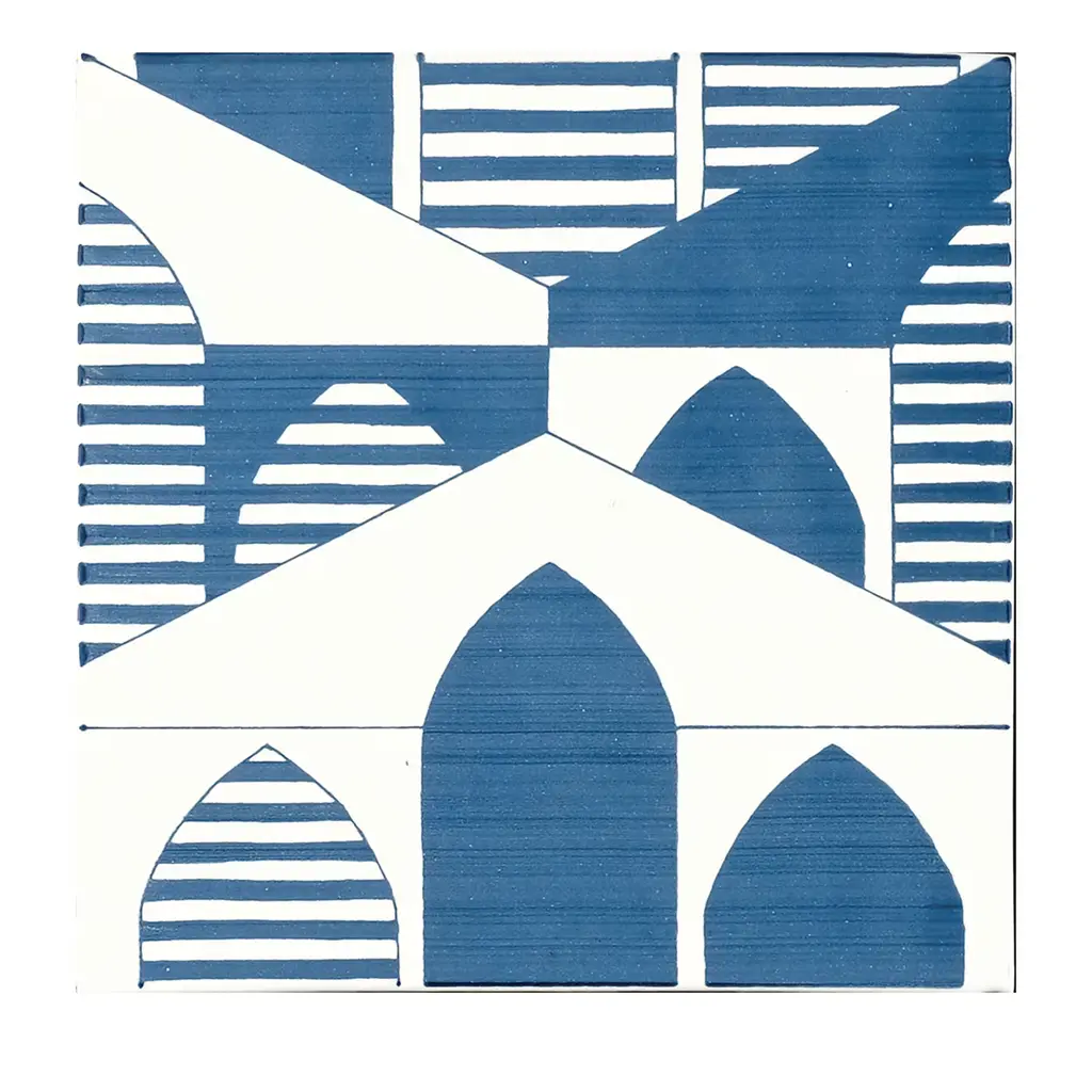 These exclusive tiles are part of the Blu Ponti collection inspired by the white and blue majolica designed in 1960 by Gio Ponti . Handcrafted using the materials and enamels as well as the artistic techniques of the centuries-old Vietri tradition, these tiles feature a striking tromp d'oeil design of great visual effect. The composition is made of 25 square tiles (1 sqm) measuring 20x20 cm each, and features a design of white and blue fragmented stripes on a light blue background. An original composition of color and geometry in which bold patterns are at the forefront.