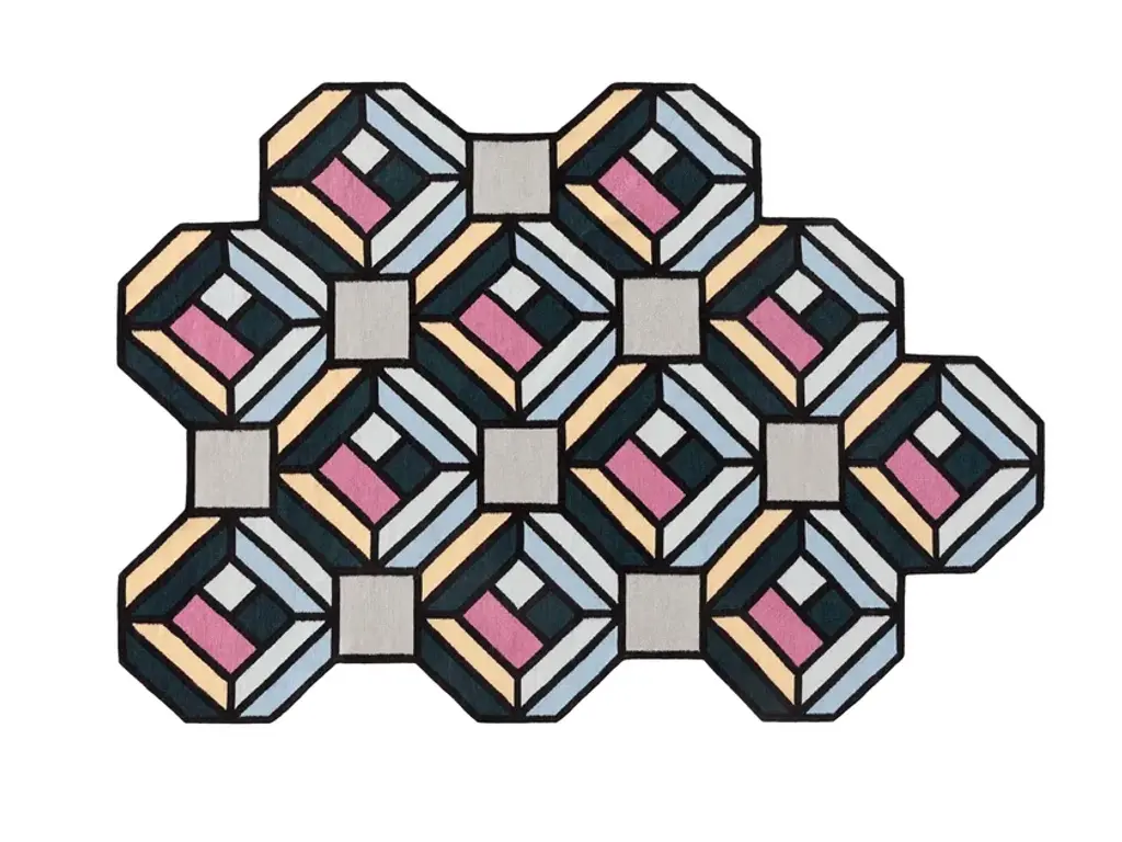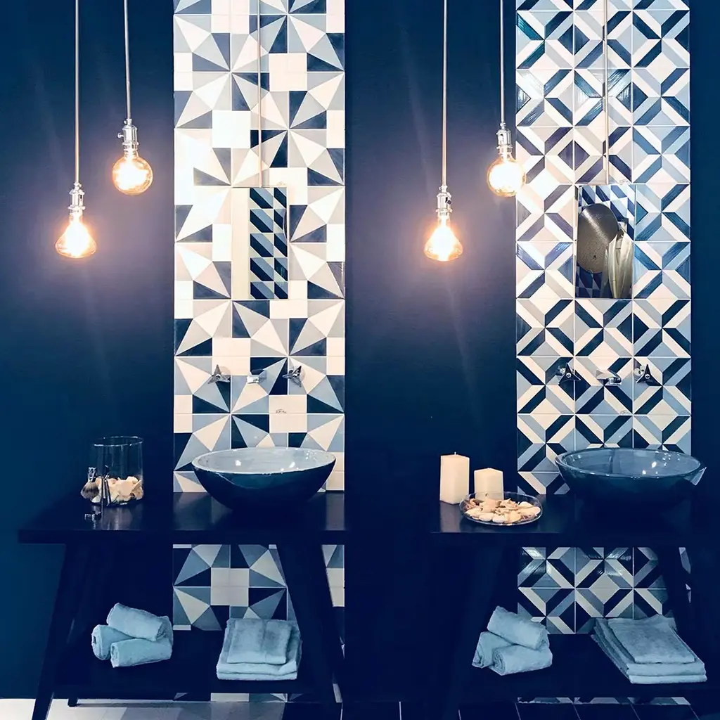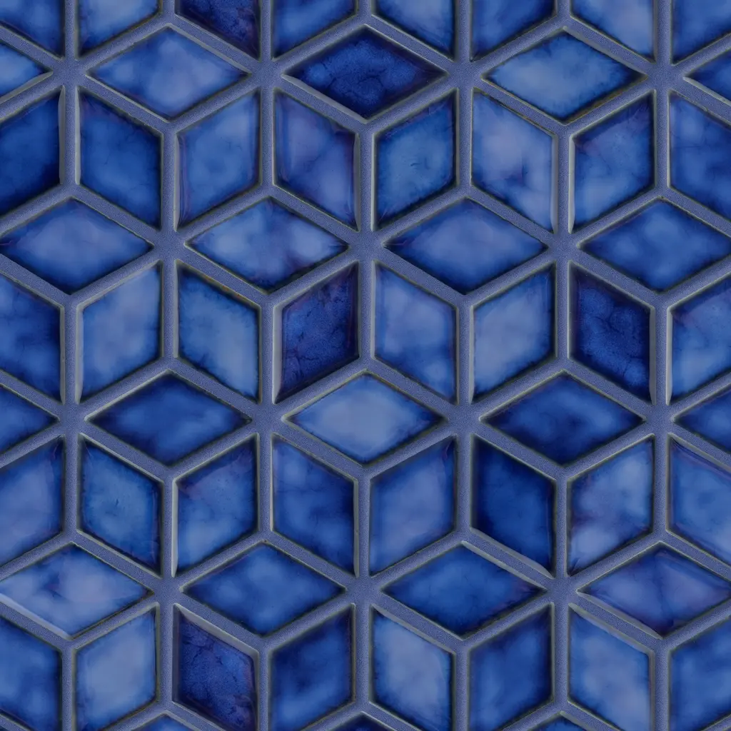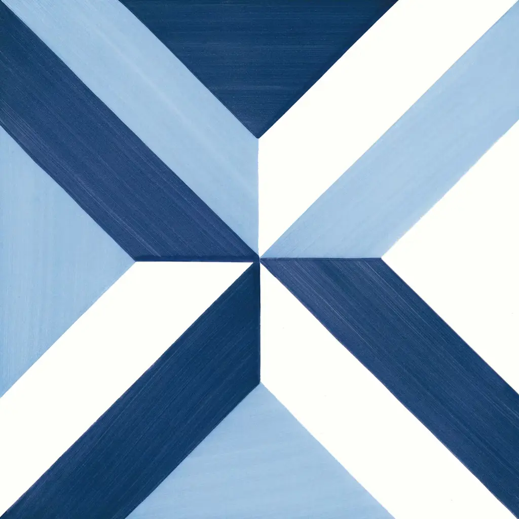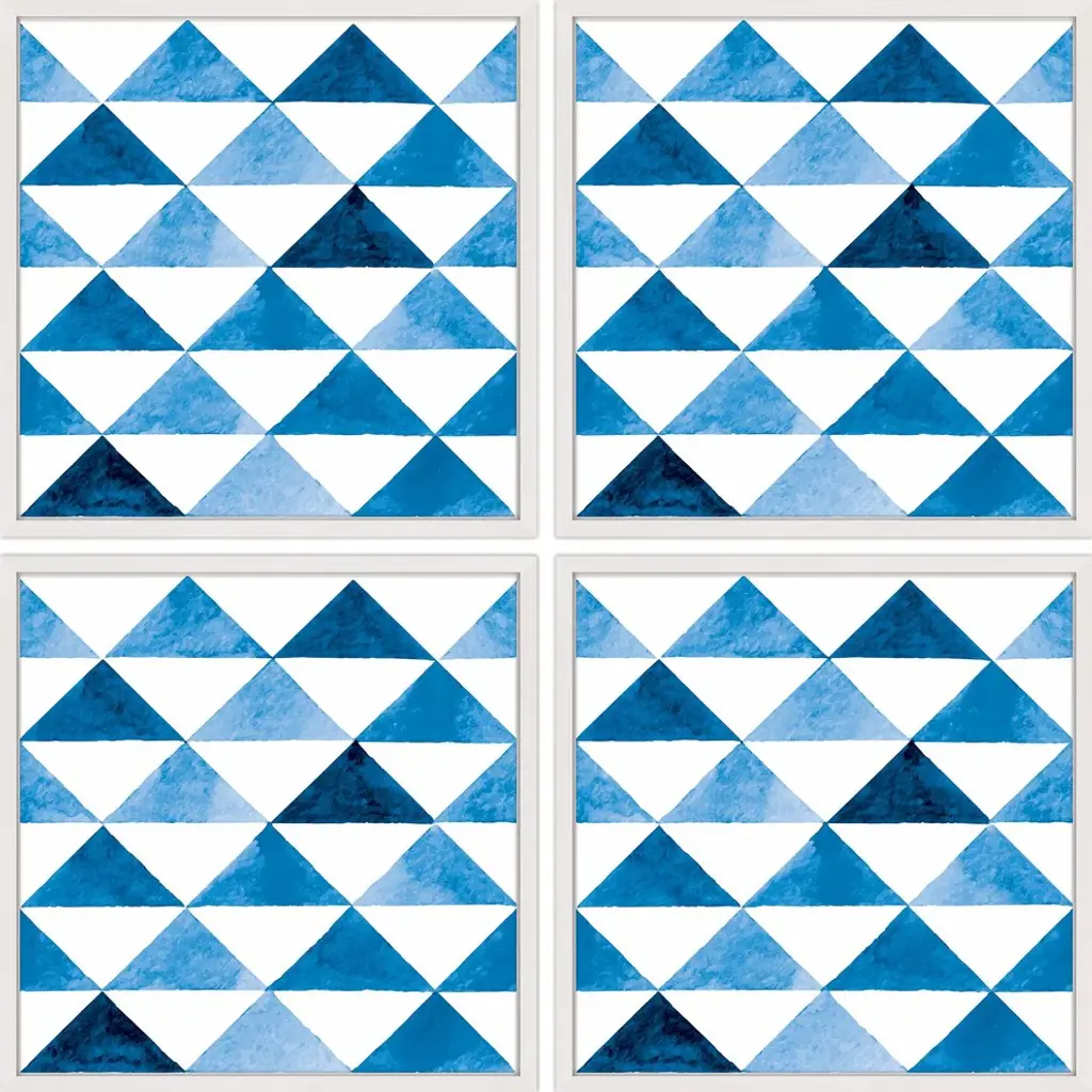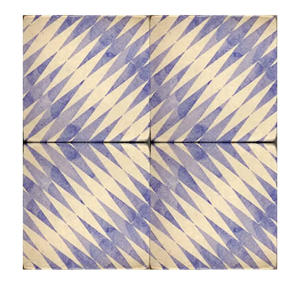 These exquisite tiles represent a perfect blend of revered craftsmanship and modern adaptation that produces decorative objects that enliven and give personality to any environment. The 25 tiles that form this composition (1 sqm) measure 20x20 cm each, and have an elegant tromp d'oeil design of Greek and Roman inspiration. Four geometric shapes in white, blue and light blue color combinations converge at the center for an eye-catching visual effect, adding a dynamic accent to any decor.