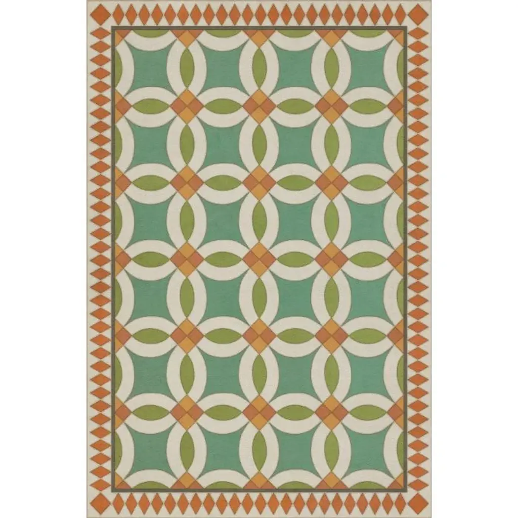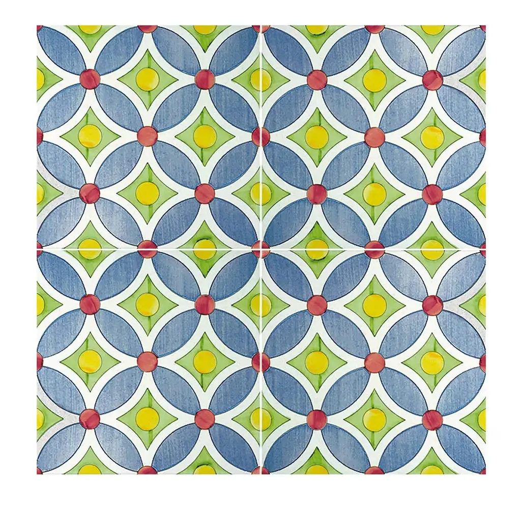 This skillful rendering of overlapping circles reveals a trompe l'oeil design of blue daisies accented by thick white borders.This intricate floral motif rests atop a warm honey-yellow background, mirroring the small yellow circle nested between the flowers and poetically evoking the heat of Neapolitan summers. A remarkable tile composition that comprises 25 tiles, each measuring 20x20 cm (1 sqm), sure to bring new energy into any interior design with its modern flair.