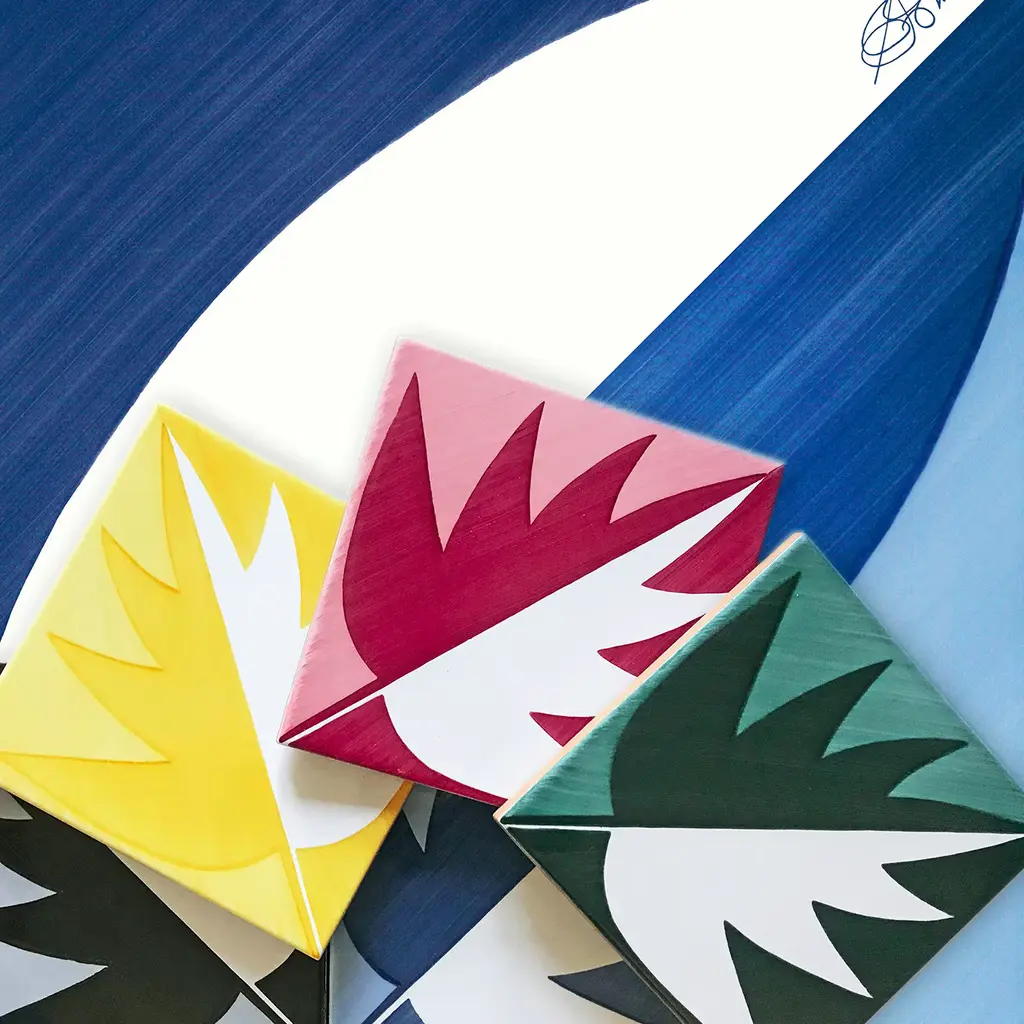 Striking as a decorative panel on a bathroom wall or as flooring in a kitchen, this exceptional set of 25 ceramic tiles from the Blu Ponti di Ceramica will infuse vibrant energy in any decor. Entirely handmade and painted by masterful artisans using ancient techniques, these tiles feature a leaf motif half in white and half in yellow on a canary yellow background. This set is inspired by the blue and white majolica tiles designed by Gio Ponti for the Hotel Parco dei Principi in Sorrento. These tiles will catch and reflect light in captivating ways that will infuse an interior with an inviting ambiance. Each tile measures 20 x 20 cm (1 sqm).