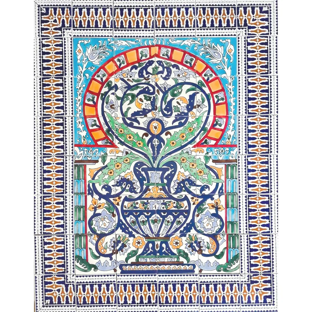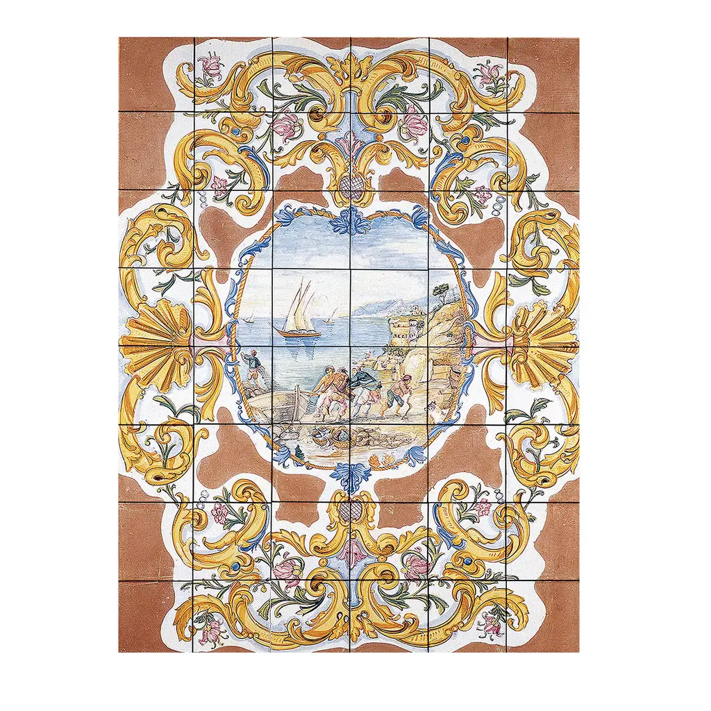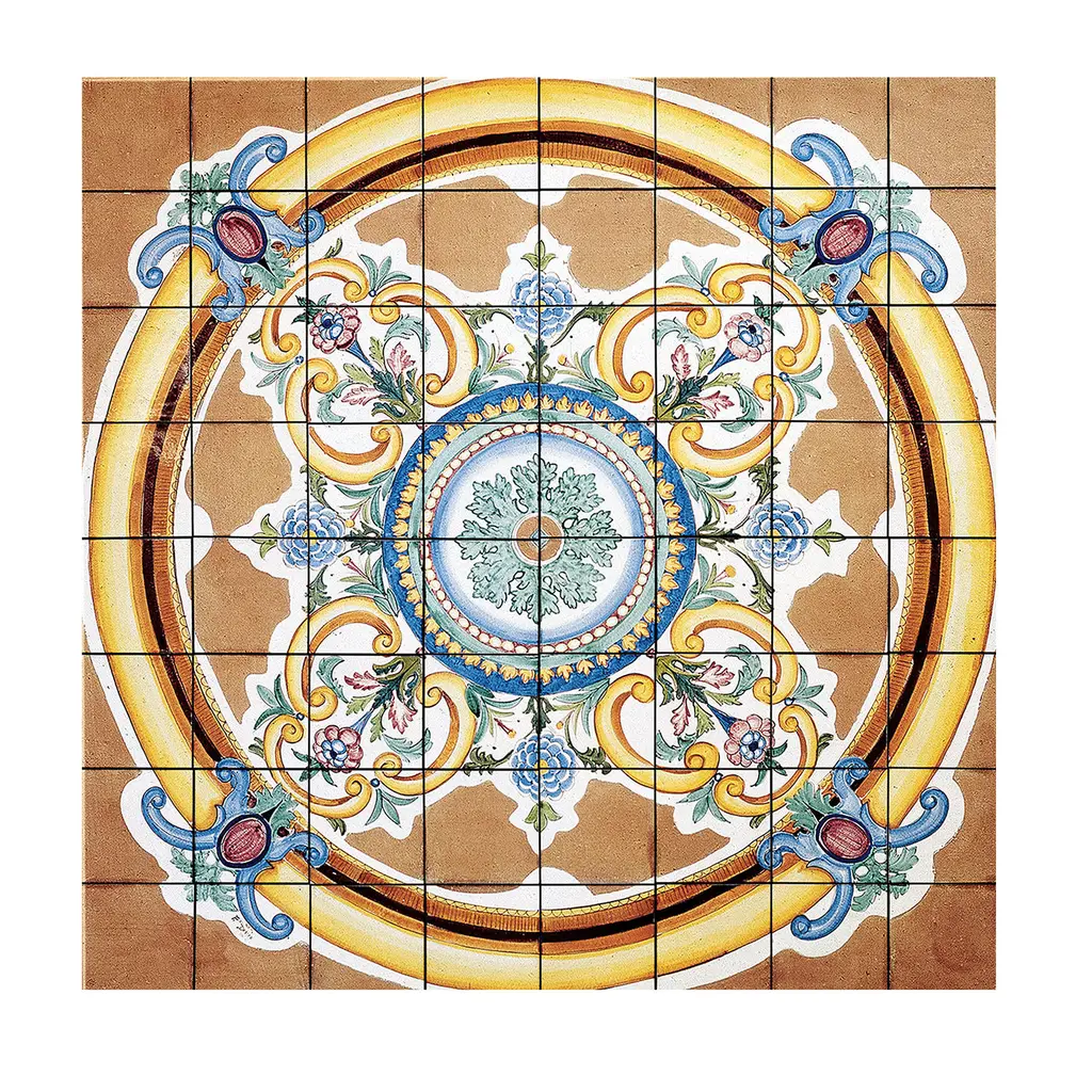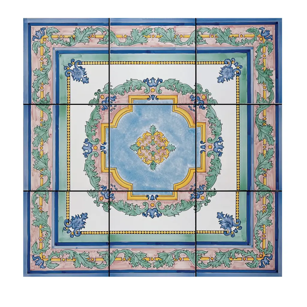 An elaborately designed rose detail, this handmade masterpiece is composed of 48 cotto tiles, each measuring 20 x 20 cm for a total surface of 120x160 cm. The decorations, hand painted on the Bianco Vietri glaze, feature a white oval frame with a blue scalloped rim, surrounding a garland of traditional Neapolitan scroll and floral motifs. This exquisitely ornate garland frames the central element of the composition, a white peony in a sea of colors. De Maio's use of centuries-old processing techniques makes each piece unique and prestigious, reinterpreting past decorative elements with a modern taste.