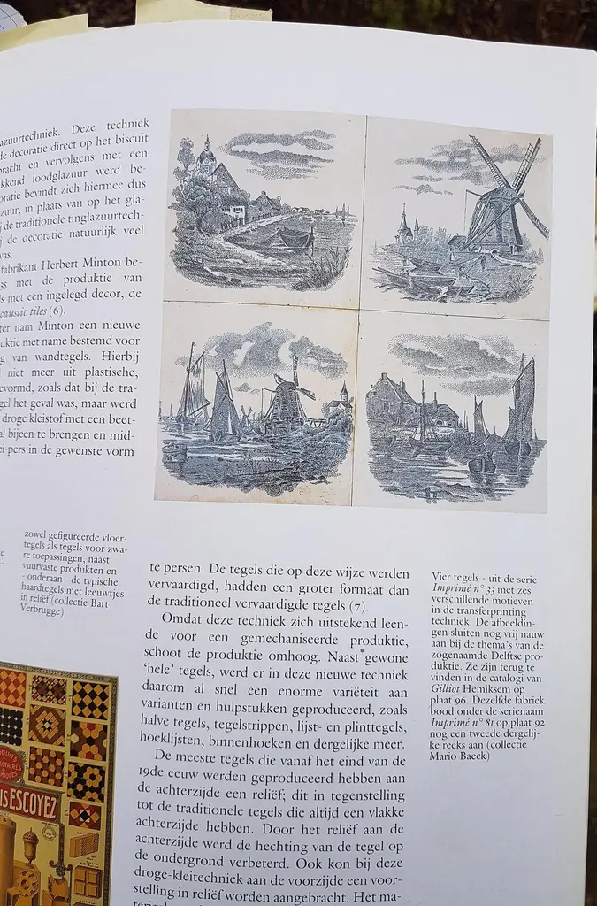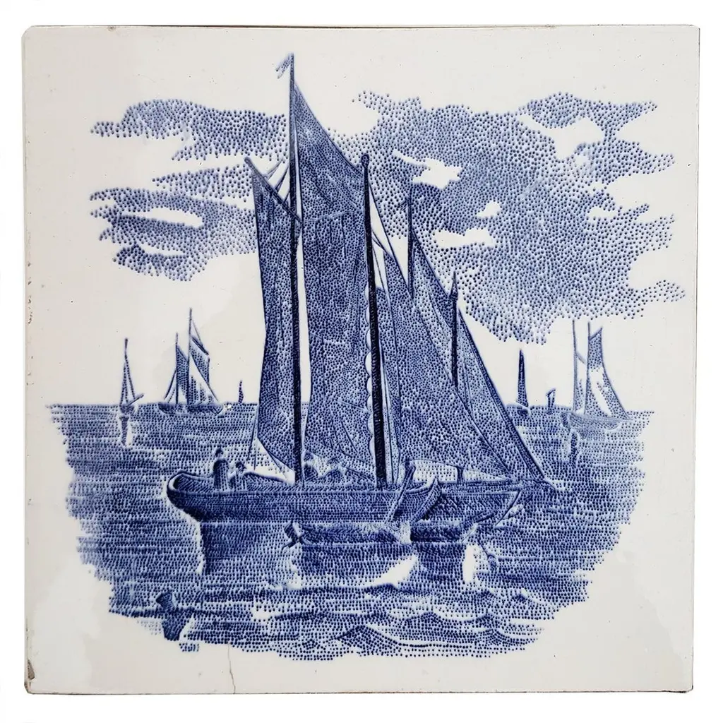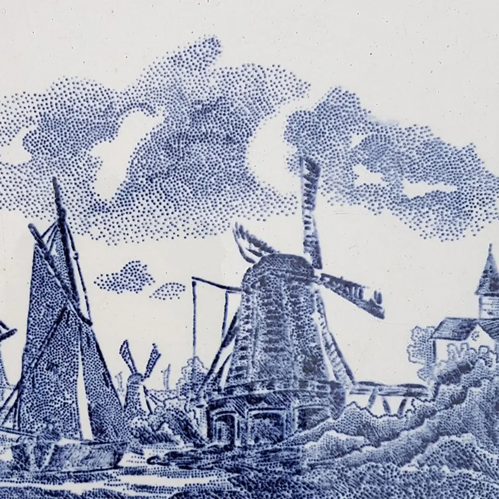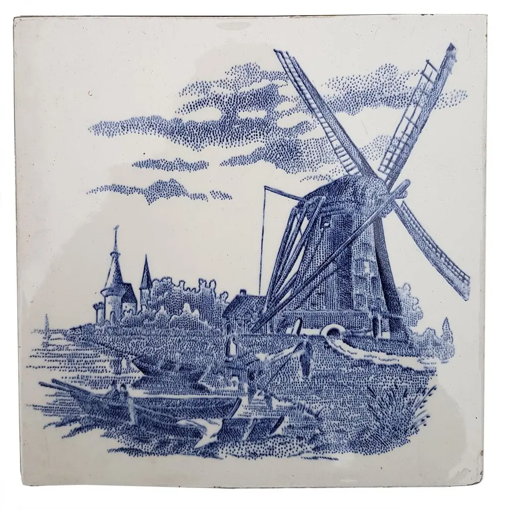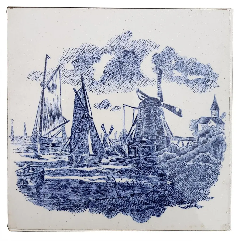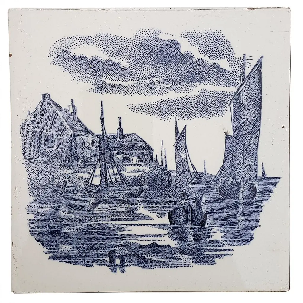 This is an amazing set of Dutch blue handmade ceramic tiles. Manufactured by Gilliot Hemiksen, 1930s. With 6 different stylized designs. We offer 20 tiles from the same design. In total 120 tiles with 6 designs. These tiles would be charming displayed on easels, framed or incorporated into a custom tile design.Please note that the piece is for one set of 6 tiles with different designs. Size each tile: 6 inches (15.2 cm) width x 6 inches (15.2 cm) height x 0.35 inches (0.9 cm) thick. Condition is generally very good. Minor chips, scuffs, color different and wear associated with age. Some crazing to the glaze is part of the design.