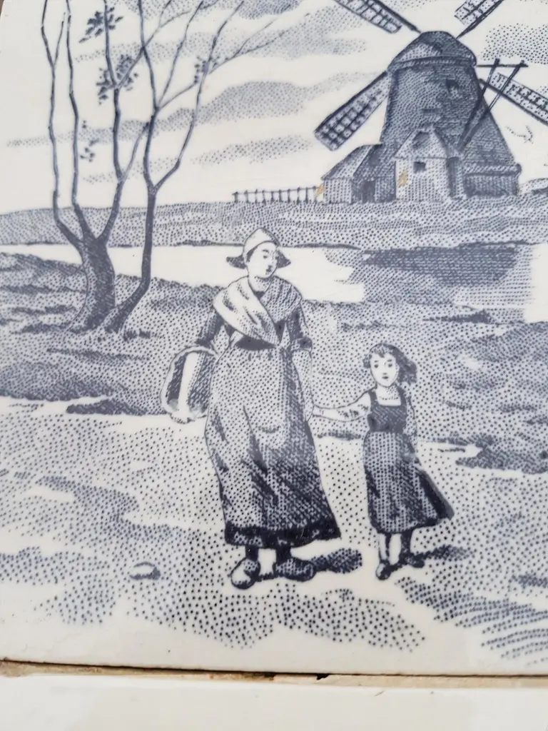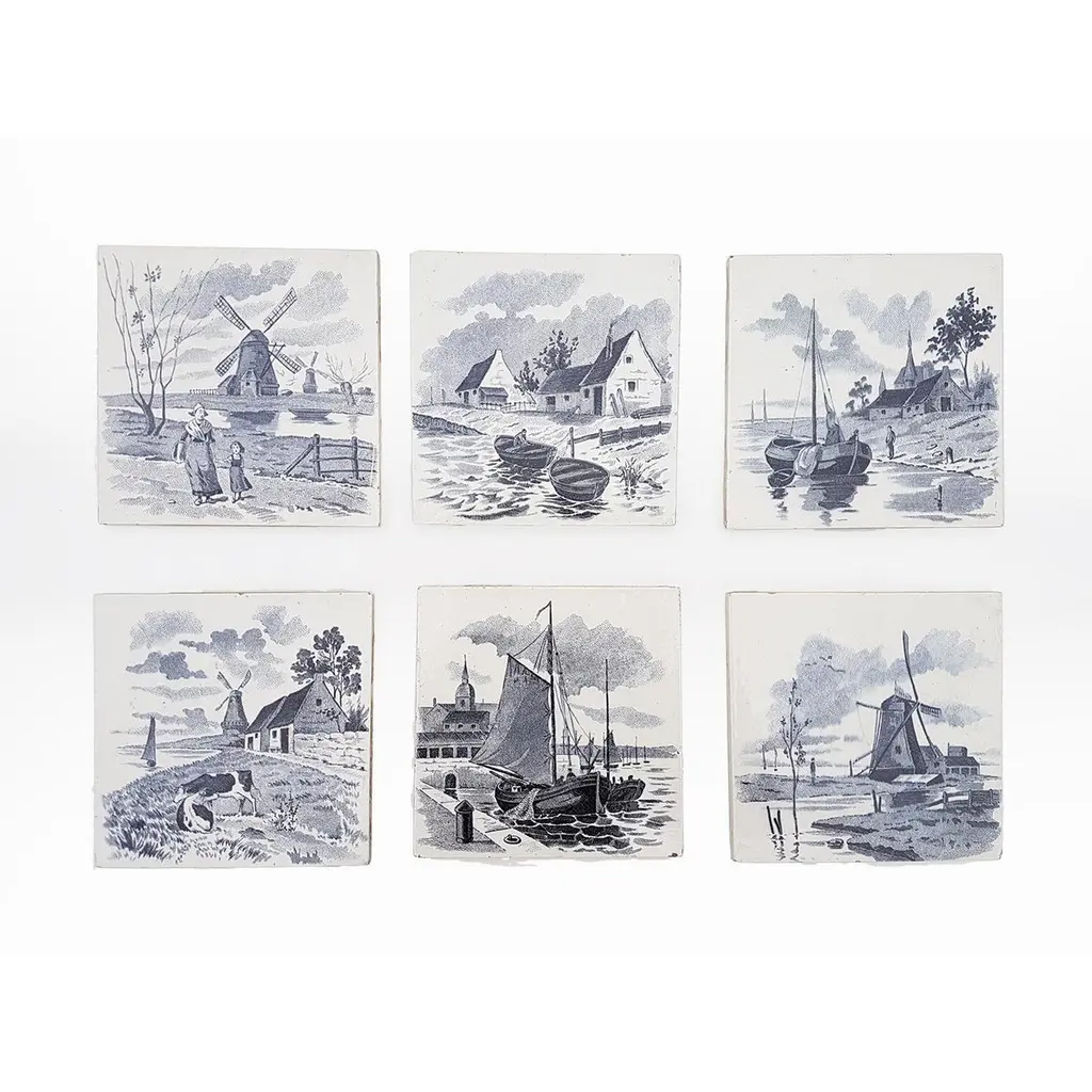 This is an amazing set of Dutch blue handmade tiles. A beautiful and color. With 6 different stylized designs. We offer 20 tiles from the same design. In total 120 tiles with 6 designs. These tiles would be charming displayed on easels, framed or incorporated into a custom tile design.Please note that the piece is for one set of 6 tiles with different designs.Size each tile: 5.9 inches (15.1 cm) width x 5.9 inches (15.1 cm) height x 0.35 inches (0.9 cm) thick.Condition is generally very good. Minor chips, scuffs, color difference and wear associated with age. Some crazing to the glaze is part of the design.There can be slight variations in each tile's size because of their age and craftsmanship.