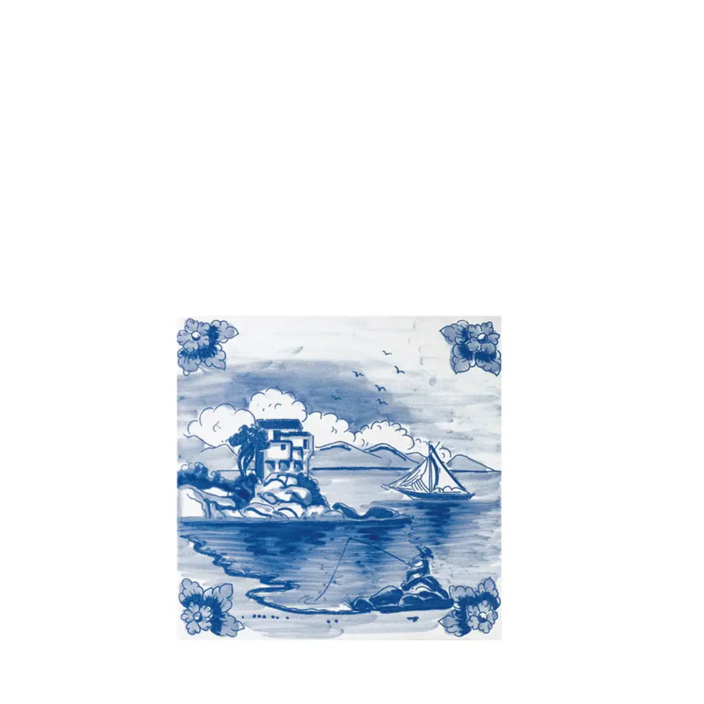 This stately panel of 6 tiles, each measuring 20x20 cm, for a total surface of 60 x 40 cm, features a traditional maritime landscape with a lone fisherman longingly gazing in the distance at a sailboat and house overlooking a rocky inlet. The use of only blue and white in this composition draws attention to the subject matter and enhances the elegant craftsmanship. Ornate pieces such as this can be found in the tiling of noble dwellings throughout the Amalfi Coast. This exquisite tile composition will bring the sophisticated allure of the centuries-old Vietri tradition into your home.