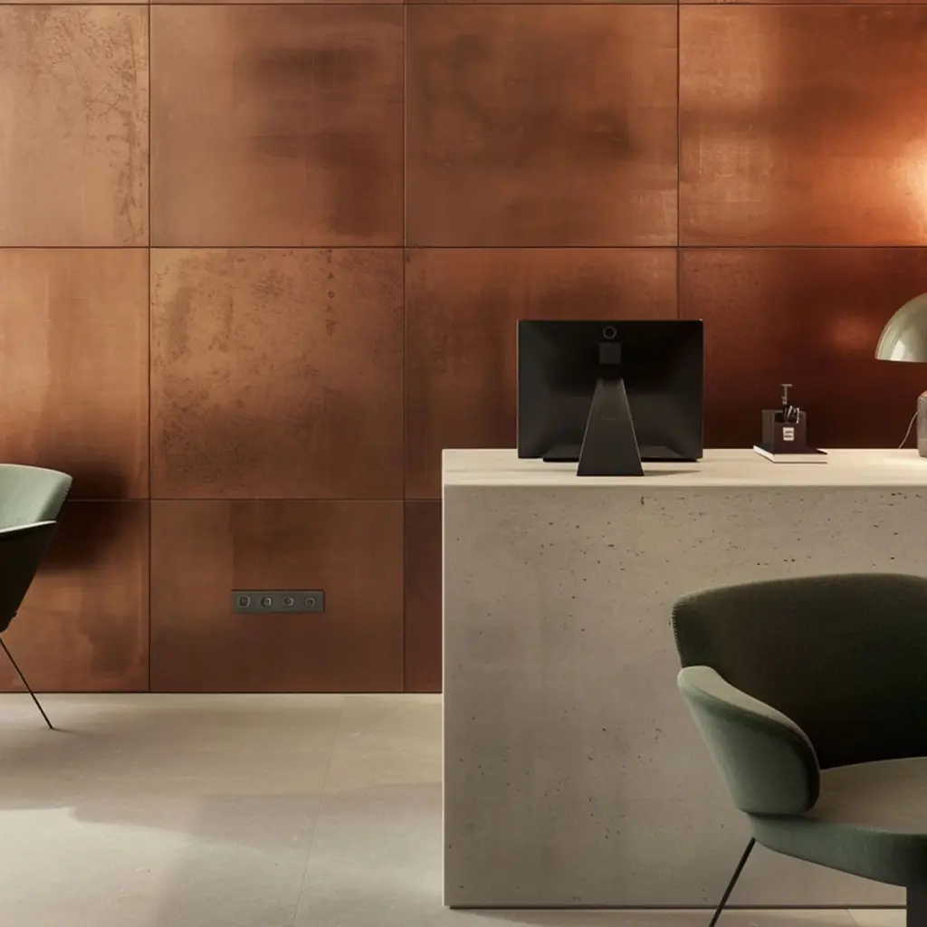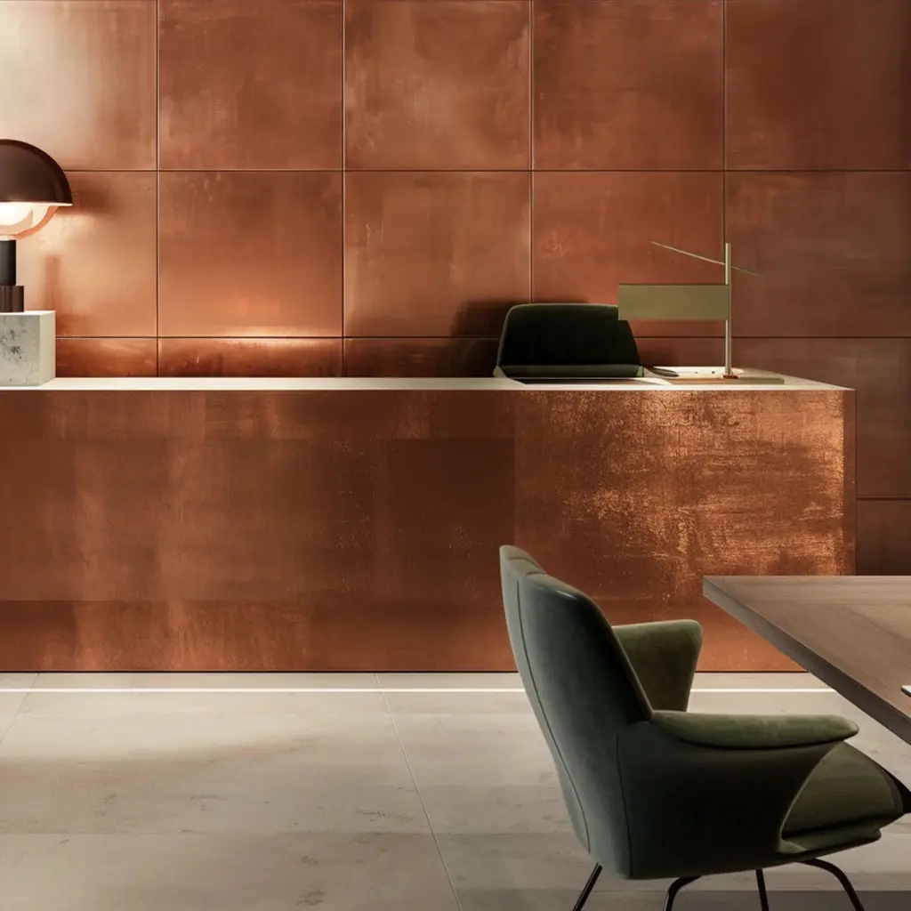 The warm sheen of copper meets the contemporary refinement of an air brush effect in this exclusive set of four metallic tiles. Part of the MetalSkin Collection, the set owes its inherent uniqueness and luxury to the careful artisan crafting process carried out by master artisans. More size options are available, please contact the Concierge for details. The price listed is for the set of 4 tiles. Product images show the different compositions that can be made. Contact the concierge for more information and details.