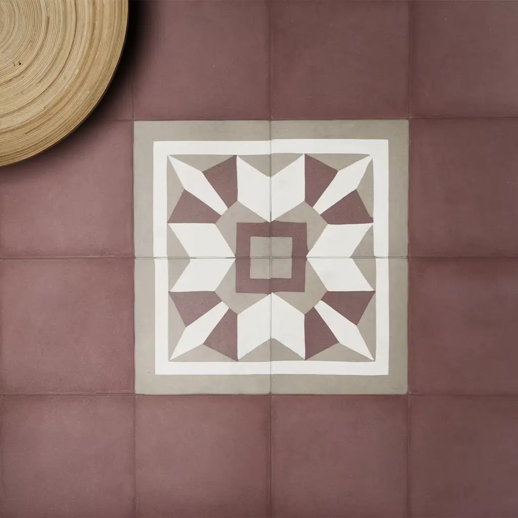 This set of 25 cement tiles is distinguished by a highly versatile geometric pattern, which, when arranged, will create a rustic, floral design that is both dynamic and soothing. The brick-red hue of the background is illuminated by the white tiles also cut in trapezoidal shapes - hence the set's name. Handcrafted in Sicily, it is made of a blend of natural raw materials such as cement, marble sand, and volcanic sand from Mt. Etna.