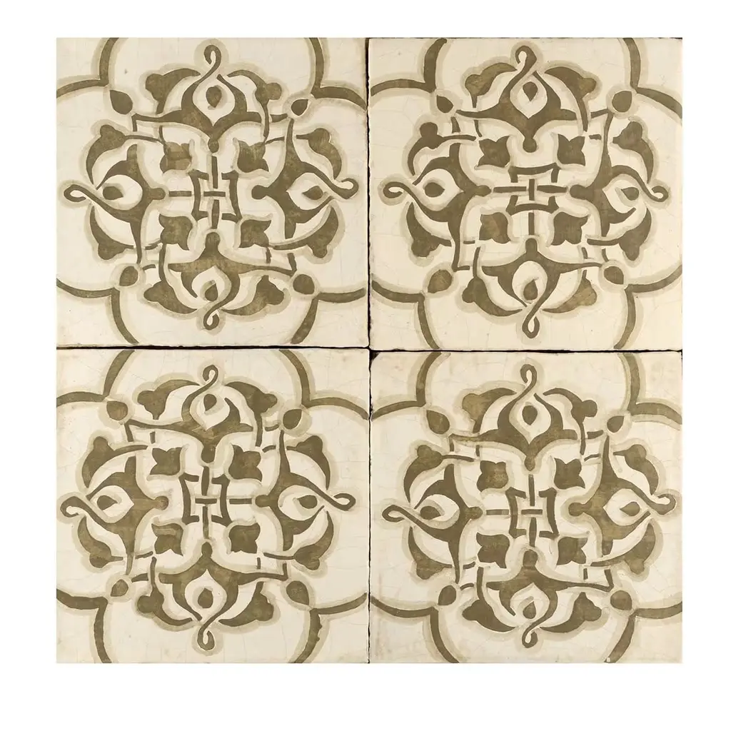 Classic yet versatile, this refined majolica tile will complement any interior decor with their bold colors and intricate forms. This tile has striking circular design with interwoven scroll and frond elements that complement the undulating border. The motifs are hand-painted in a striking moss-green overtop an ivory background, creating a subtle yet dynamic color and textural contrast that completes the piece.
