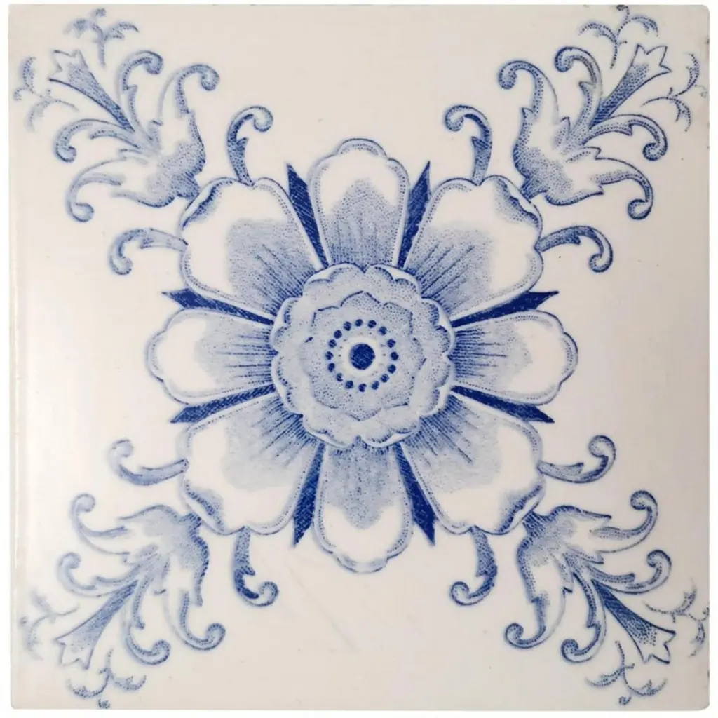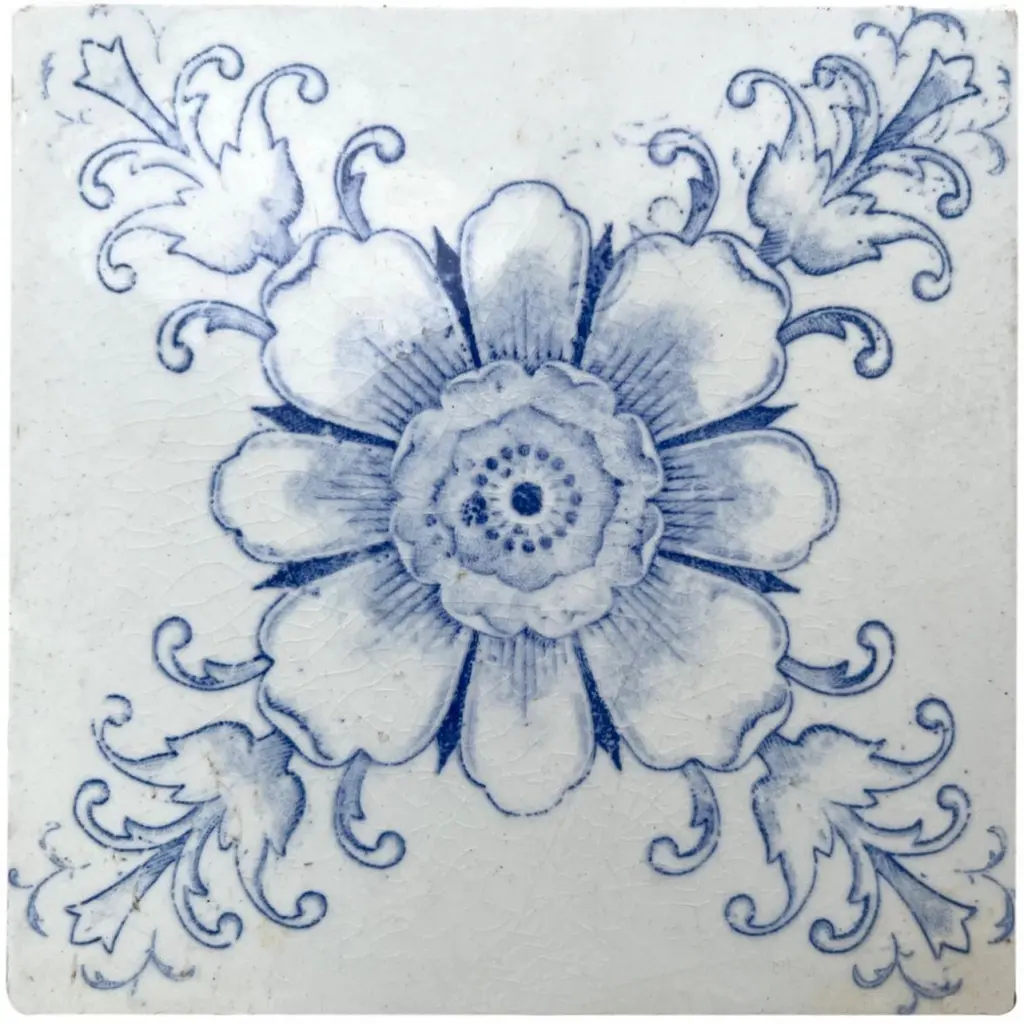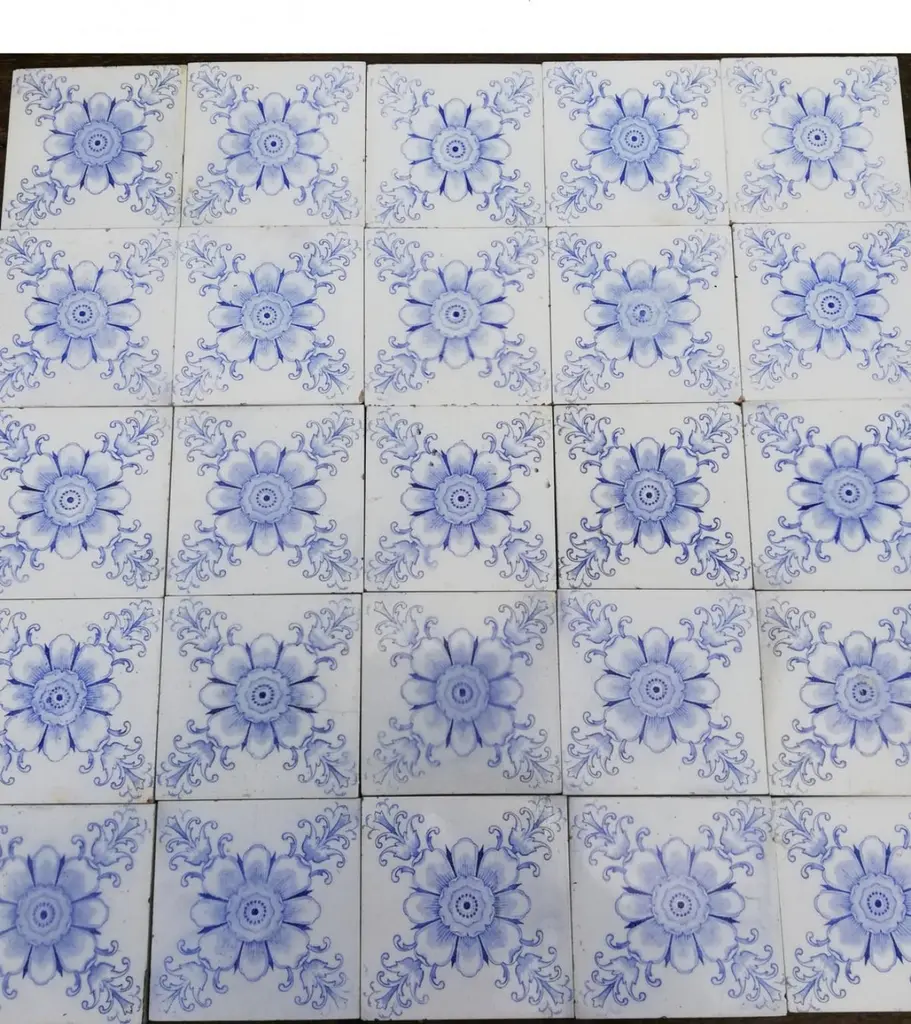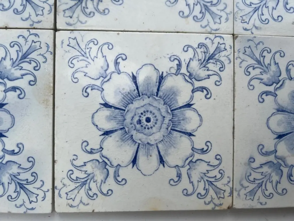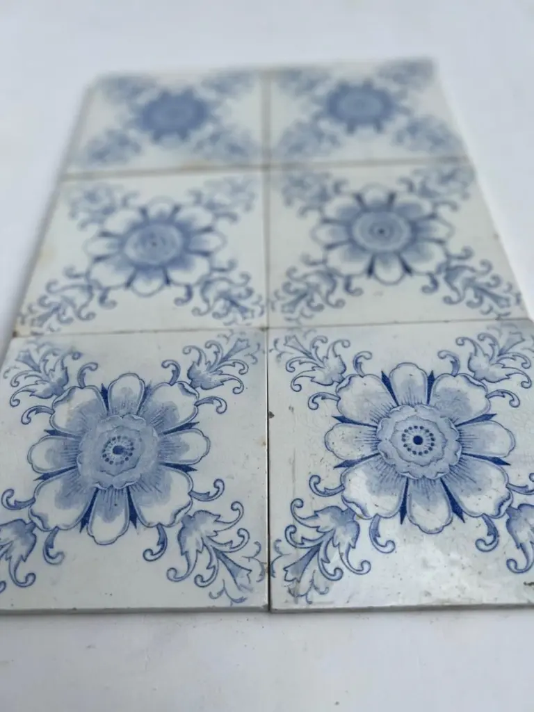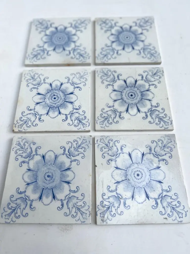 White And Blue Flower Art Deco Glazed Tiles By Le Glaive, 1920